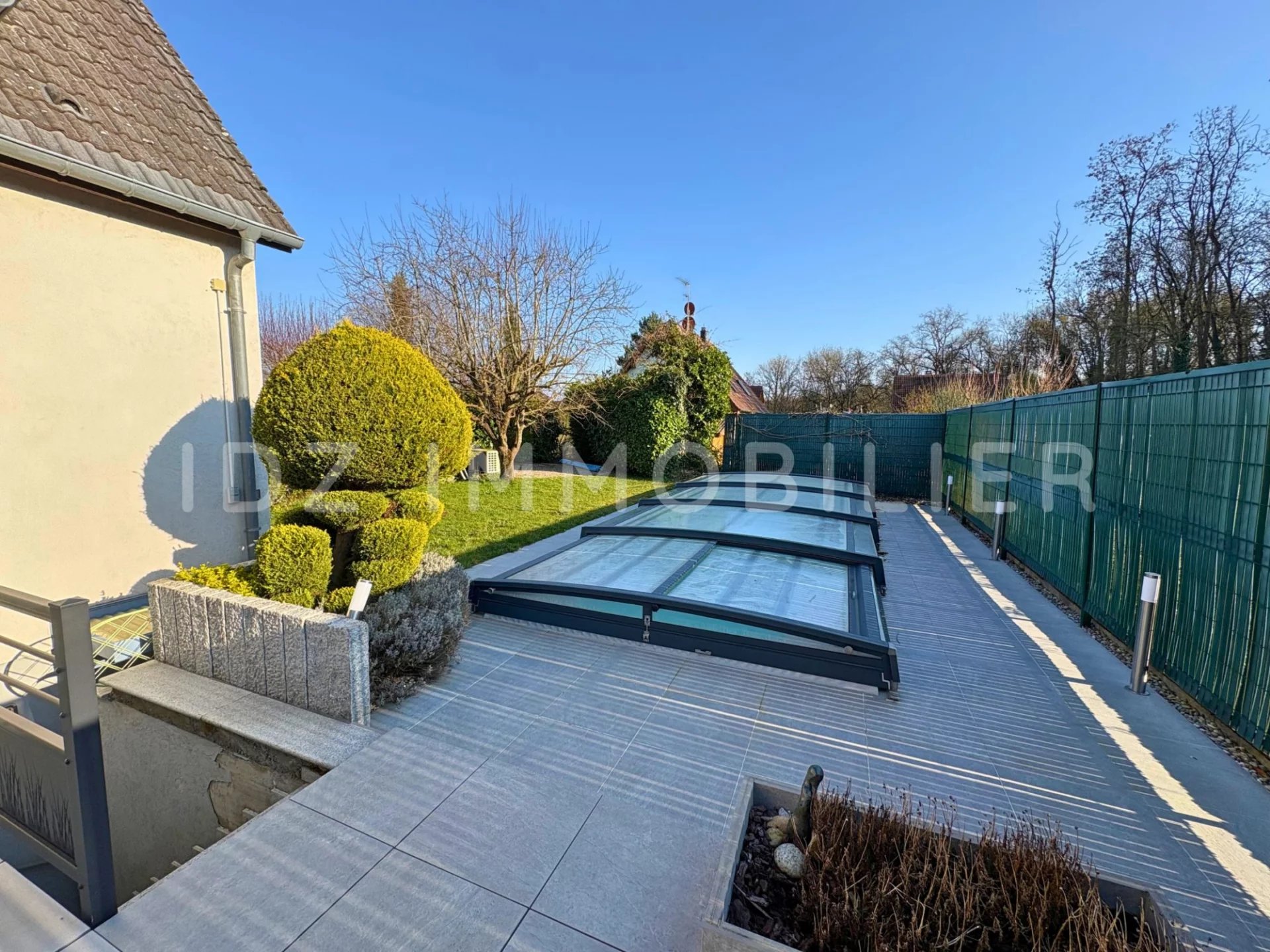 Au rez-de-chaussée, vous accéderez, depuis la salle à manger, à la terrasse de 40 m² entièrement refaite au courant de l'été 2025, qui donne elle-même accès à la piscine, à l'abri des regards. La piscine mesure 8 m sur 3 m.