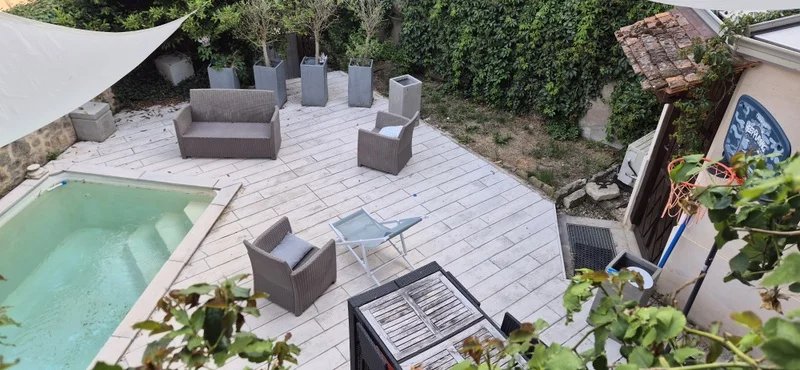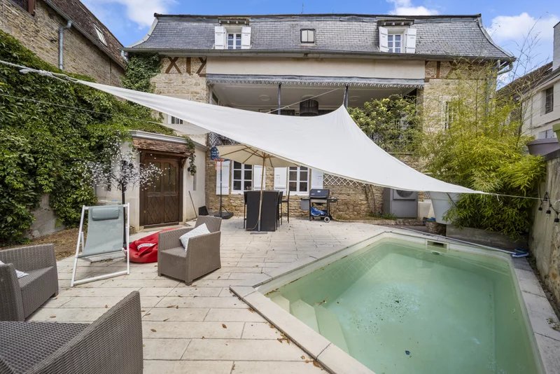 Une belle propriété en pierre en coeur de village composée d’une demeure principale 300 m² environ – 6 chambres + 3 salles de bains + salle de jeux –, grenier à la suite, sous-sol complet, garage 2 voitures, cave à vin climatisée, piscine 10 m², cour close de murs, le tout sur 360 m² environ.