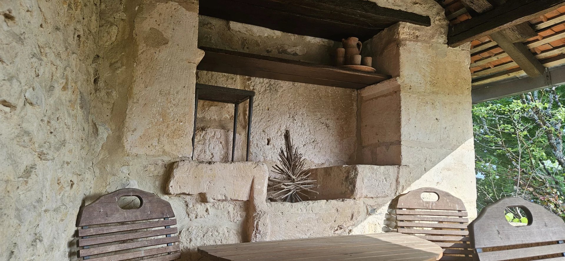 Cette propriété se compose au rez-de-chaussée d'une salle à manger, d'un salon chaleureux en pierres avec cheminée, plein d'authenticité, d'une spacieuse cuisine équipée et fermée, ainsi que d'un WC séparé sous la belle terrasse couverte.