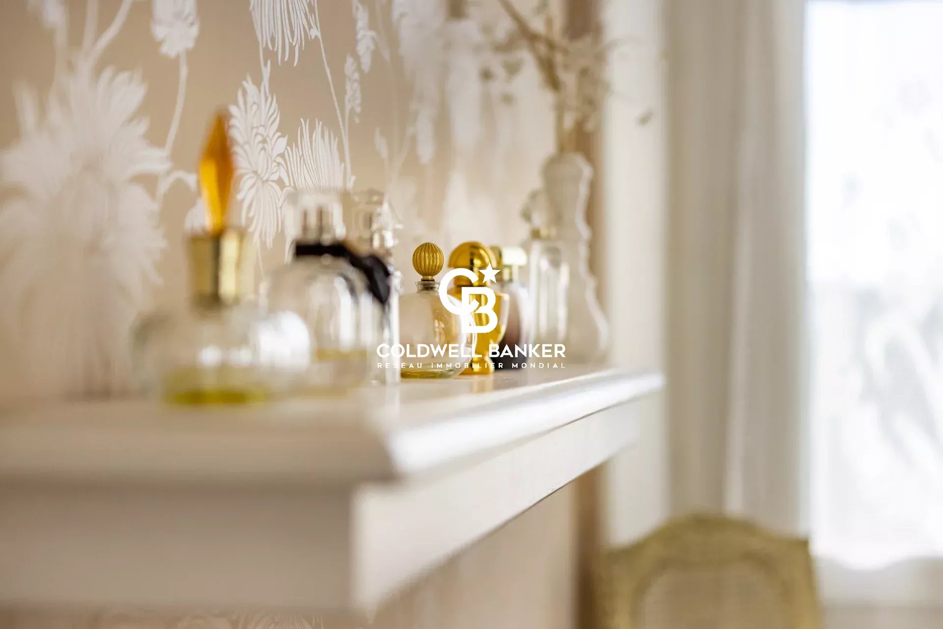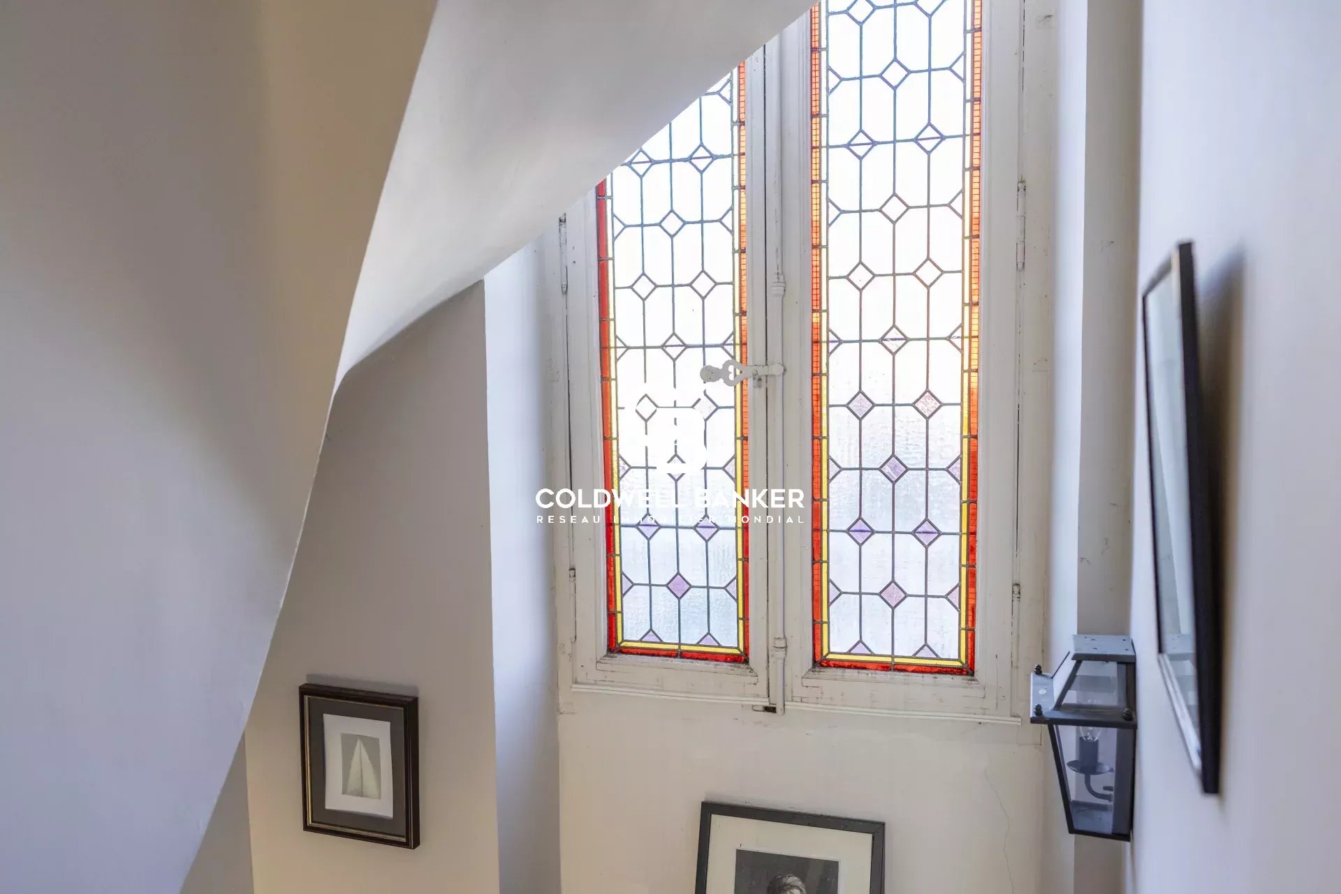Il comprend : un hall d'entrée desservant à gauche un premier petit salon avec cheminée en marbre (fonctionnelle), un bureau, un wc avec lave-mains, une cuisine aménagée et équipée avec accès au jardin, une buanderie/arrière-cuisine. A droite du hall d'entrée : un salon avec boudoir (dans une tourelle), une salle à manger aspectant le magnifique jardin fleuri et son orangerie. Un bel escalier avec vitrail mène au palier du premier étage et ses 4 belles chambres avec point d'eau et/ou salle de bains, un cabinet d'aisance.