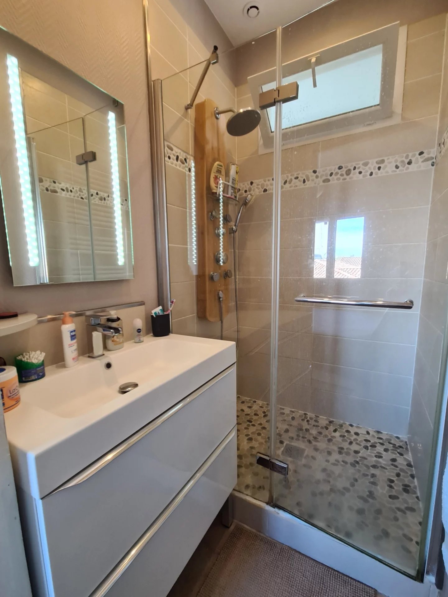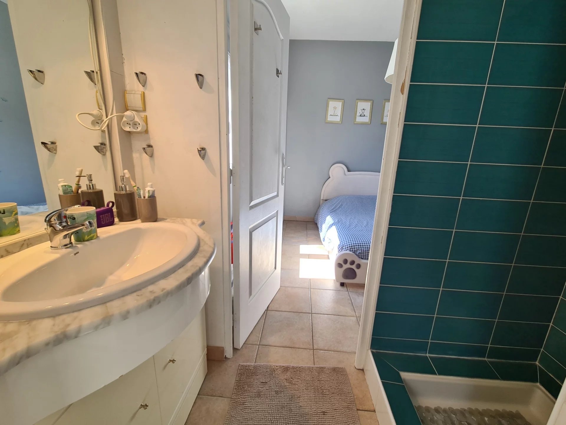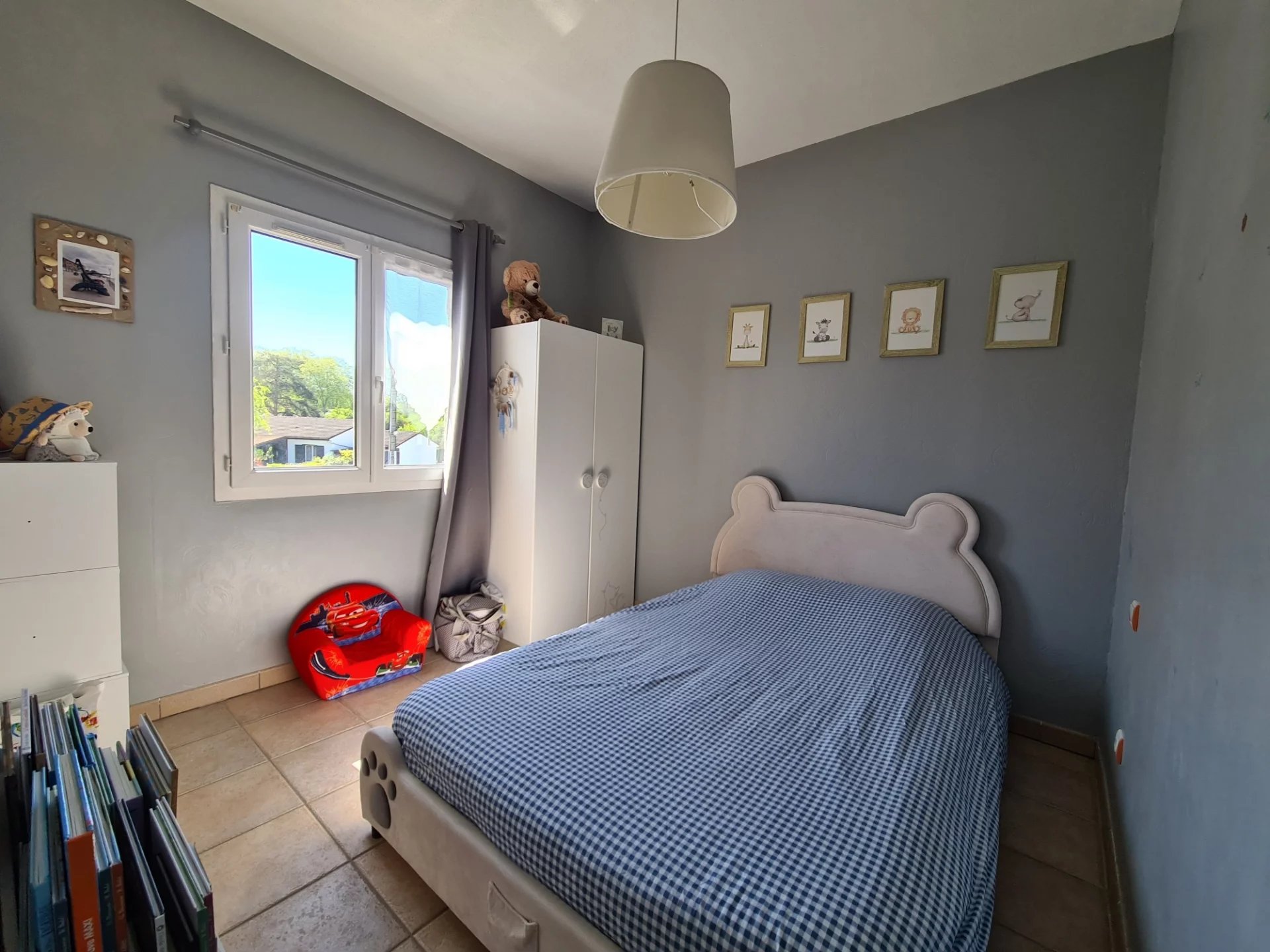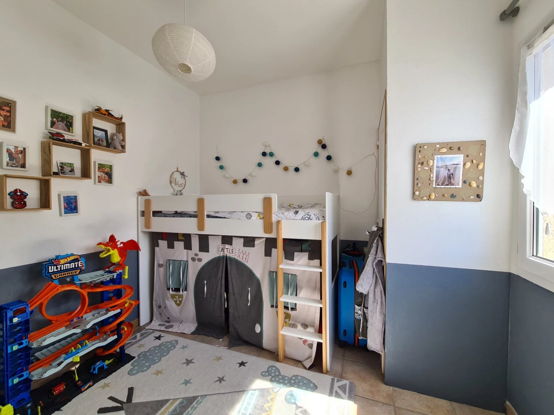 À l'étage, trois chambres, dont une parentale de 12 m2 avec salle d'eau, les 2 autres sont séparés par une salle d'eau pour un côté très pratique et fonctionnel.