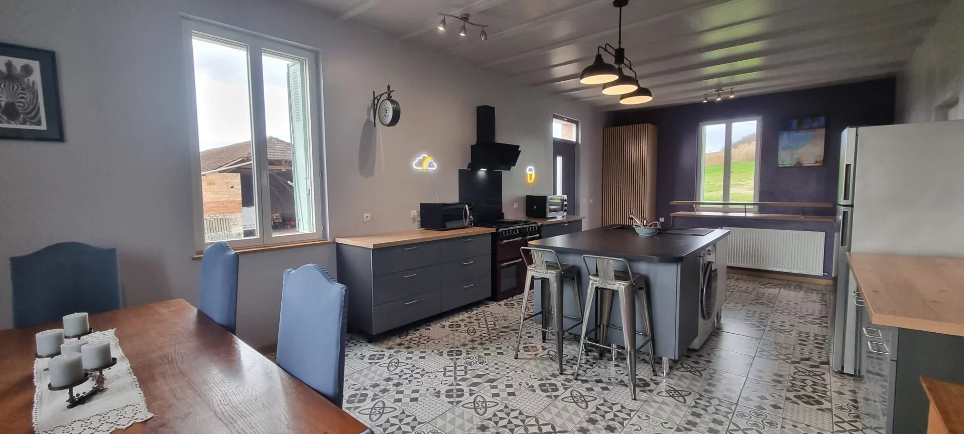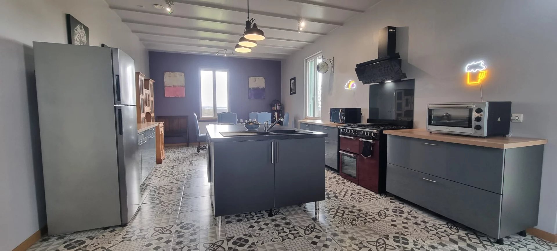 Son cœur est une superbe cuisine / salle à manger de 45 m², lumineuse et conviviale, pensée pour les longs repas et les moments partagés. Un salon d’hiver chaleureux permet de se retrouver au coin du feu, tandis qu’une chambre et une salle d’eau au rez-de-chaussée offrent une vraie souplesse de vie au quotidien.
