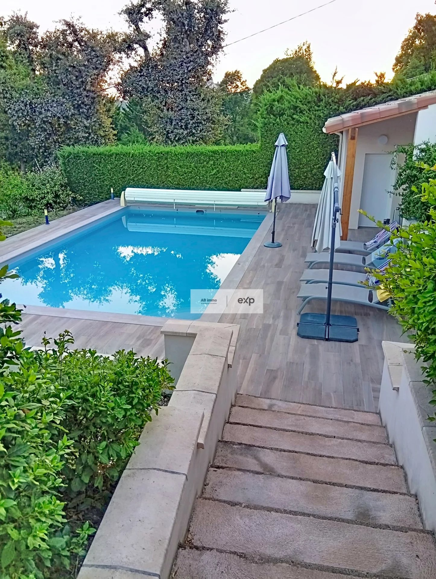 À l’extérieur, le terrain de 6 290 m² est partiellement arboré et agrémenté d’une piscine Desjoyaux 9 × 5 m au sel (2020), d’un pool house et d’une vaste aire de stationnement en castine.