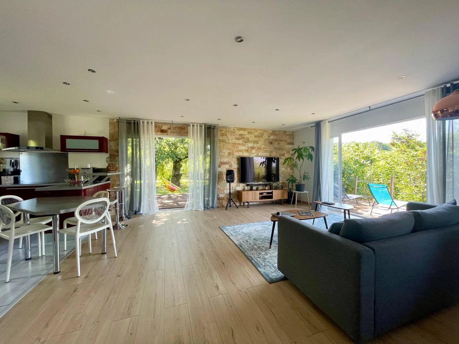 Cette maison est composée d'une entrée donnant sur un séjour lumineux suivi d'une cuisine ouverte aménagée équipée et d'un cellier.