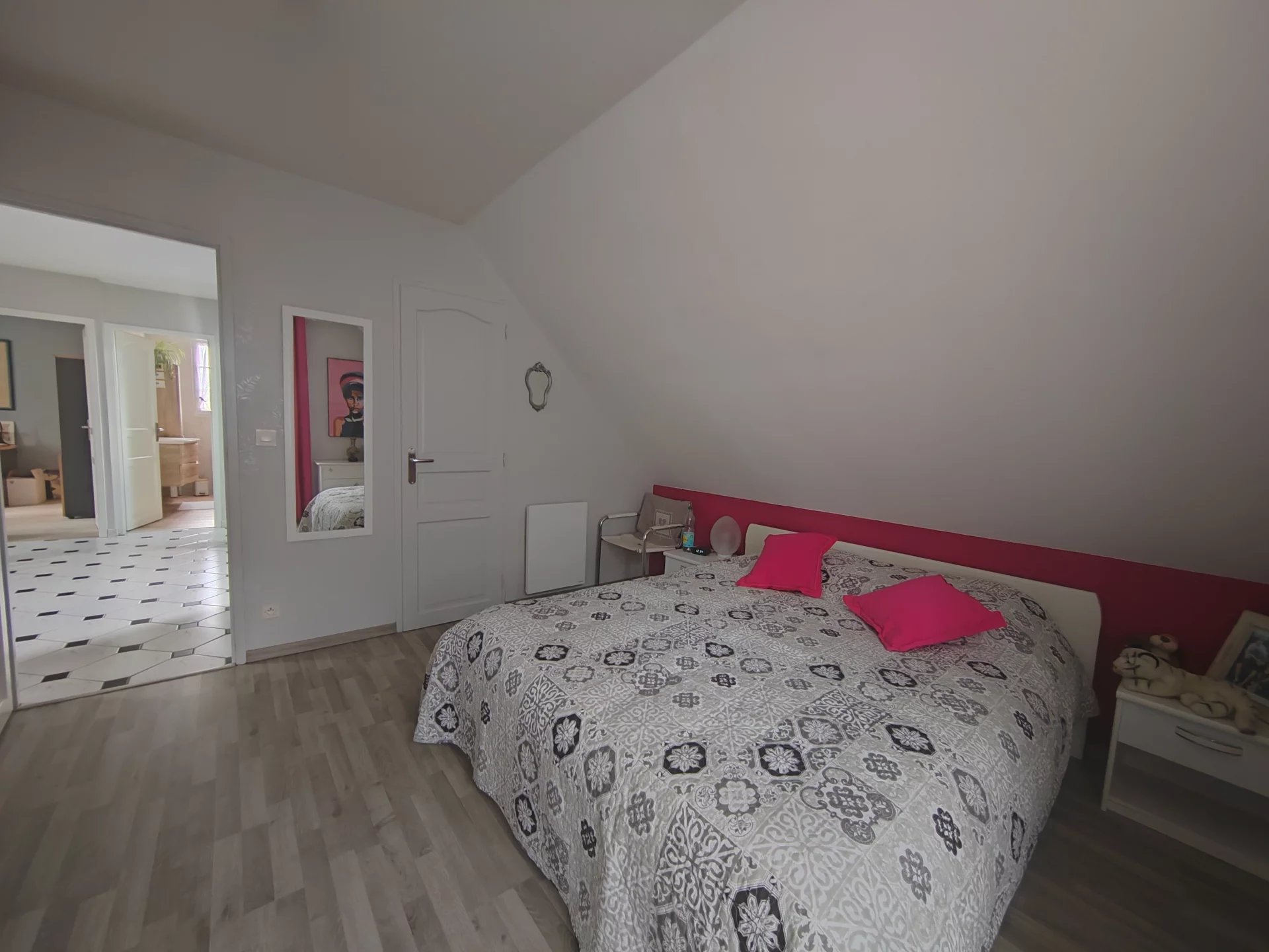 À l’étage, un palier dessert trois grandes chambres avec rangements, une deuxième salle d’eau et un autre WC.