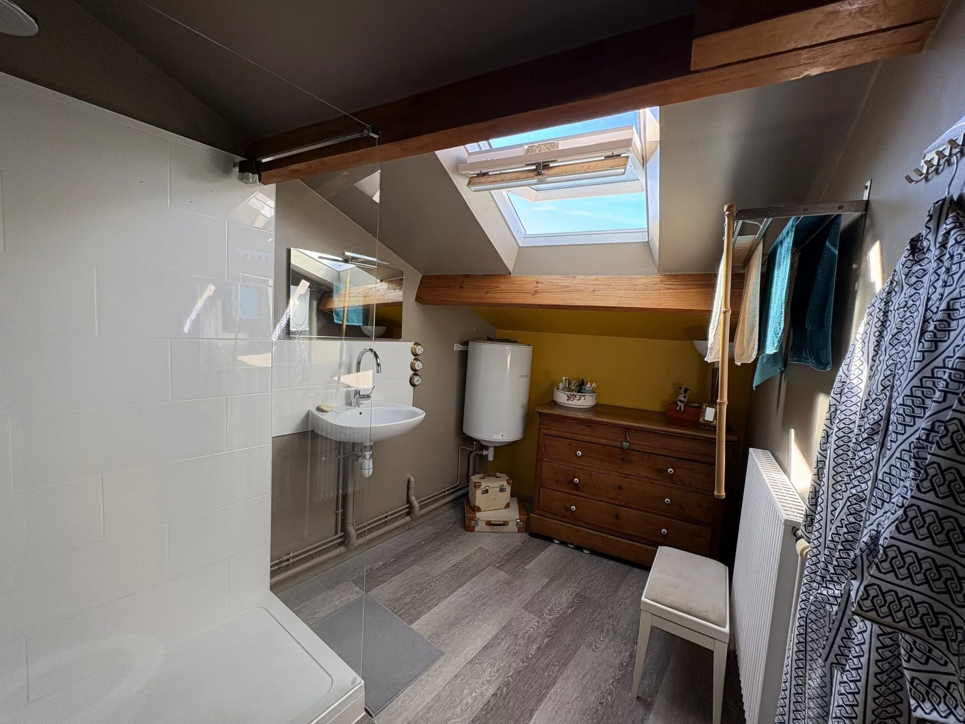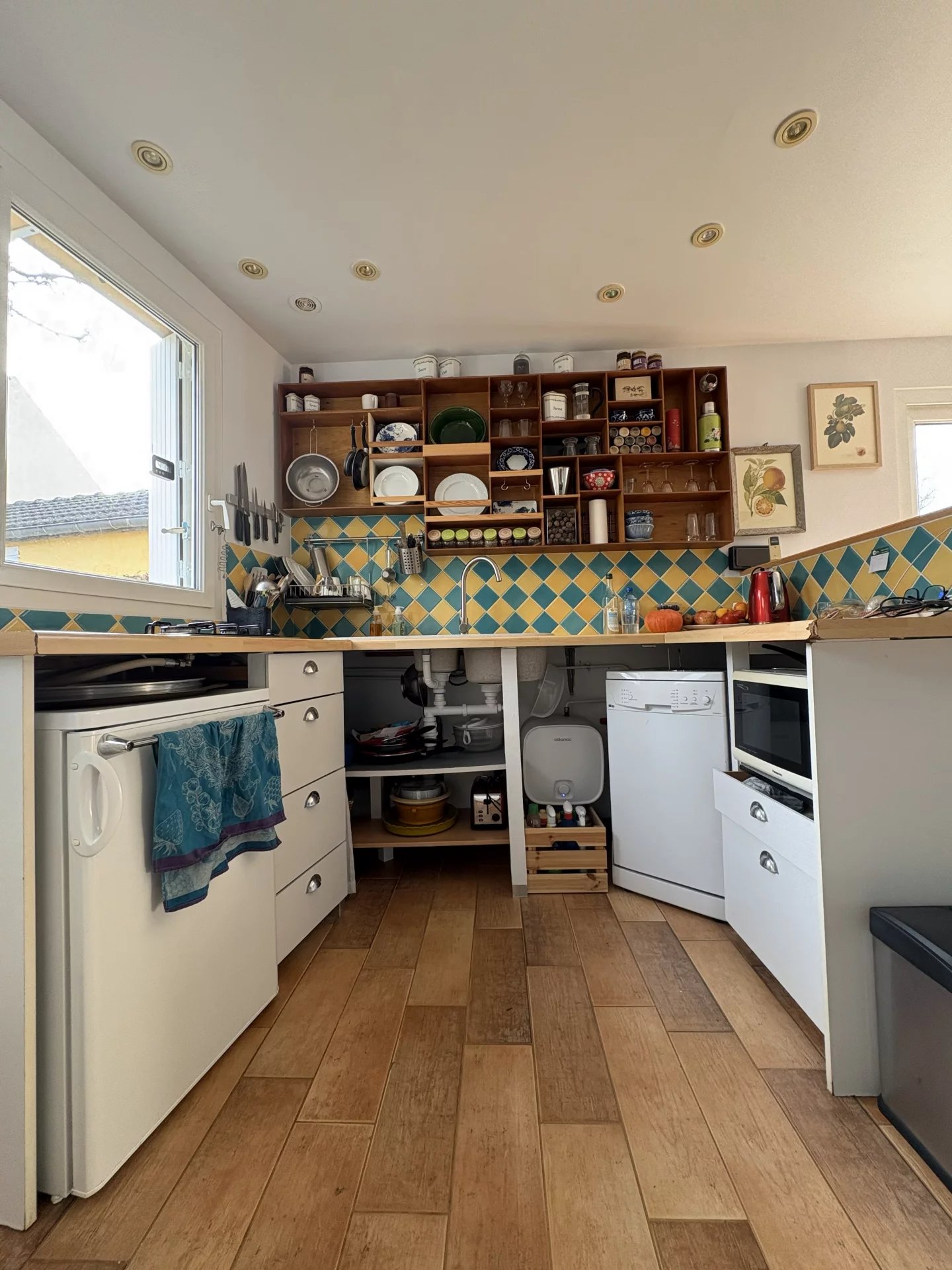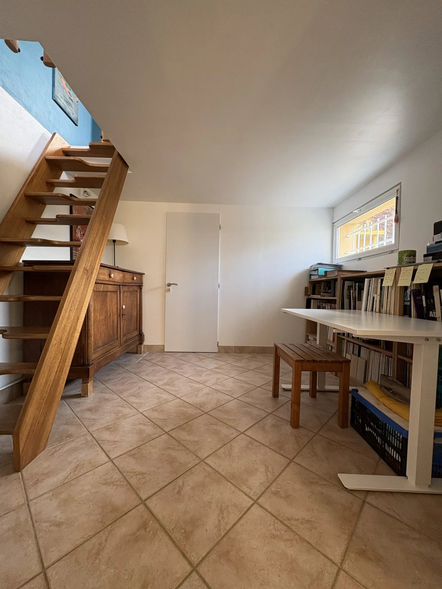 Maison à usage d'habitation comprenant au rez-de-chaussée : entrée sur cuisine ouverte aménagée équipée et placard, séjour avec cheminée insert. A l'étage : palier desservant chambre avec mezzanine à usage de rangement et salle d'eau - toilettes. En rez-de-jardin : bureau, bibliothèque (chambre possible), toilettes avec lavabo espace buanderie et chaudière. Atelier, bucher et dépendance. Jardin clos et deux places de stationnement.