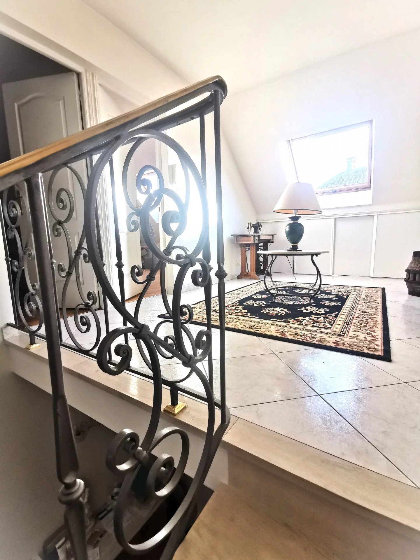 Accès à l'étage par un bel escalier desservant sur une mezzanine lumineuse avec rangement, 3 belles chambres et une salle de bain avec placard, double vasque et toilettes.
