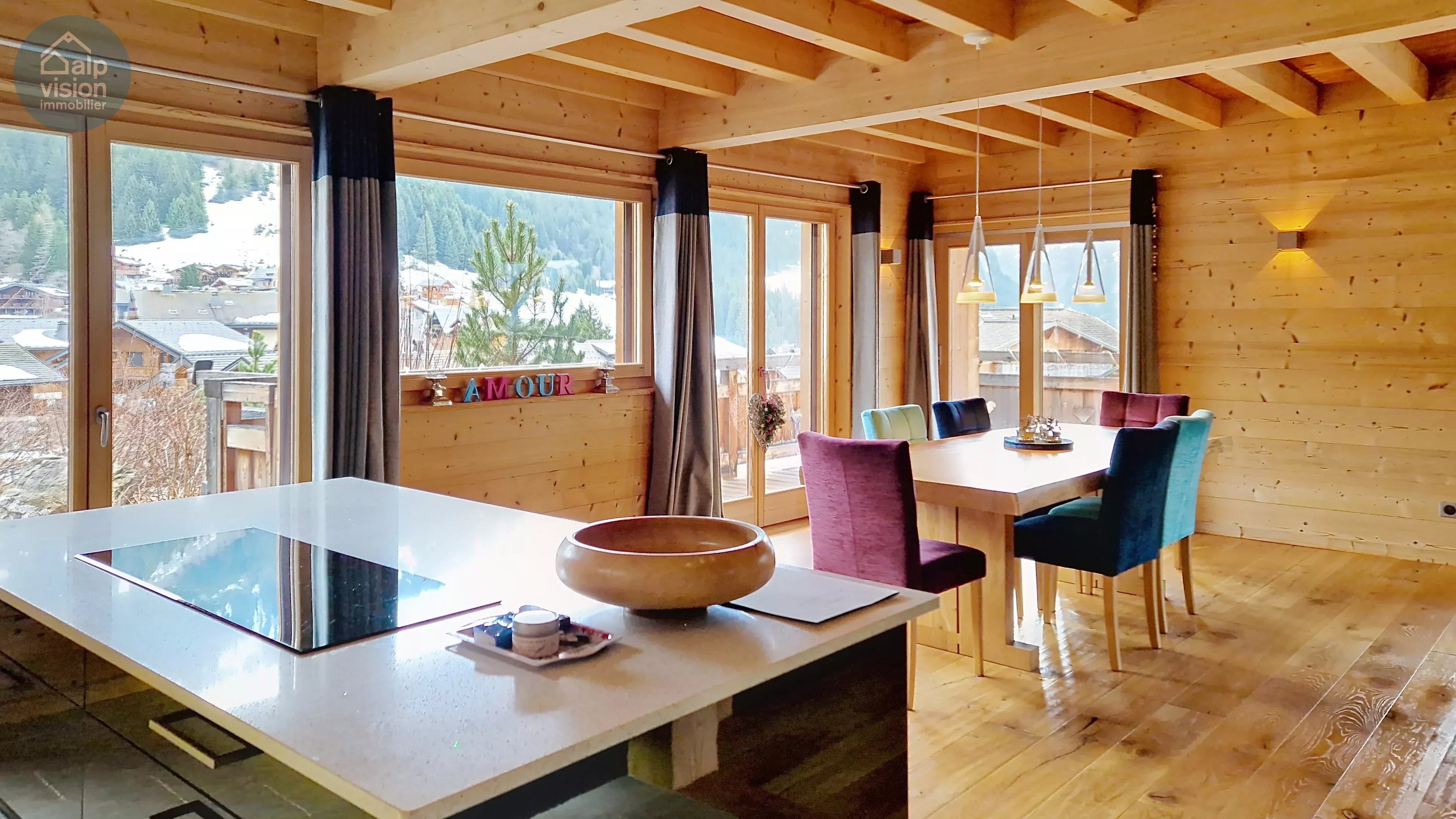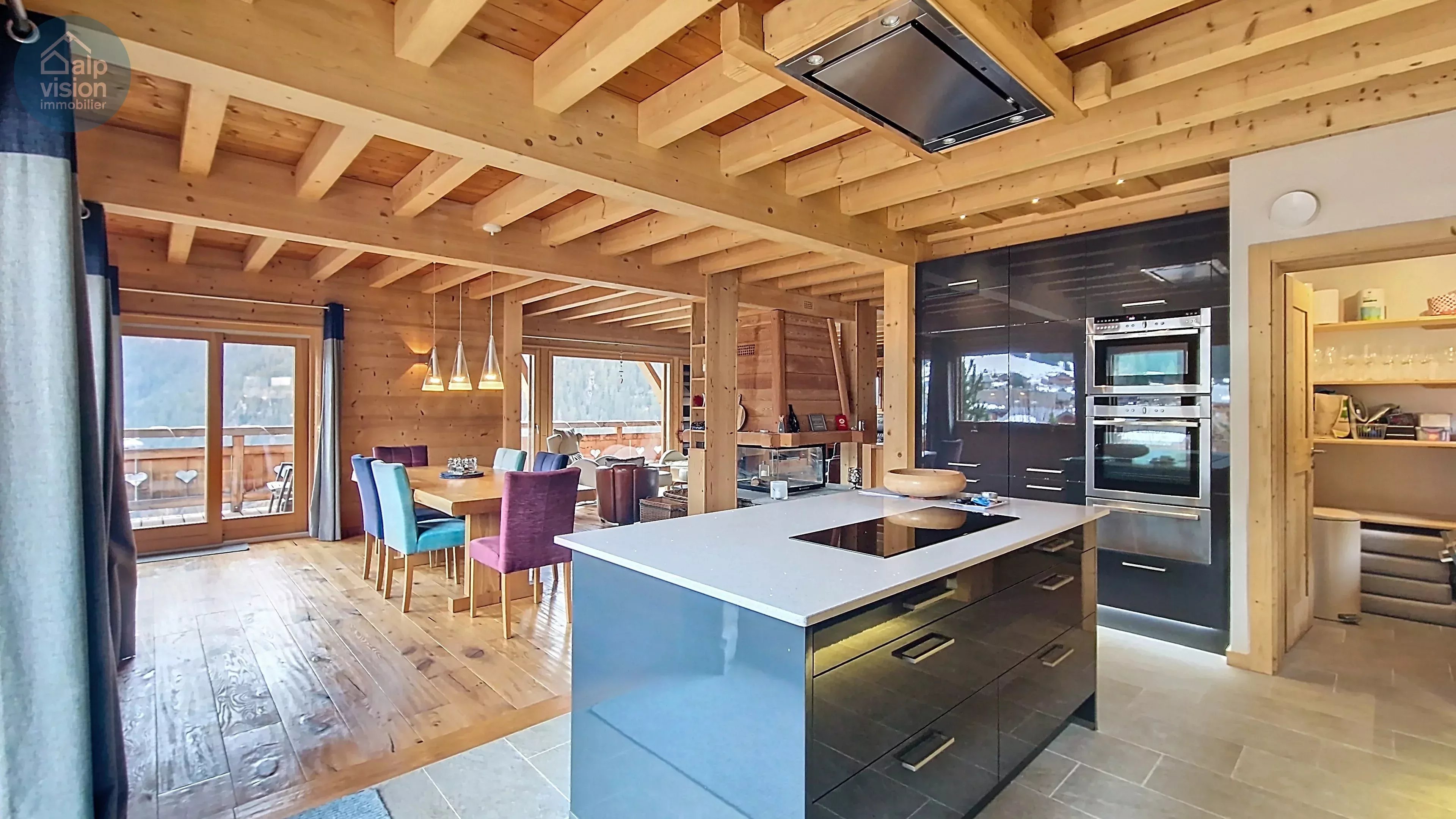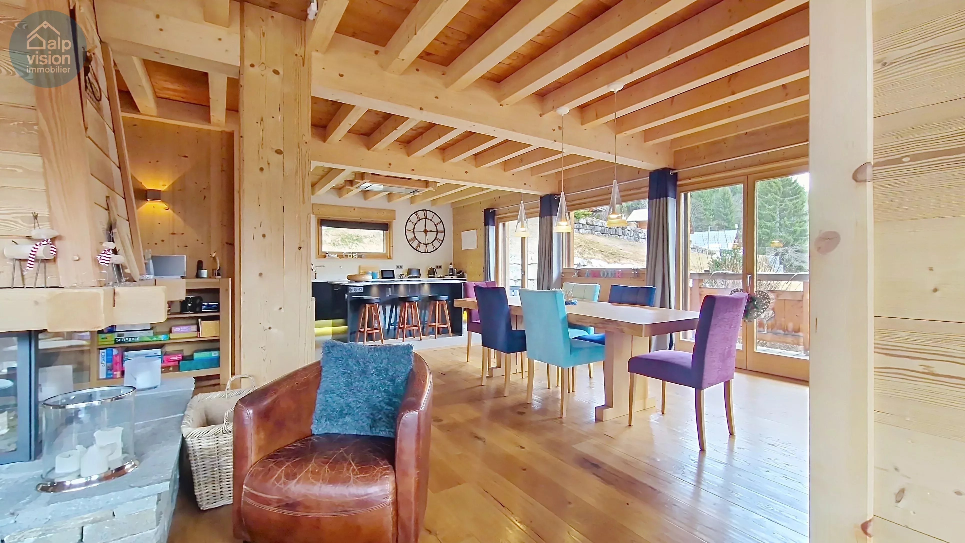 - un séjour convivial de 80 m² avec une cheminée centrale et une cuisine ouverte chaleureuse