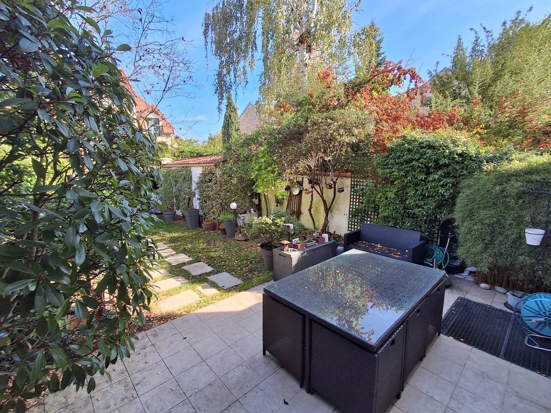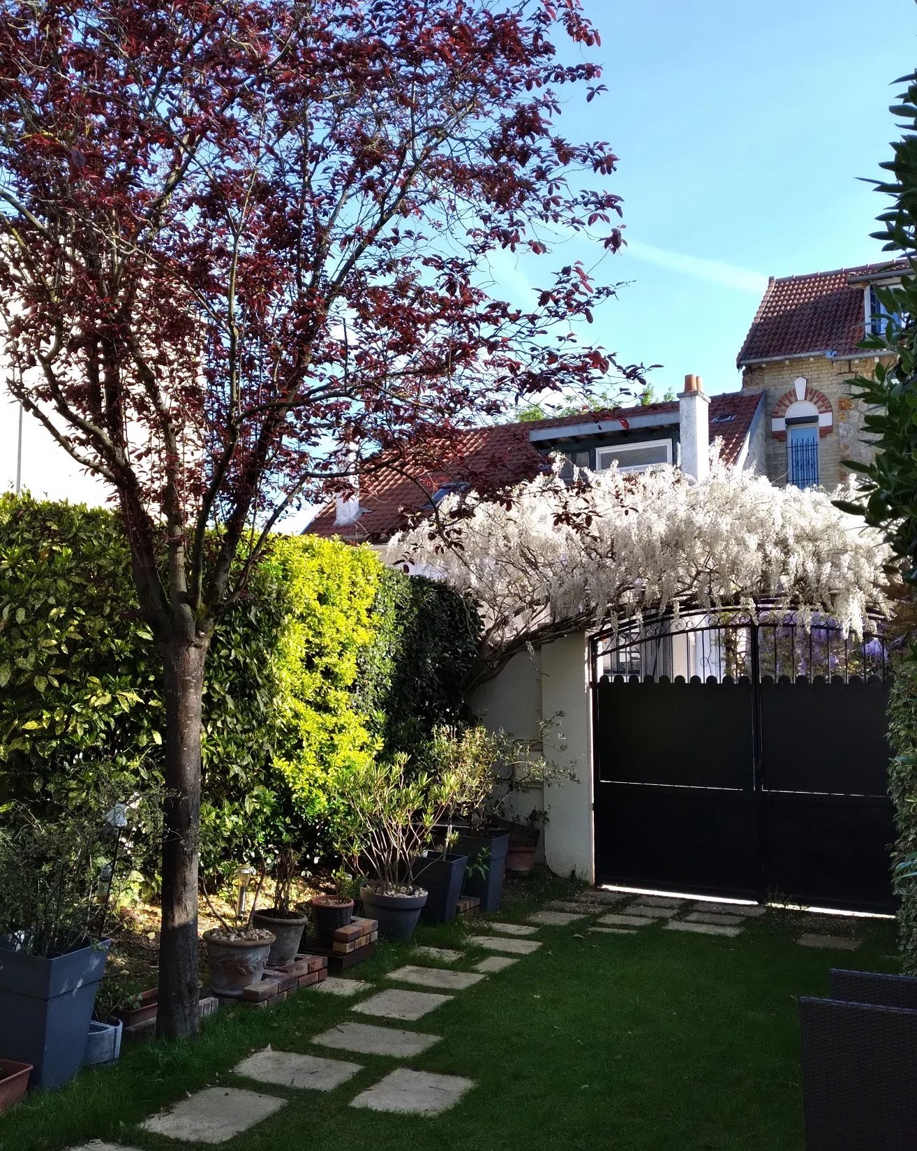 Jardin arboré avec grande terrasse et une magnifique glycine blanche.