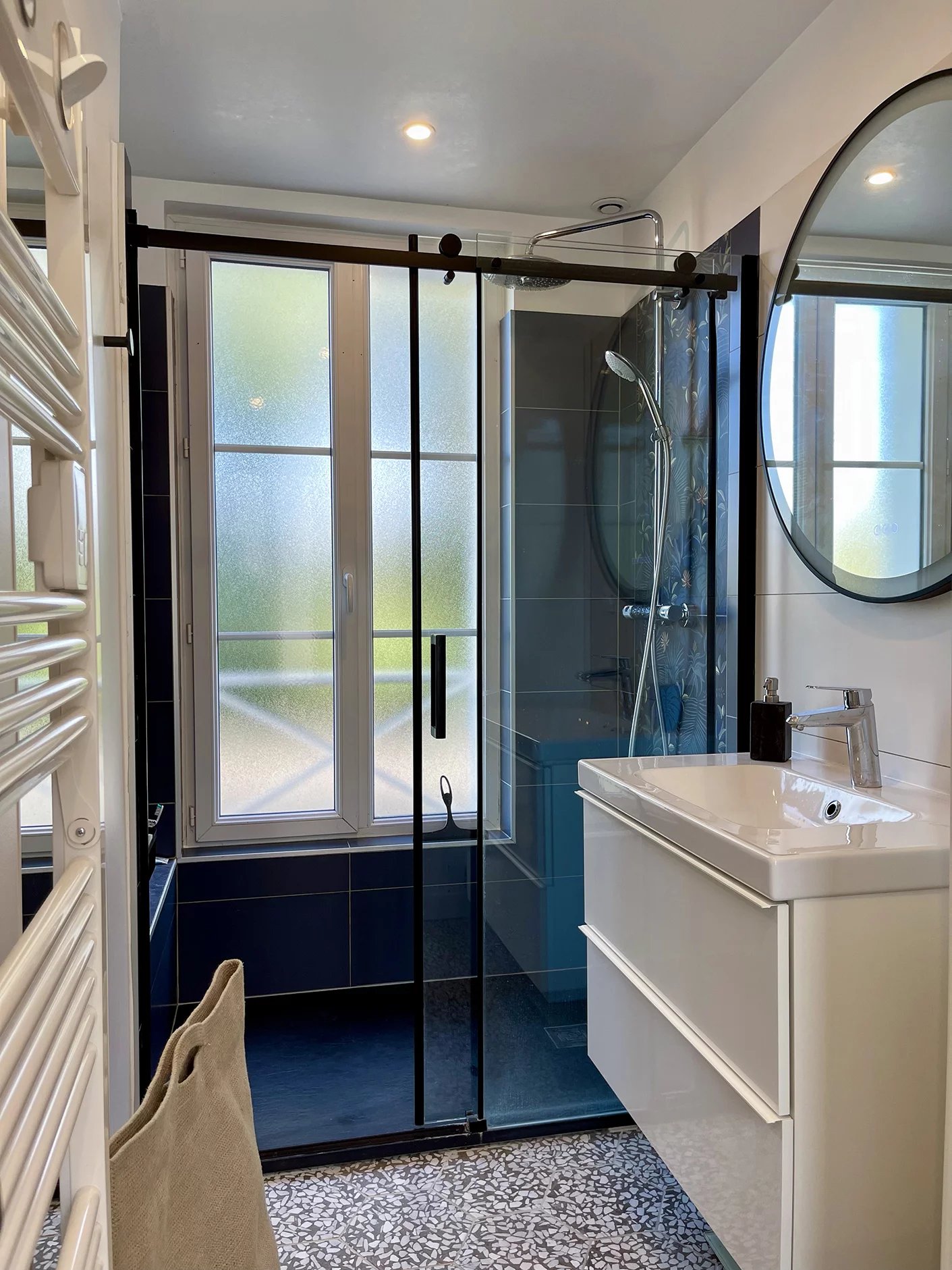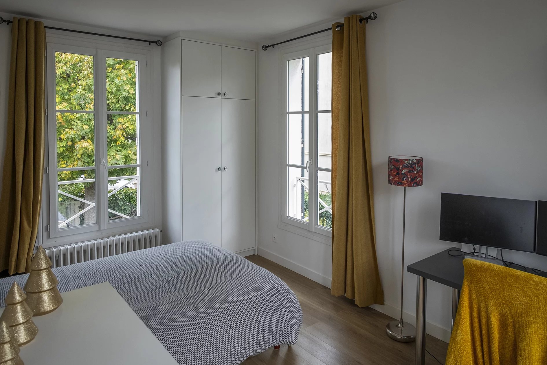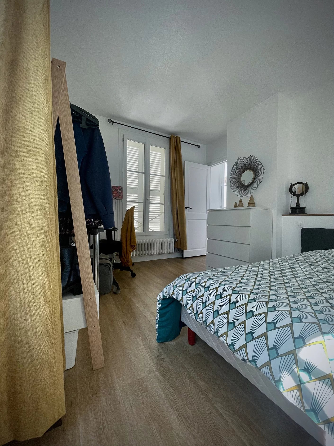 Le 1er étage dessert 2 chambres lumineuse, avec placard, la salle de douche avec fenêtre et toilettes.