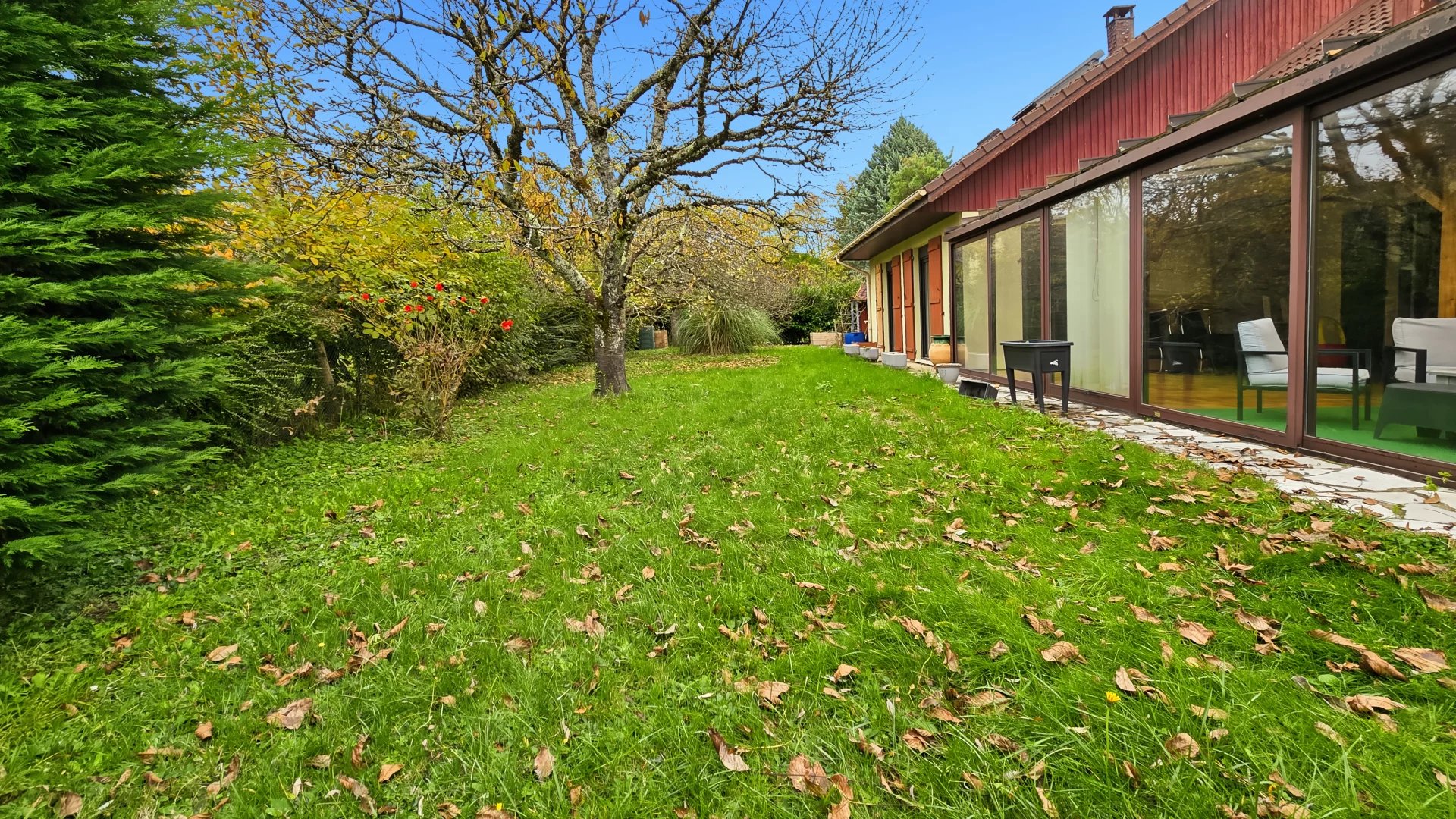 Grand terrain piscinable de 1 200 m² sans vis-à-vis, dans un environnement paisible et verdoyant.