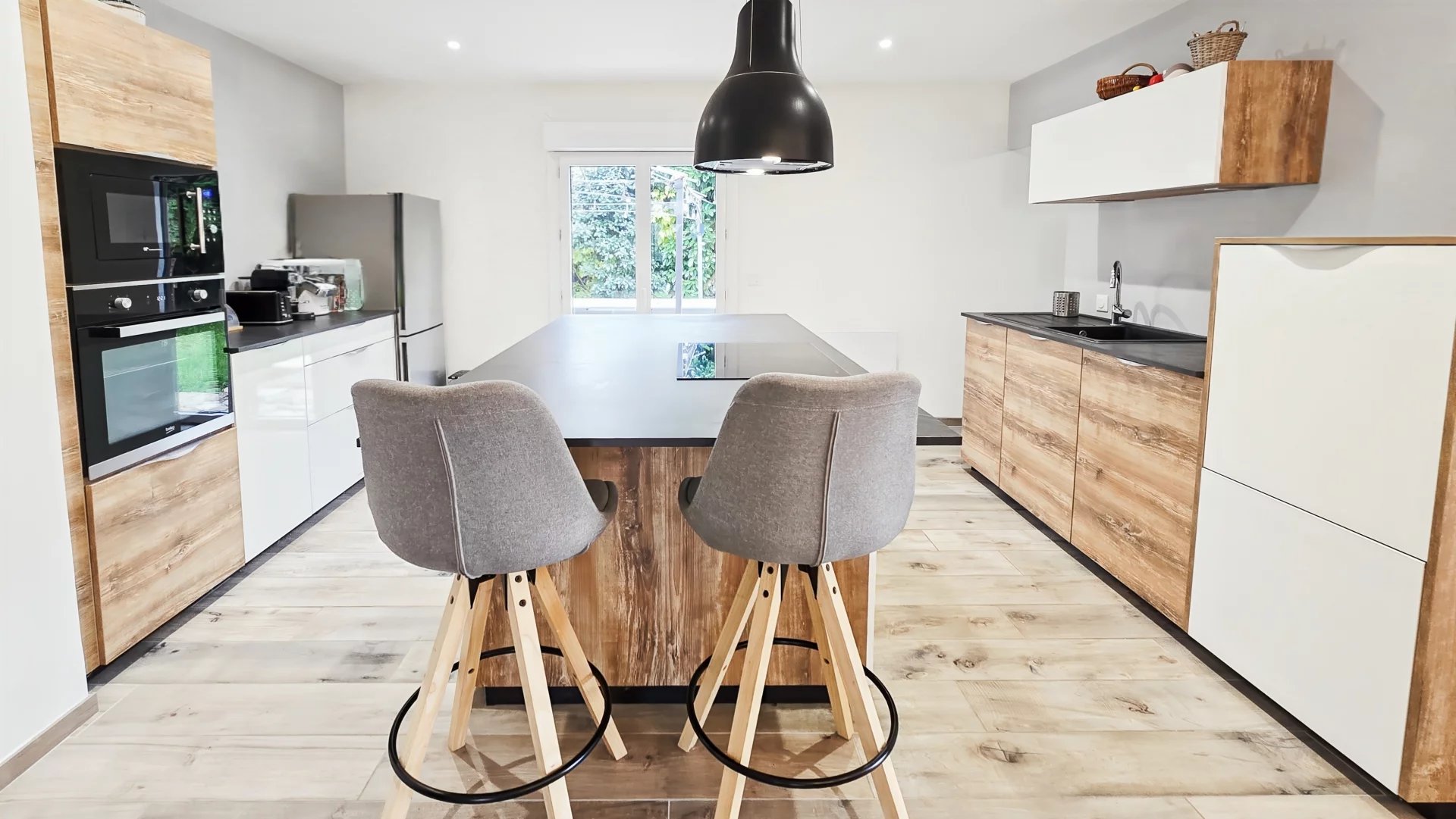 Une cuisine moderne "Cuisinella" installée en 2020, avec ilot central, s’ouvre sur un vaste espace salle à manger et un grand salon chaleureux avec cheminée, idéal pour vos moments en famille ou entre amis.