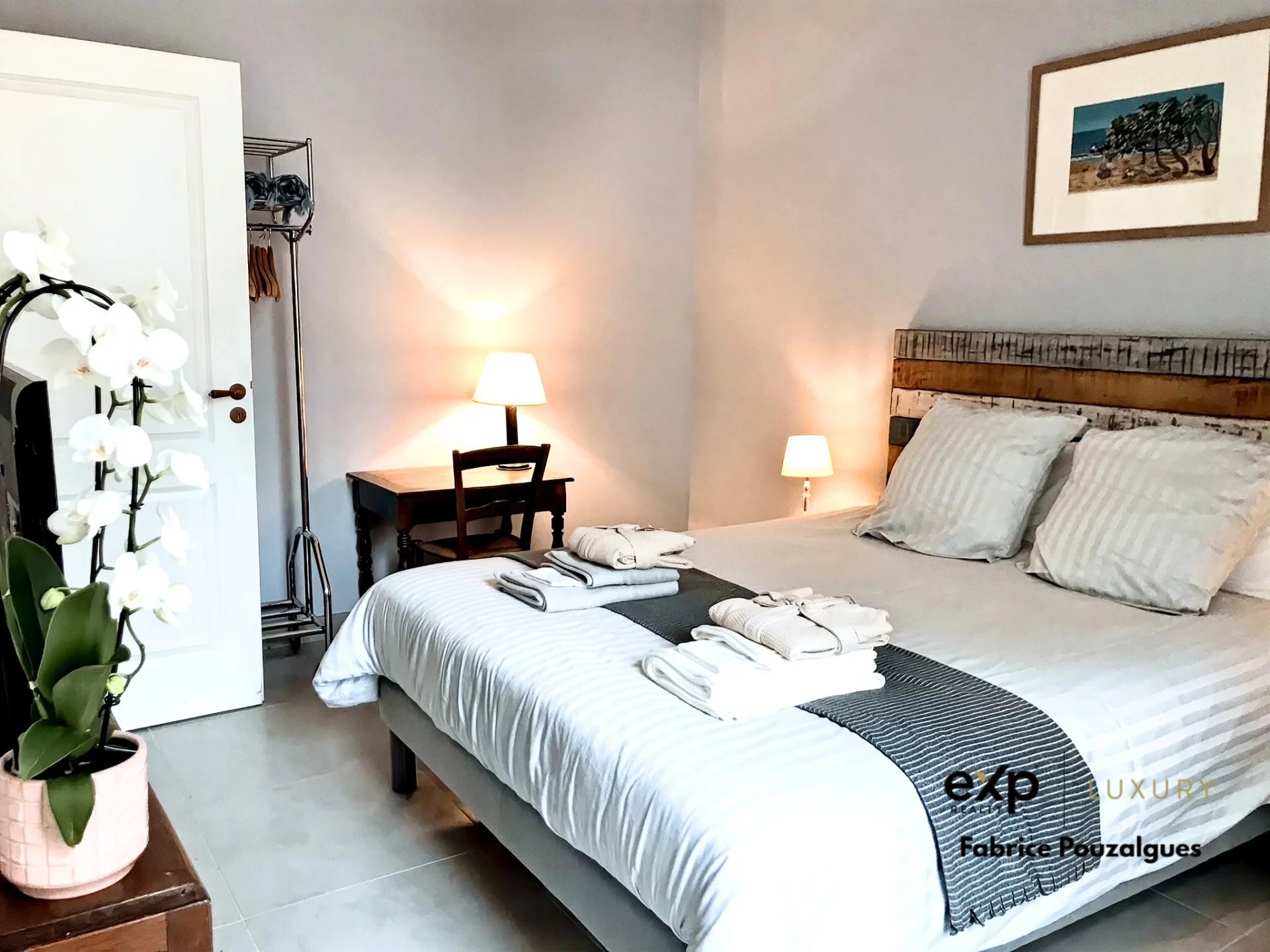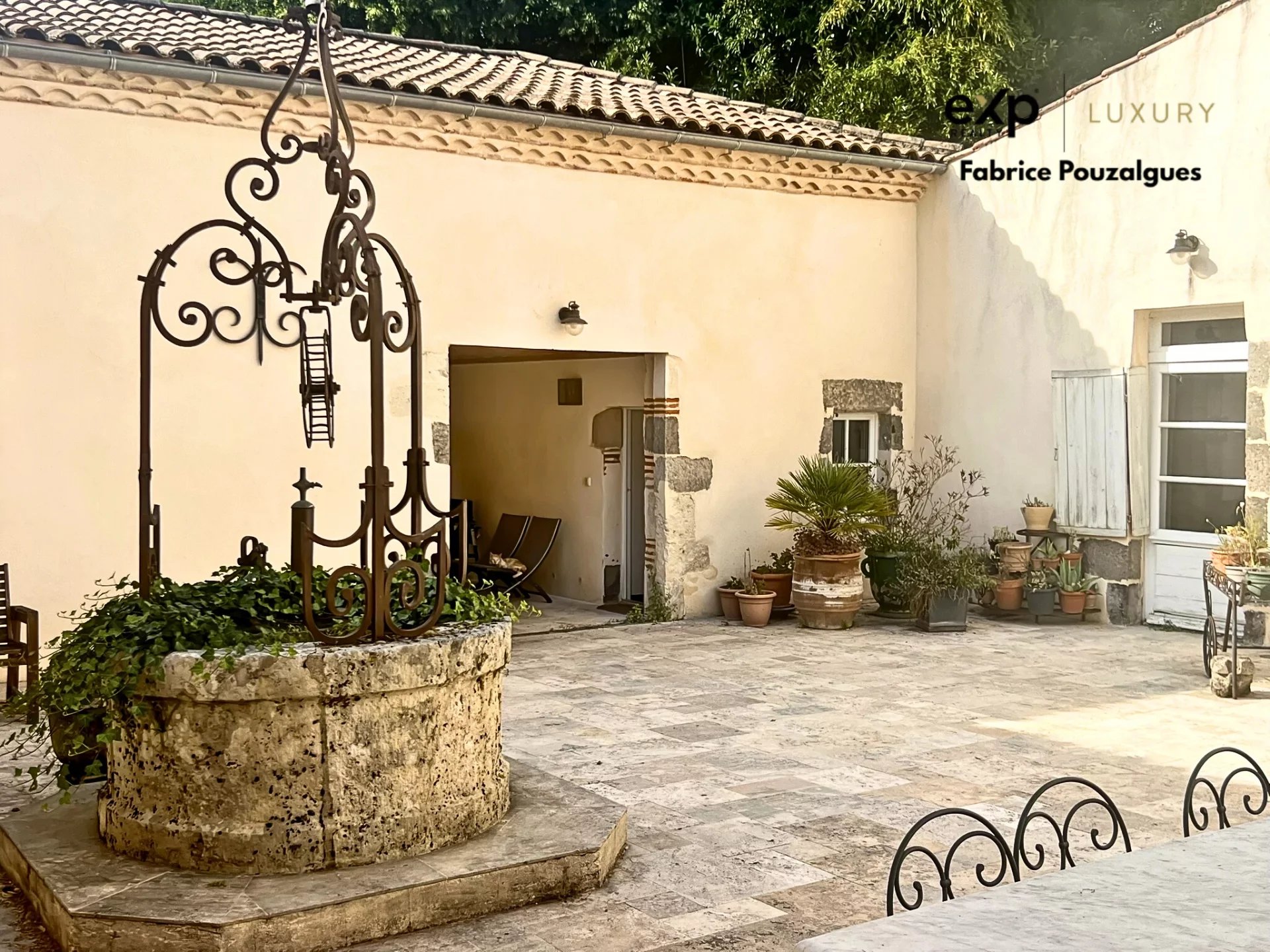 Au centre, un patio de 90 m² pavé de travertin, illuminé avec subtilité, encadre un puits en pierre et fer forgé, véritable point central de vie. À l’extérieur, la piscine au sel, le terrain de pétanque et la grange rénovée s’intègrent naturellement dans le parc, composé de prairies, bois et bambouseraie, créant un cadre à la fois intime et ouvert sur la nature environnante.