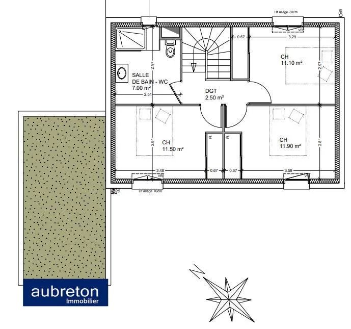 À l'étage trois chambres allant de 11.10 à 11.90 m² et une salle d'eau de 7m².