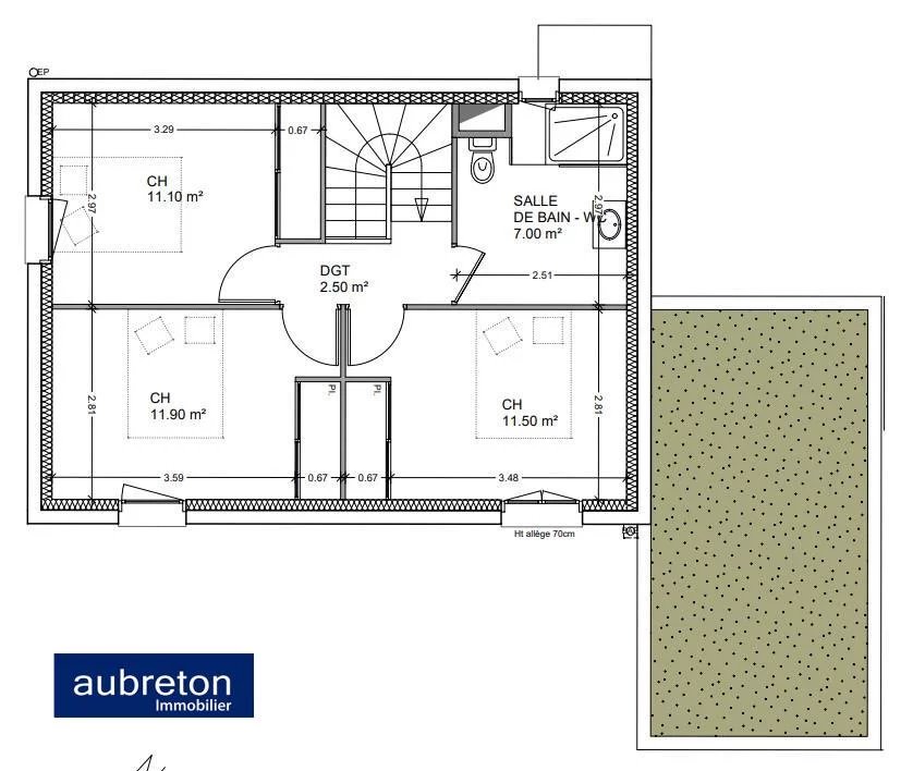À l'étage trois chambres allant de 11.10 à 11.90 m² et une salle d'eau de 7m².
