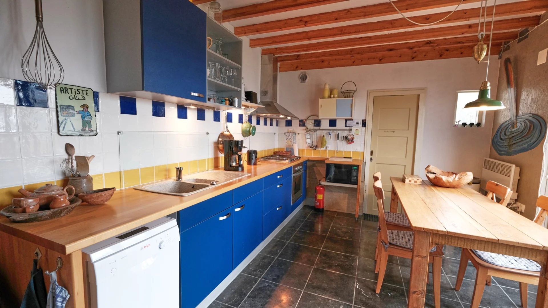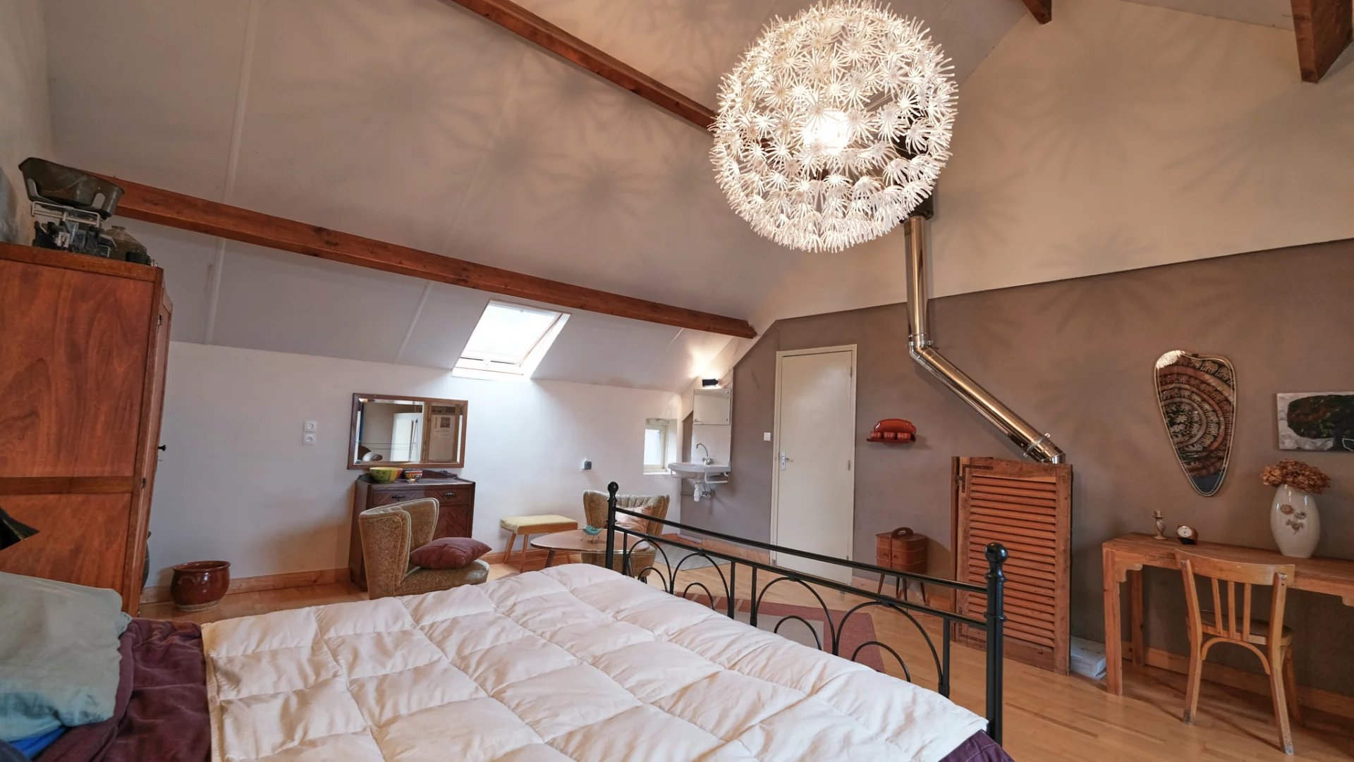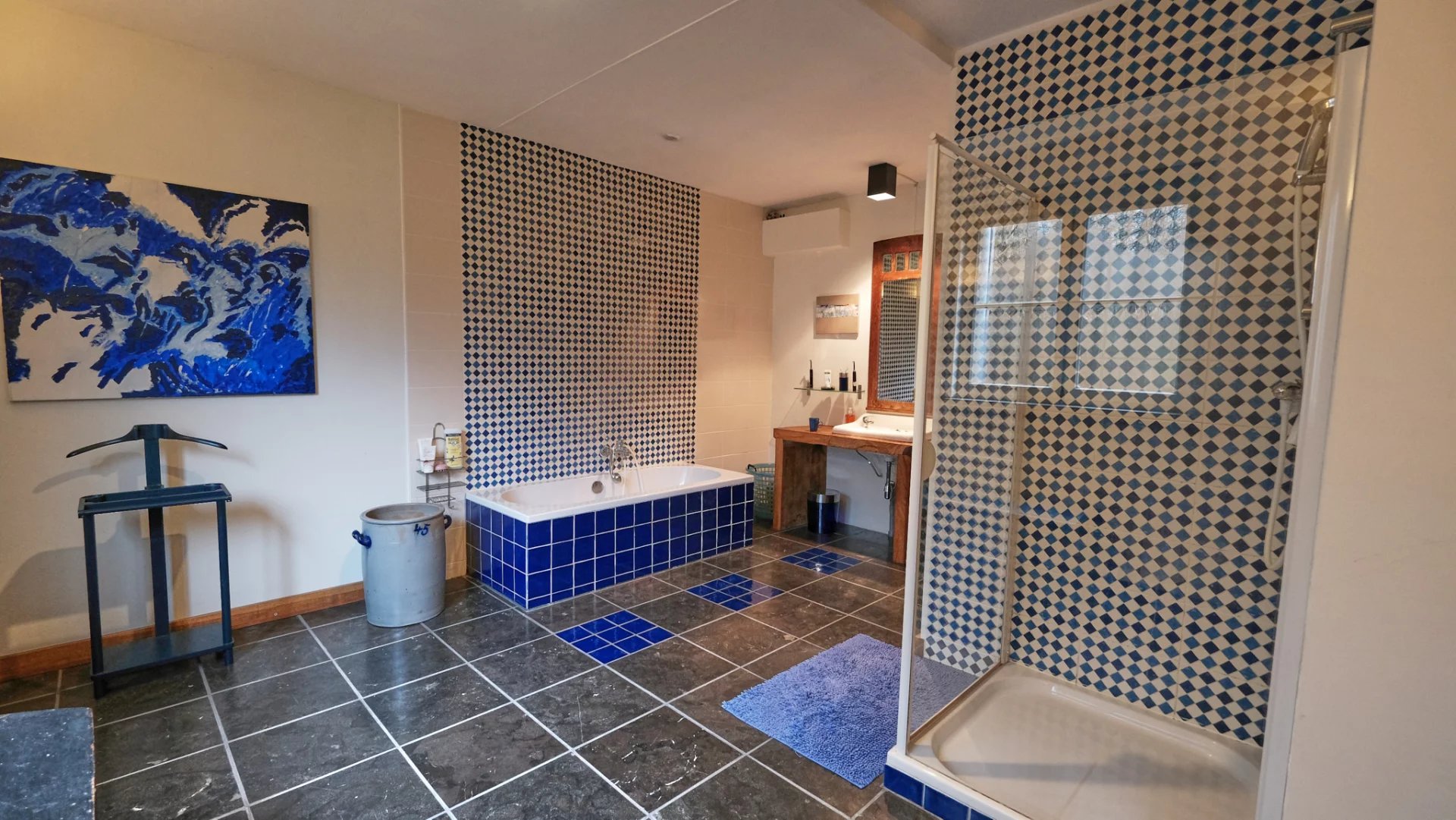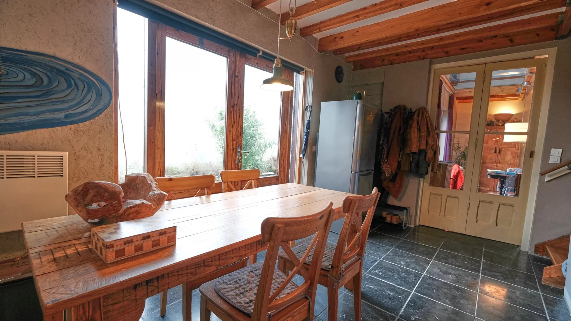 Cuisine spacieuse (16m2), grand séjour (39 m2) avec poêle à bois, salle de bain avec douche, baignoire, lavabo. WC.
