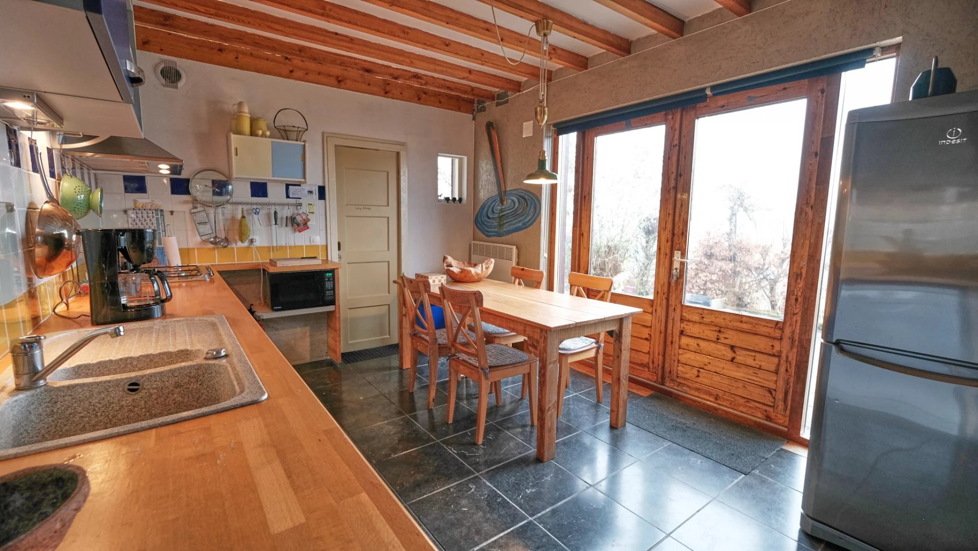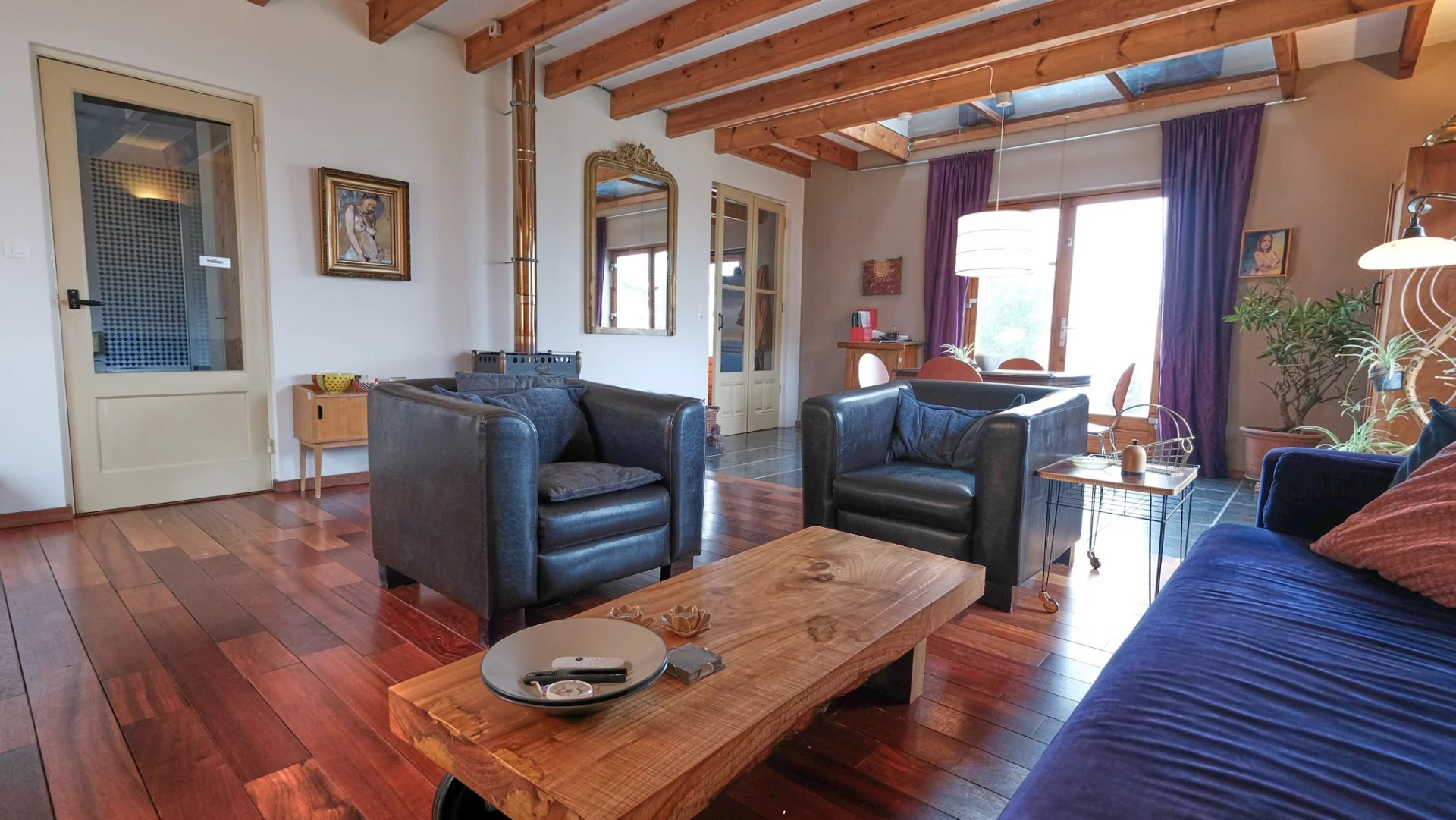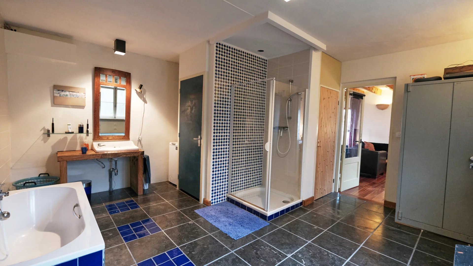 Cuisine spacieuse (16m2), grand séjour (39 m2) avec poêle à bois, salle de bain avec douche, baignoire, lavabo. WC.