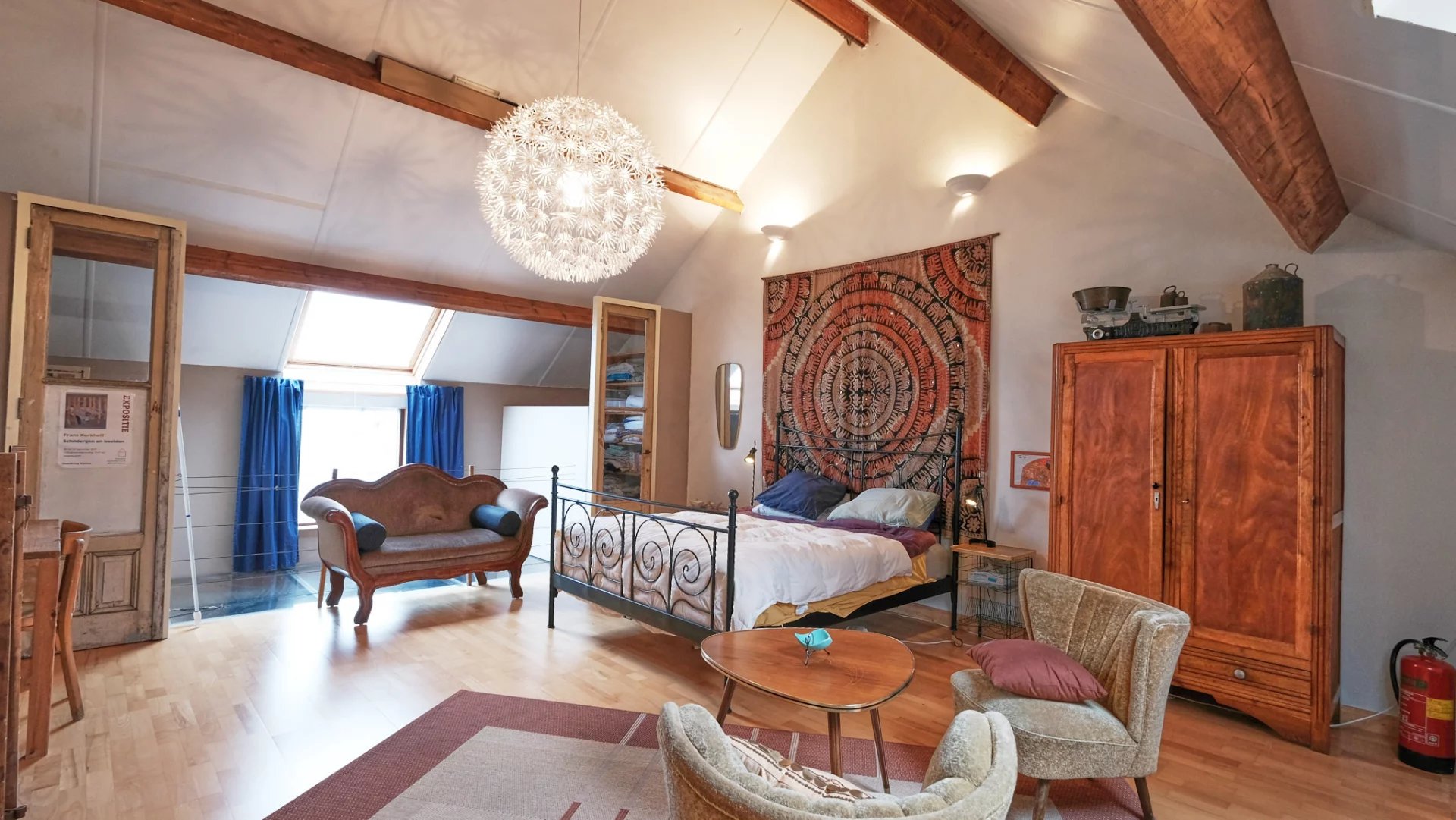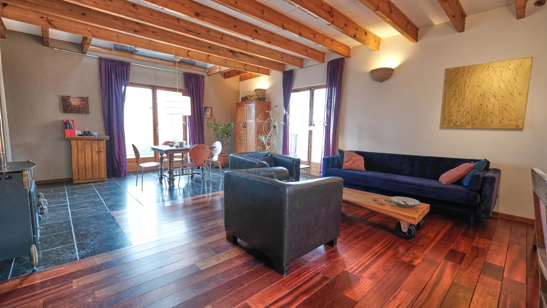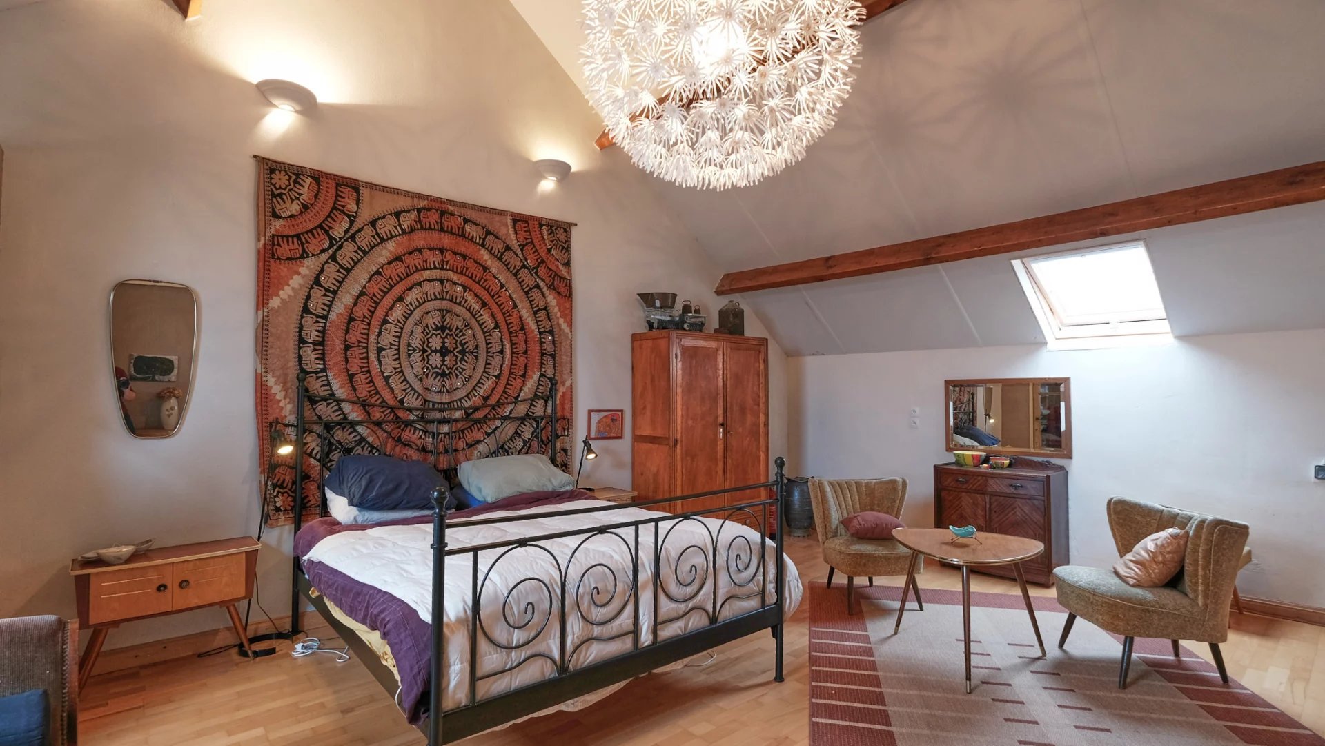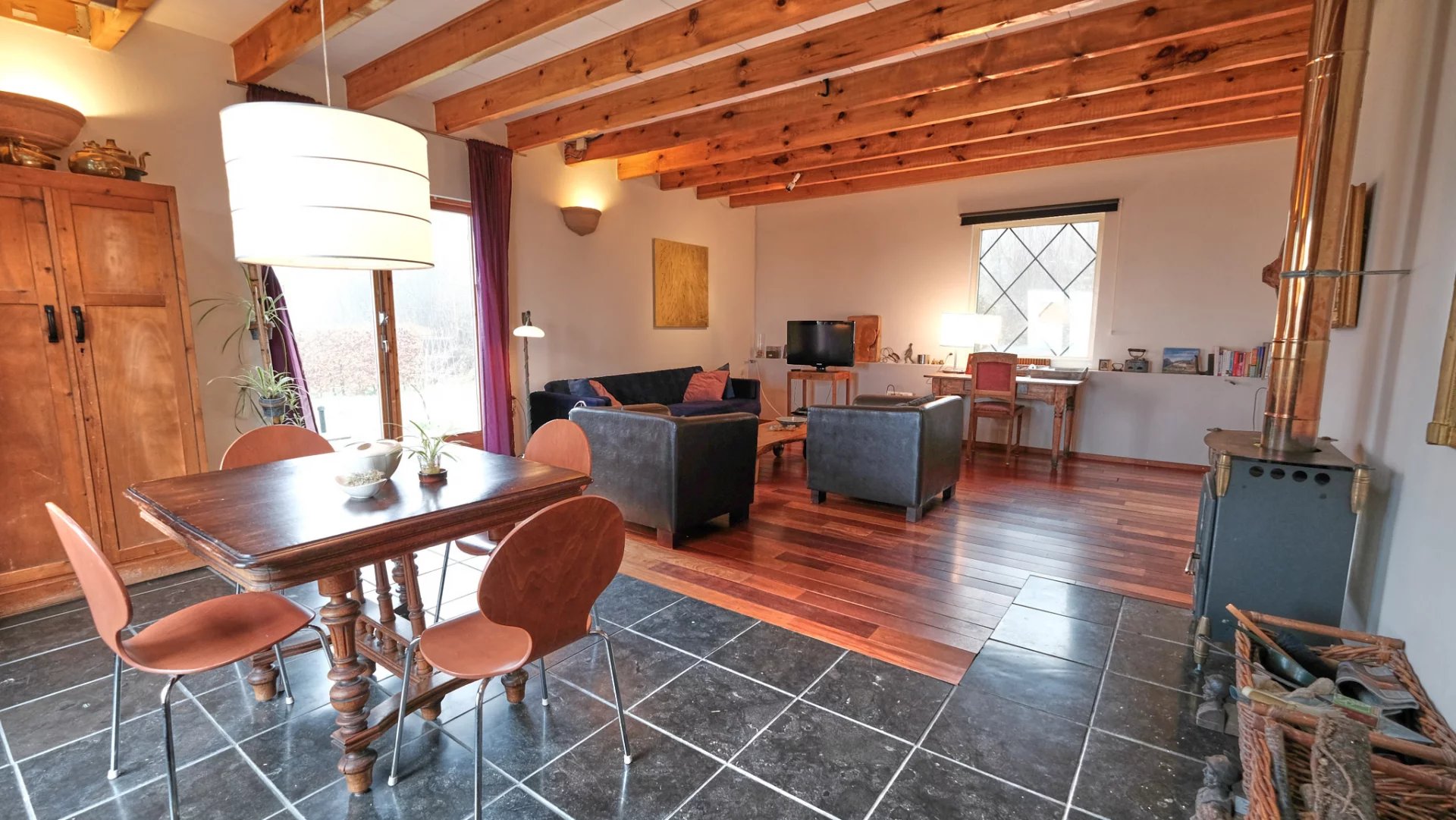 Cuisine spacieuse (16m2), grand séjour (39 m2) avec poêle à bois, salle de bain avec douche, baignoire, lavabo. WC.