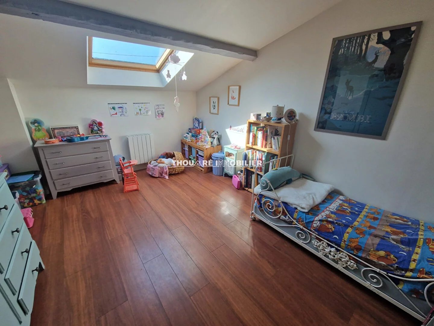 À l'étage, une grande mezzanine, actuellement aménagée en bureau et salle de jeux, offre un espace supplémentaire confortable et polyvalent. Elle mène à deux chambres agréables et lumineuses, ainsi qu'à une salle de bains avec WC.