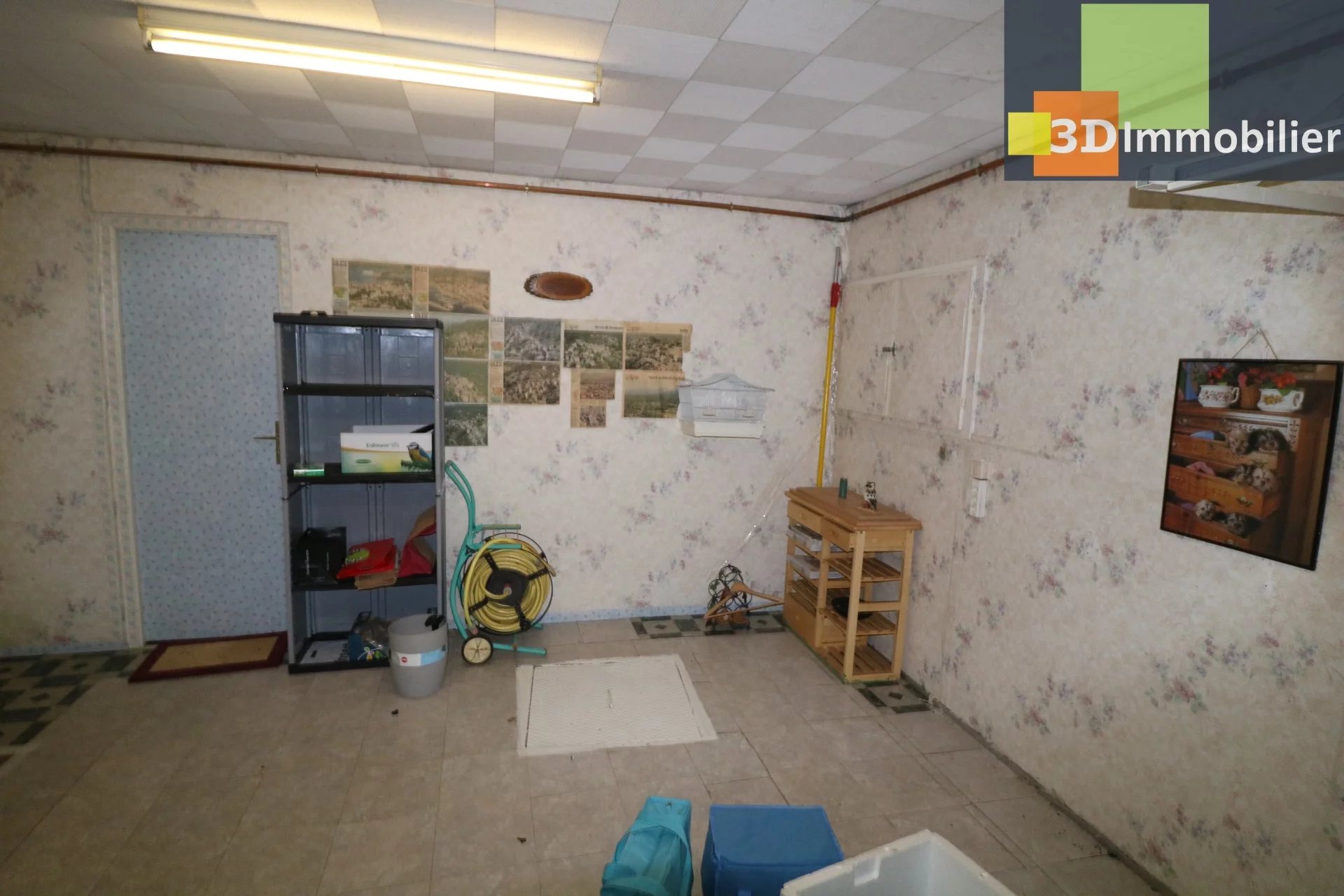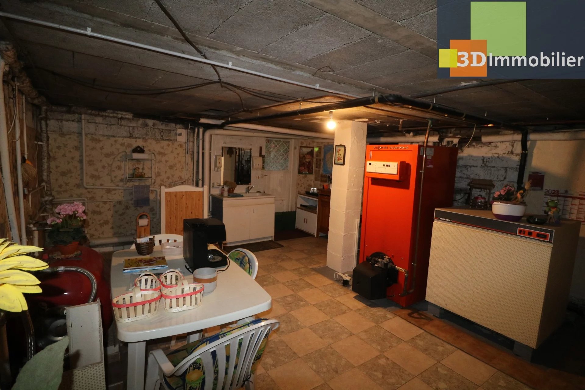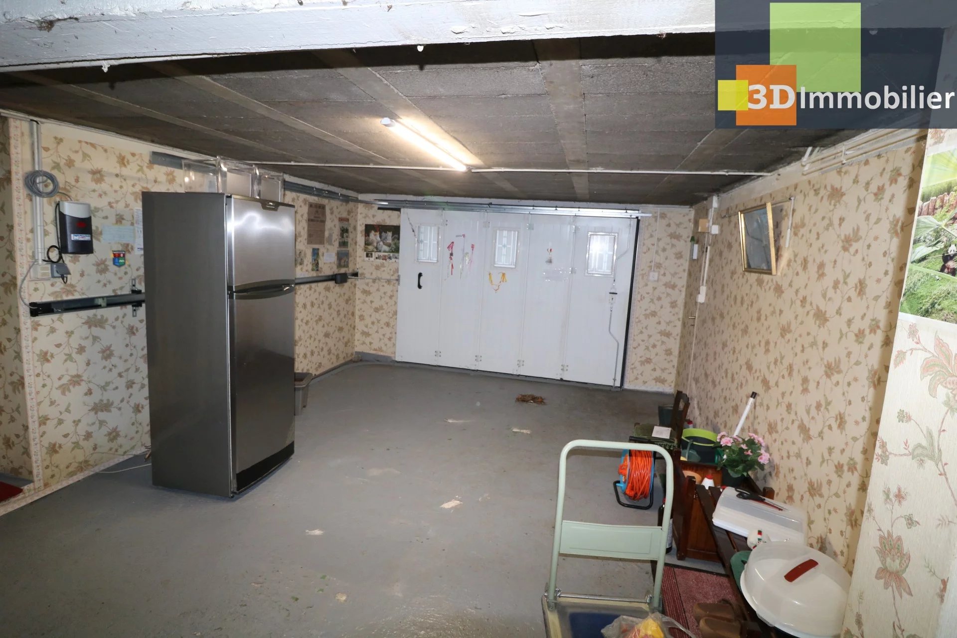 De plain-pied on a accès à 1 garage de 48m² avec porte électrique, 1 second garage de 20m², 1 local de chaufferie de 27m² avec système de forage, 1 chambre/bureau de 14m² et 1 WC.