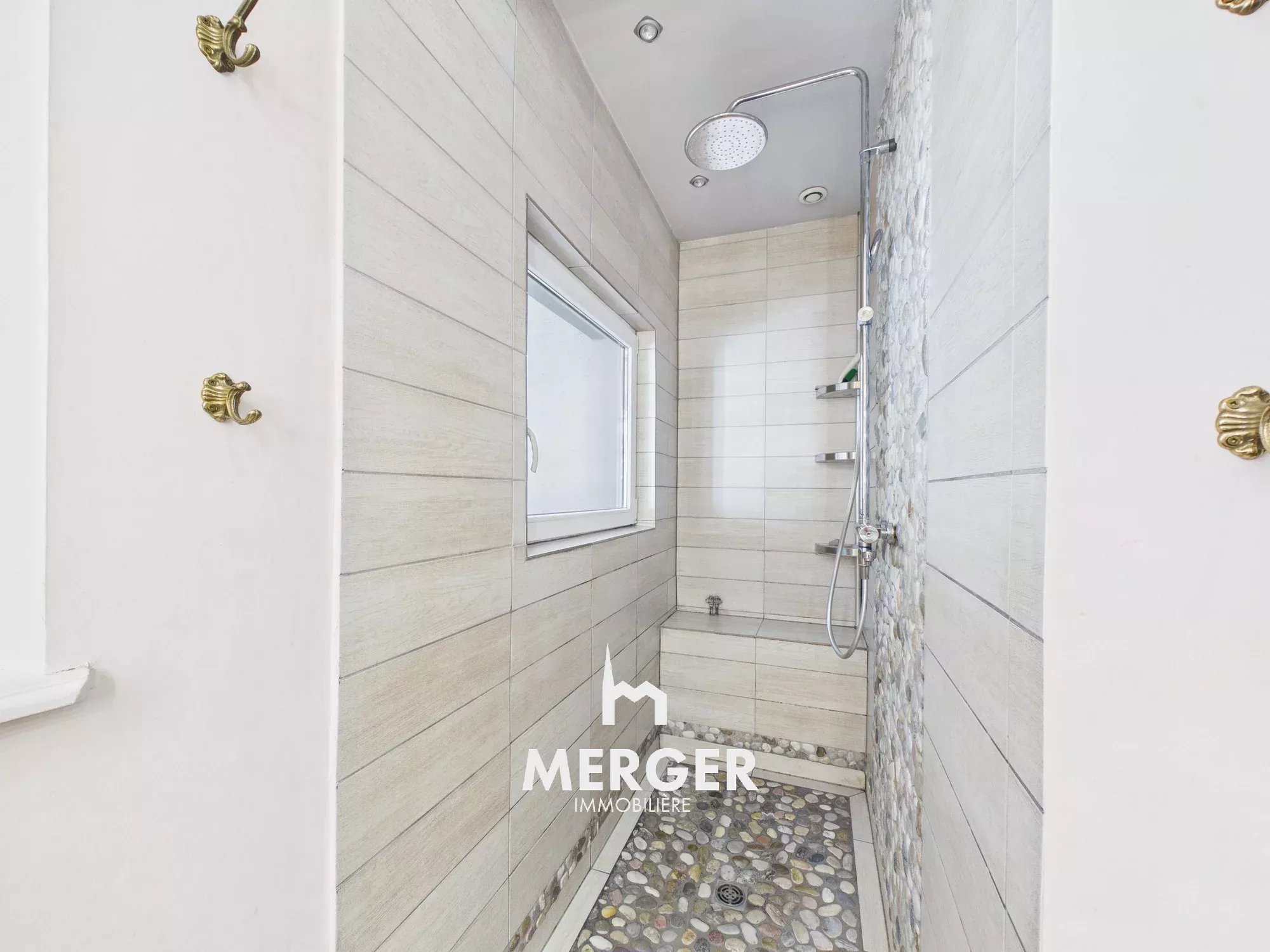 Au RDC, une belle entrée qui distribue un double séjour avec un poêle au gaz, une cuisine équipée ouverte sur une véranda, une chambre, une salle d'eau et un WC invité.