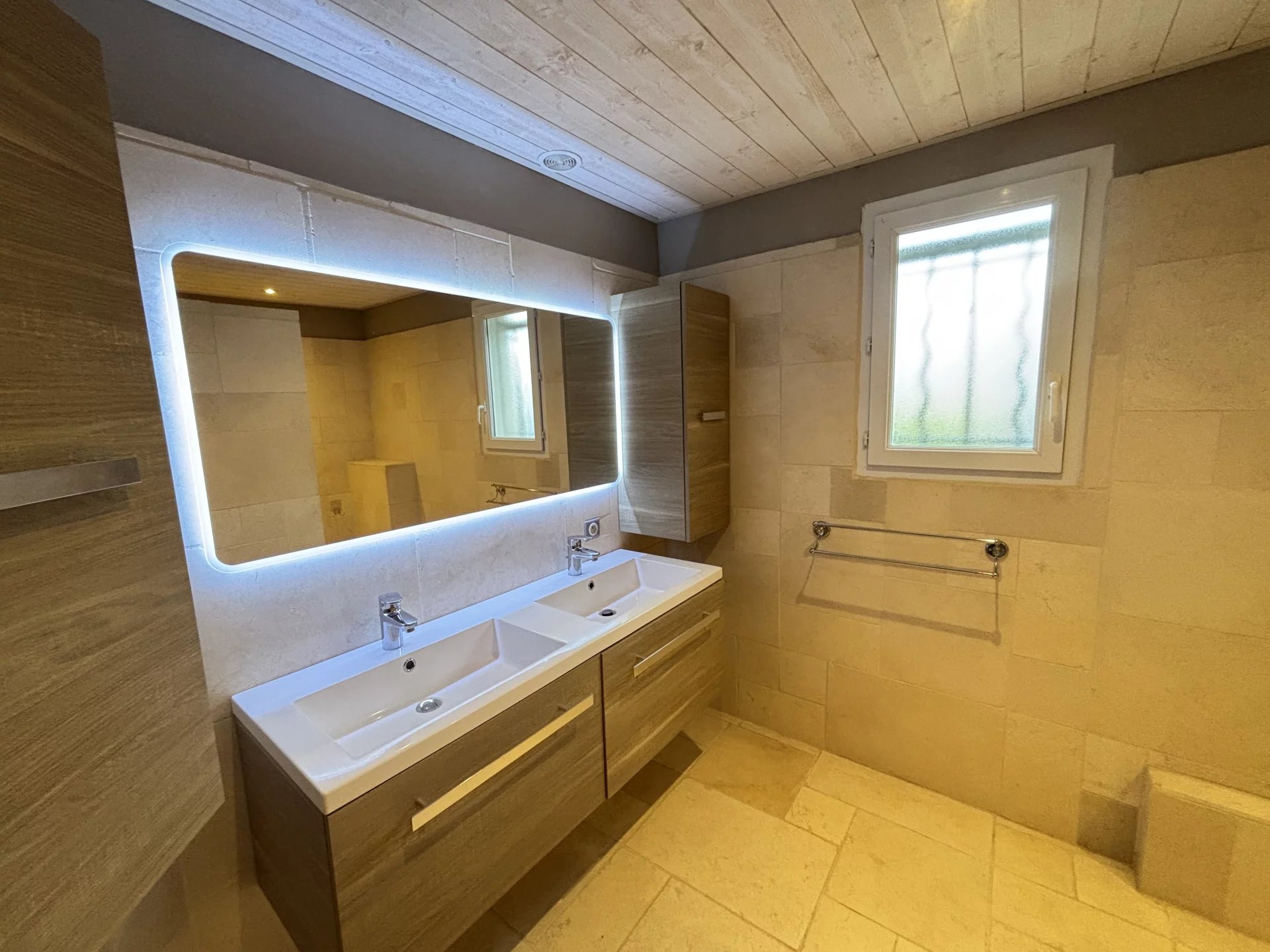 L’espace nuit propose trois chambres confortables, une vaste salle d’eau contemporaine avec douche à l’italienne, ainsi que des toilettes séparées.