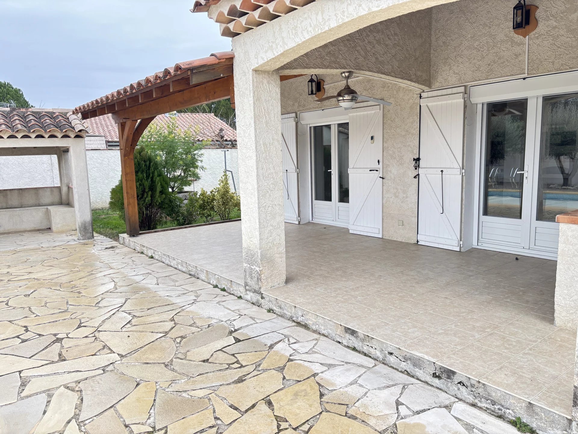 Un garage attenant avec mezzanine offre un bel espace de rangement, complété par un abri voiture.