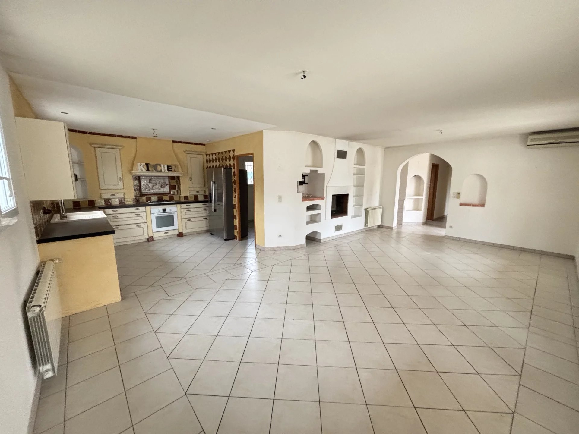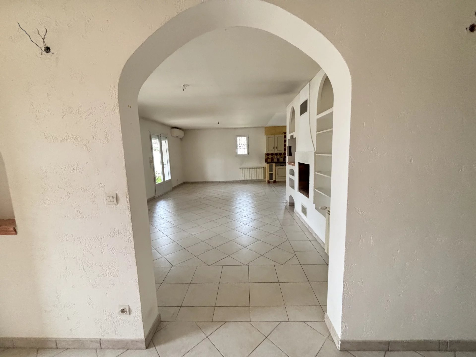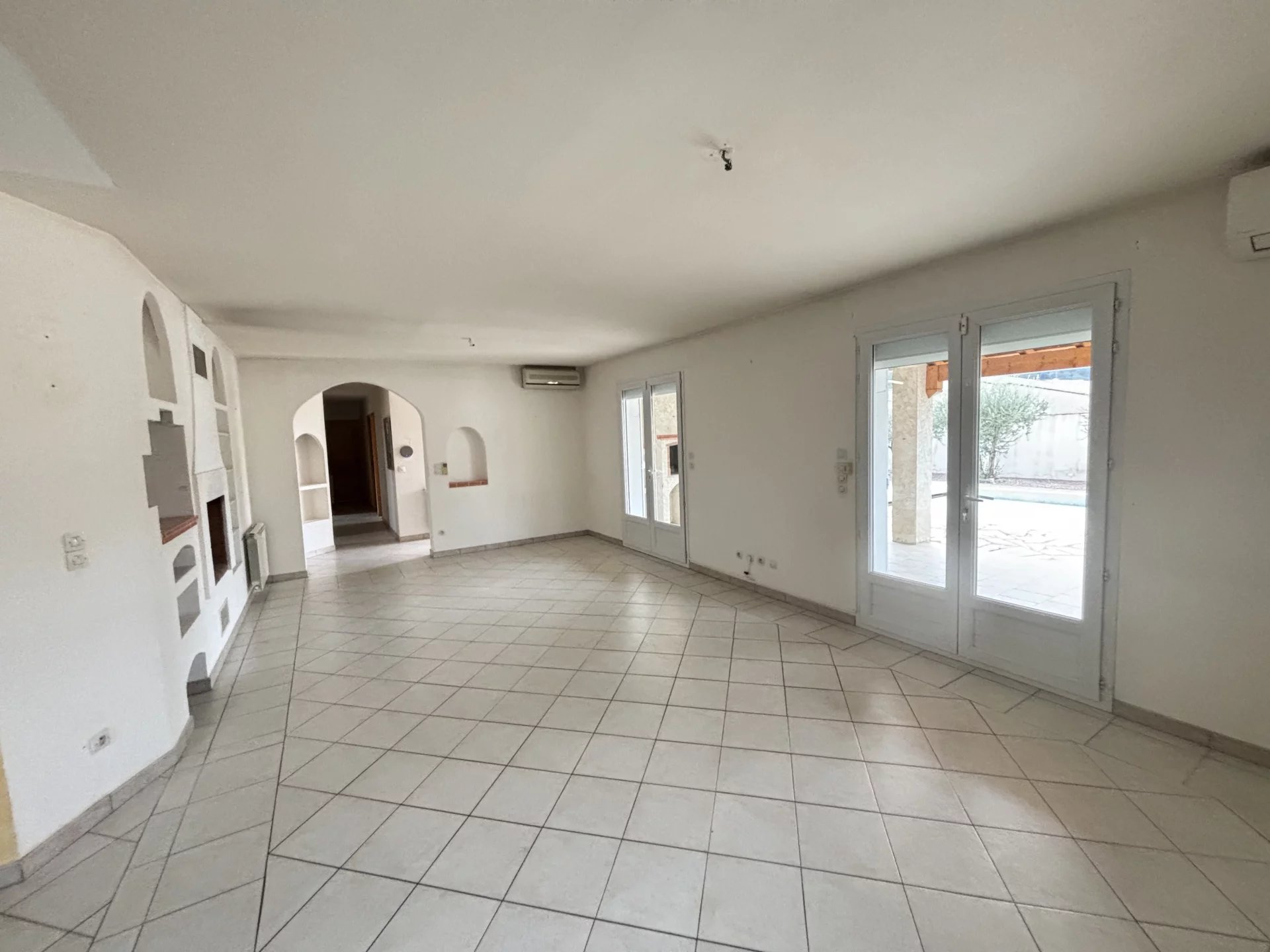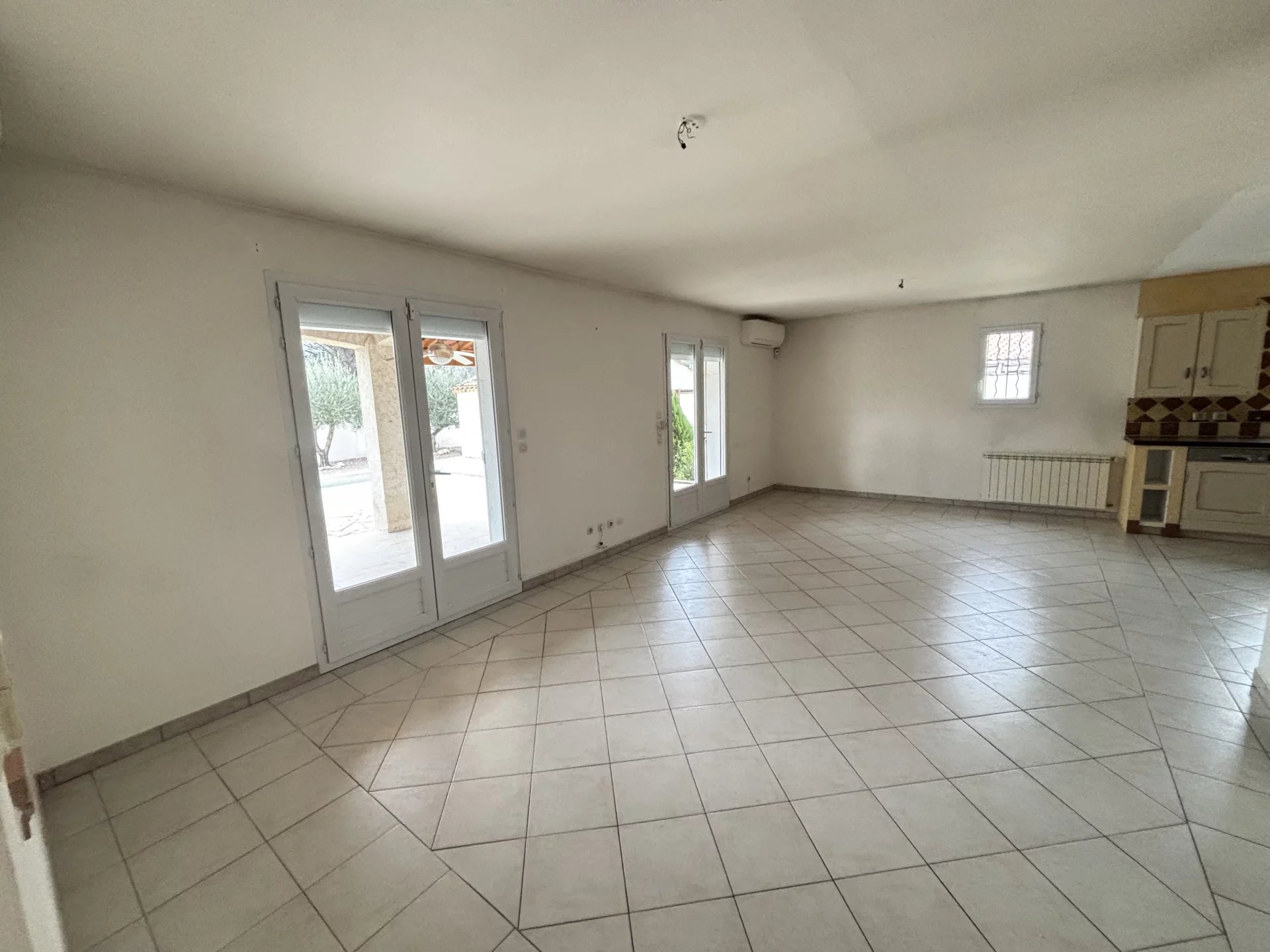 La maison se compose d’une grande cuisine moderne entièrement équipée, ouverte sur un salon-séjour lumineux donnant directement accès à une terrasse exposée plein sud, avec une belle vue sur la piscine.