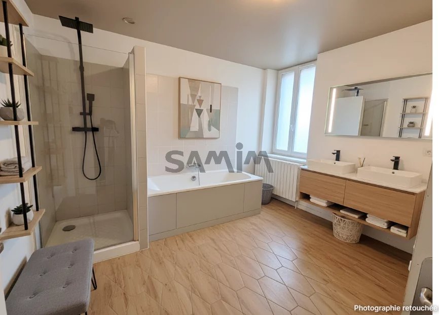 A l'étage 2 belles chambres et une salle de bains avec douche et wc. Un palier permet de créer de nouveaux espaces