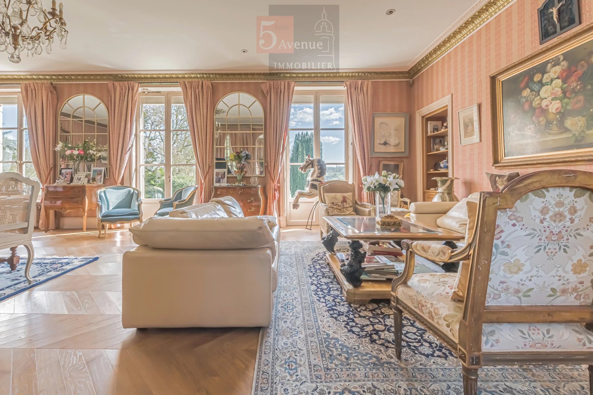 Au rez-de-chaussée, un vestibule d'entrée dessert un salon de 60 m2 ouvert sur la terrasse et le parc exposé plein sud, une salle à manger, une cuisine, un bureau et un bar. Parquet Versailles, cheminées anciennes et double exposition.