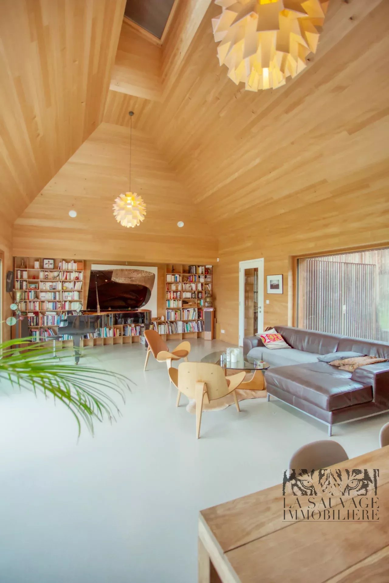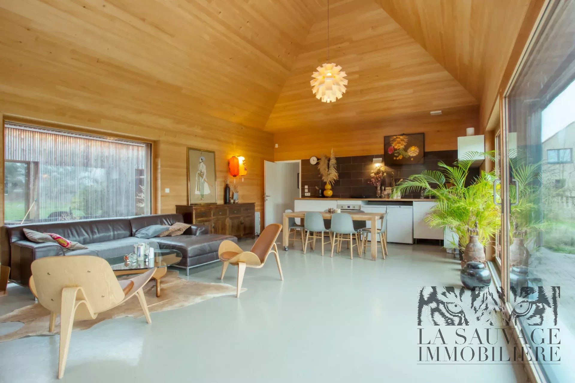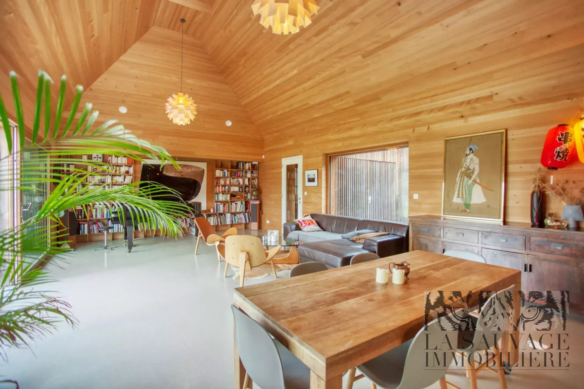Dès l’entrée, le ton est donné : une spectaculaire pièce de vie cathédrale de 51 m², intégralement habillée de sapin clair, baignée de lumière grâce à ses vastes baies vitrées ouvertes plein sud sur le jardin et la forêt. Une seconde façade vitrée s’ouvre sur une cour intérieure arborée, tandis qu’une baie zénithale capte la course du soleil. Cet espace réunit salon, salle à manger et cuisine américaine dans une ambiance chaleureuse, évoquant un chalet contemporain.