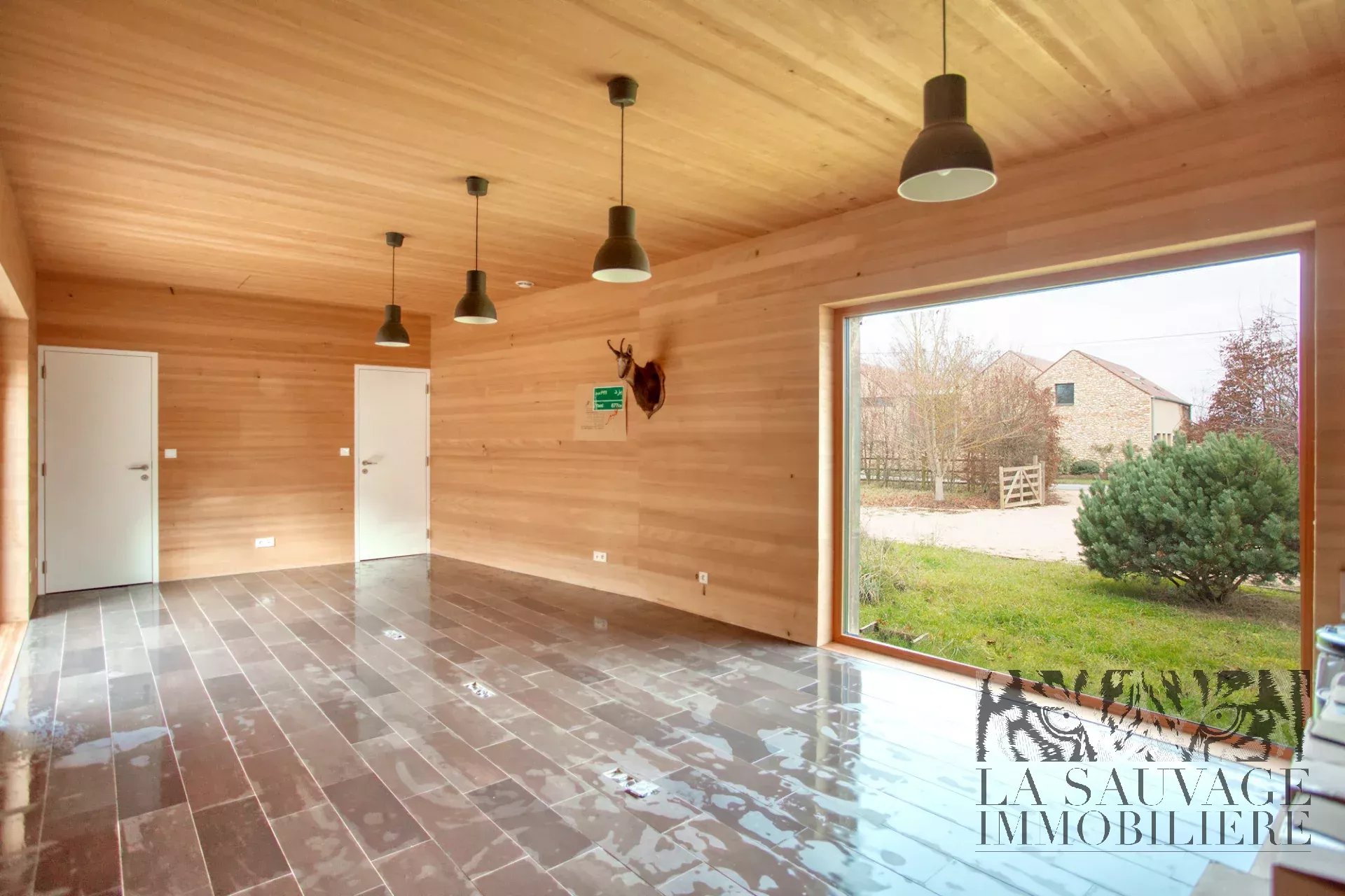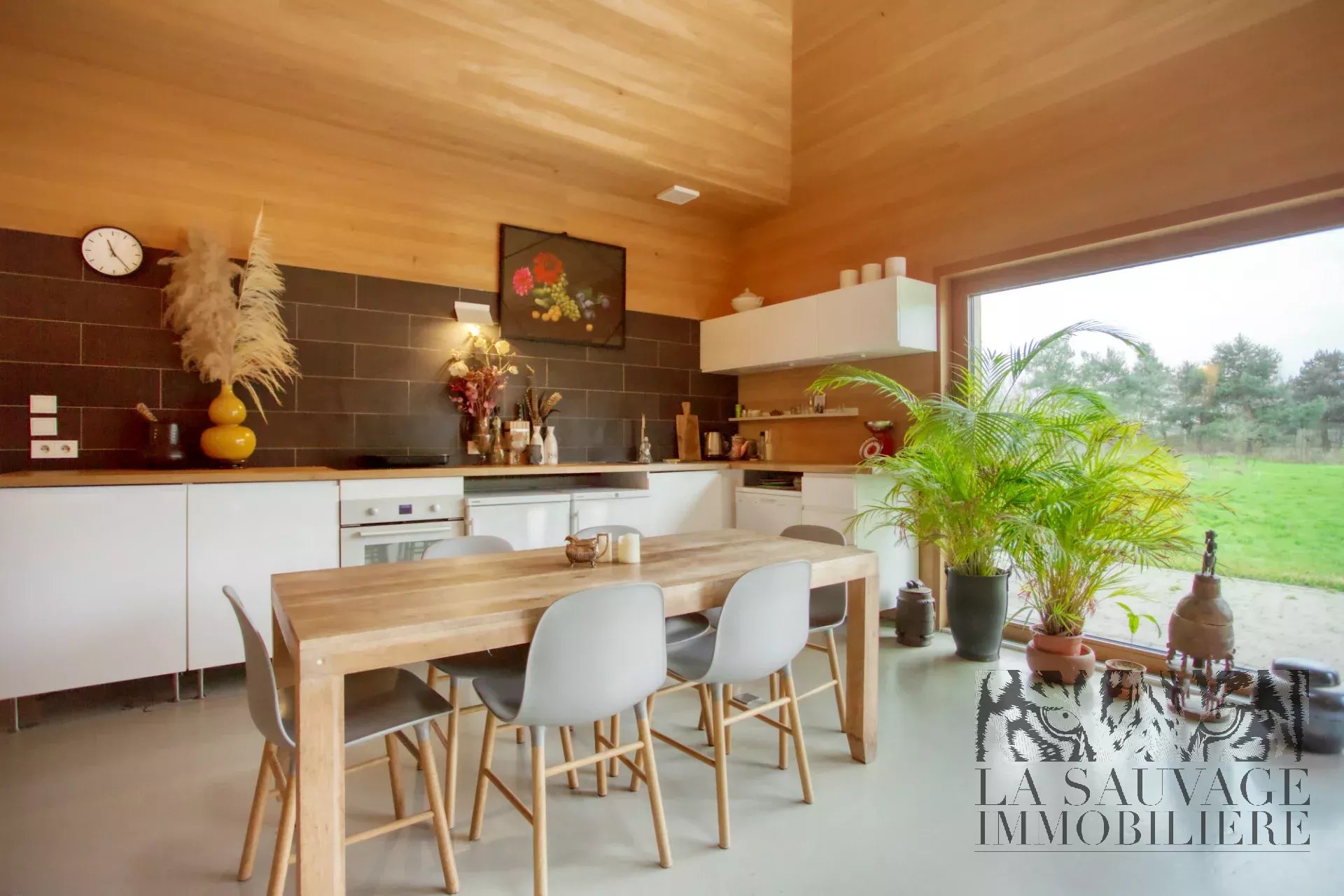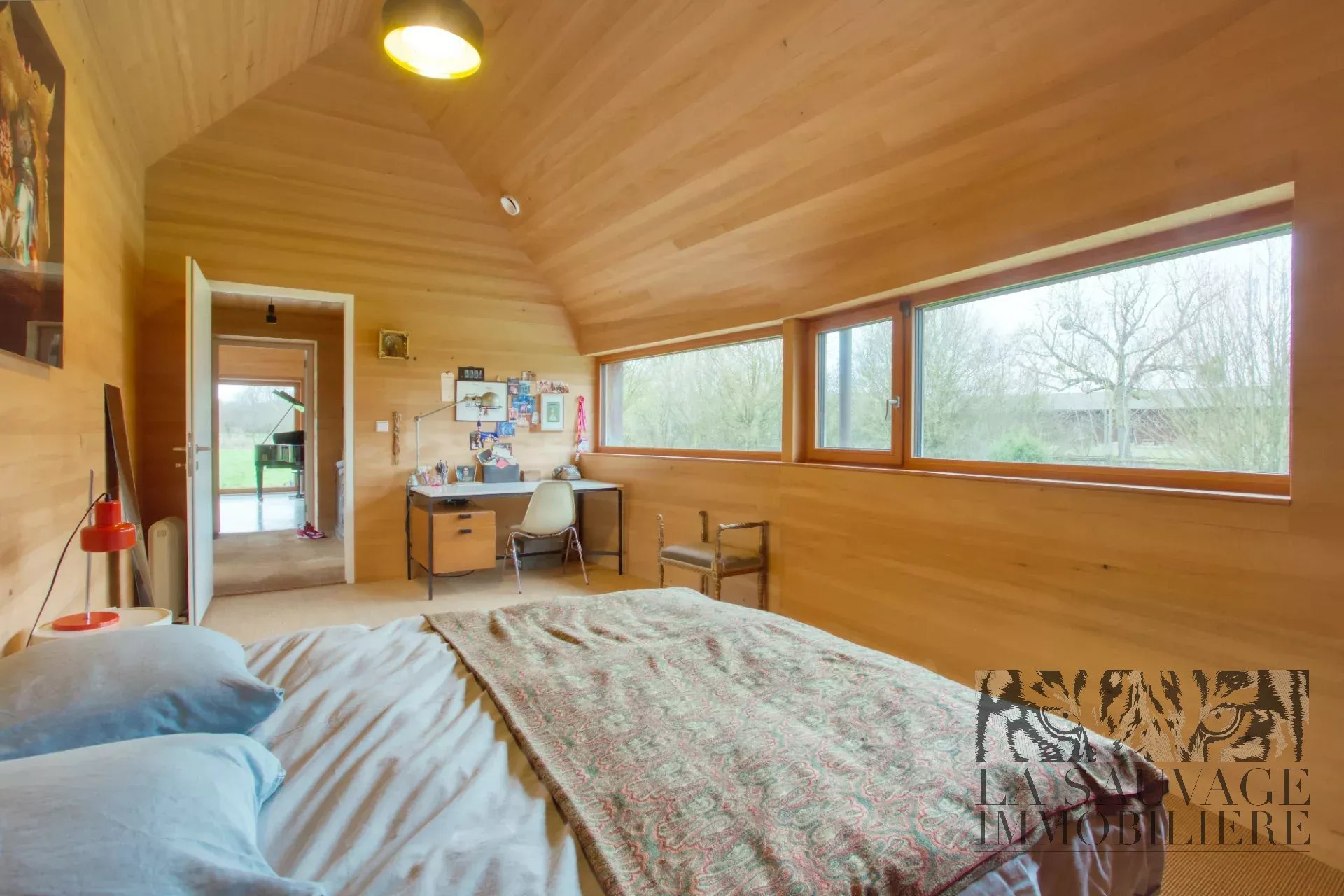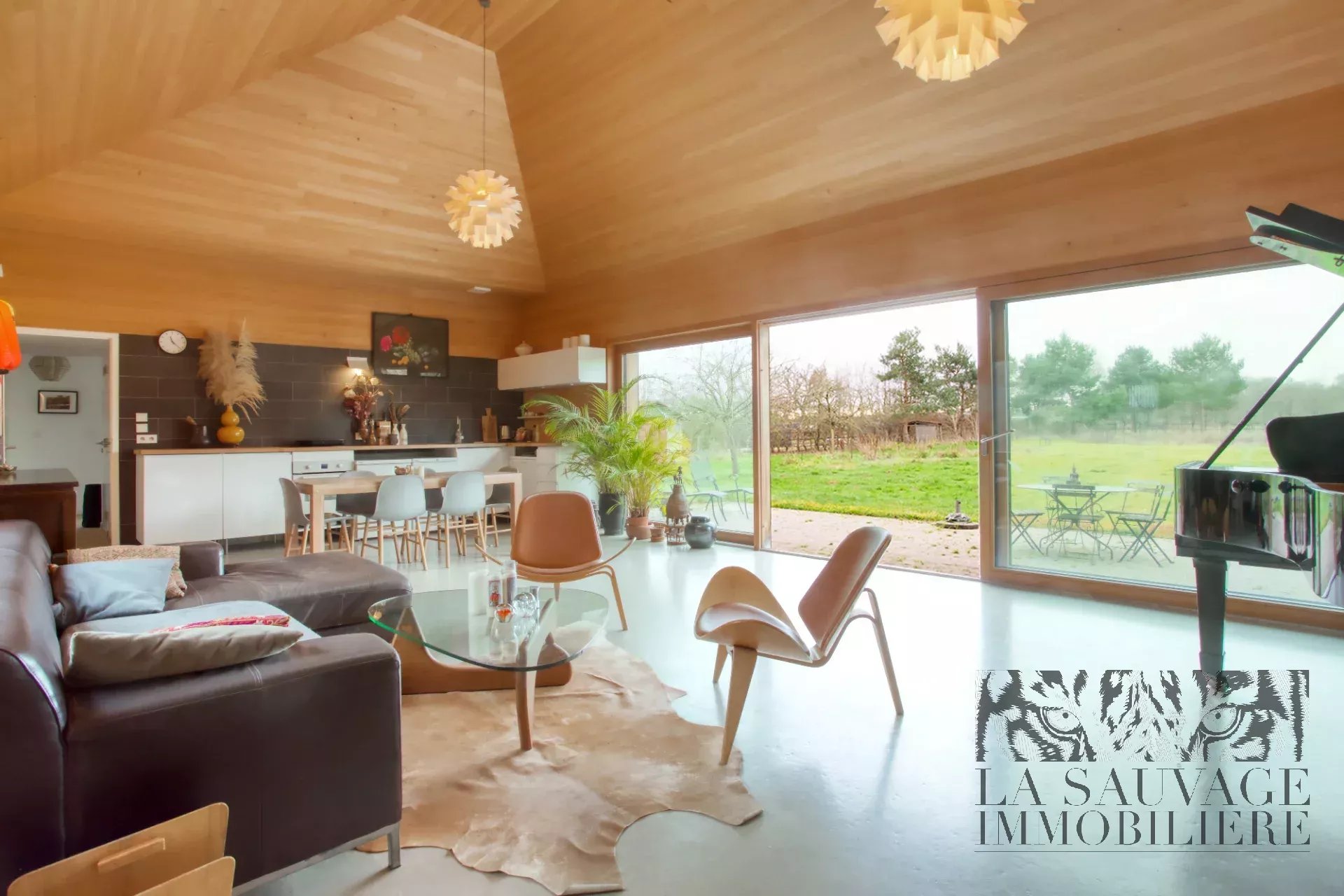 Dès l’entrée, le ton est donné : une spectaculaire pièce de vie cathédrale de 51 m², intégralement habillée de sapin clair, baignée de lumière grâce à ses vastes baies vitrées ouvertes plein sud sur le jardin et la forêt. Une seconde façade vitrée s’ouvre sur une cour intérieure arborée, tandis qu’une baie zénithale capte la course du soleil. Cet espace réunit salon, salle à manger et cuisine américaine dans une ambiance chaleureuse, évoquant un chalet contemporain.