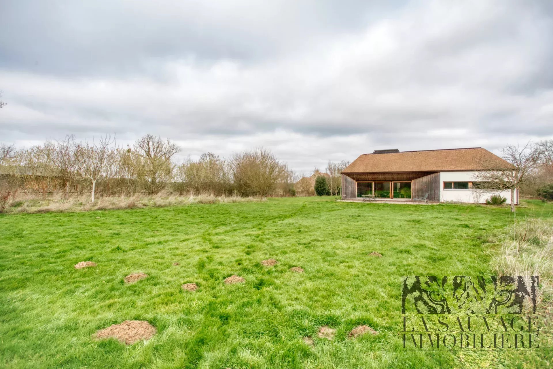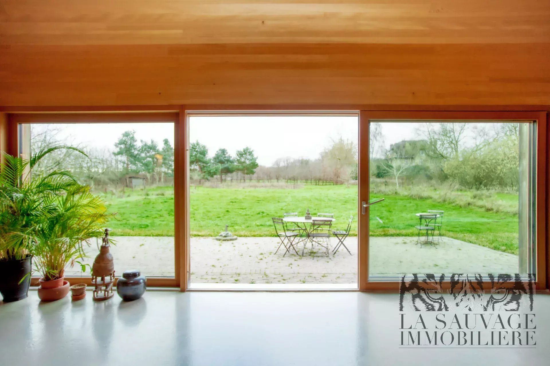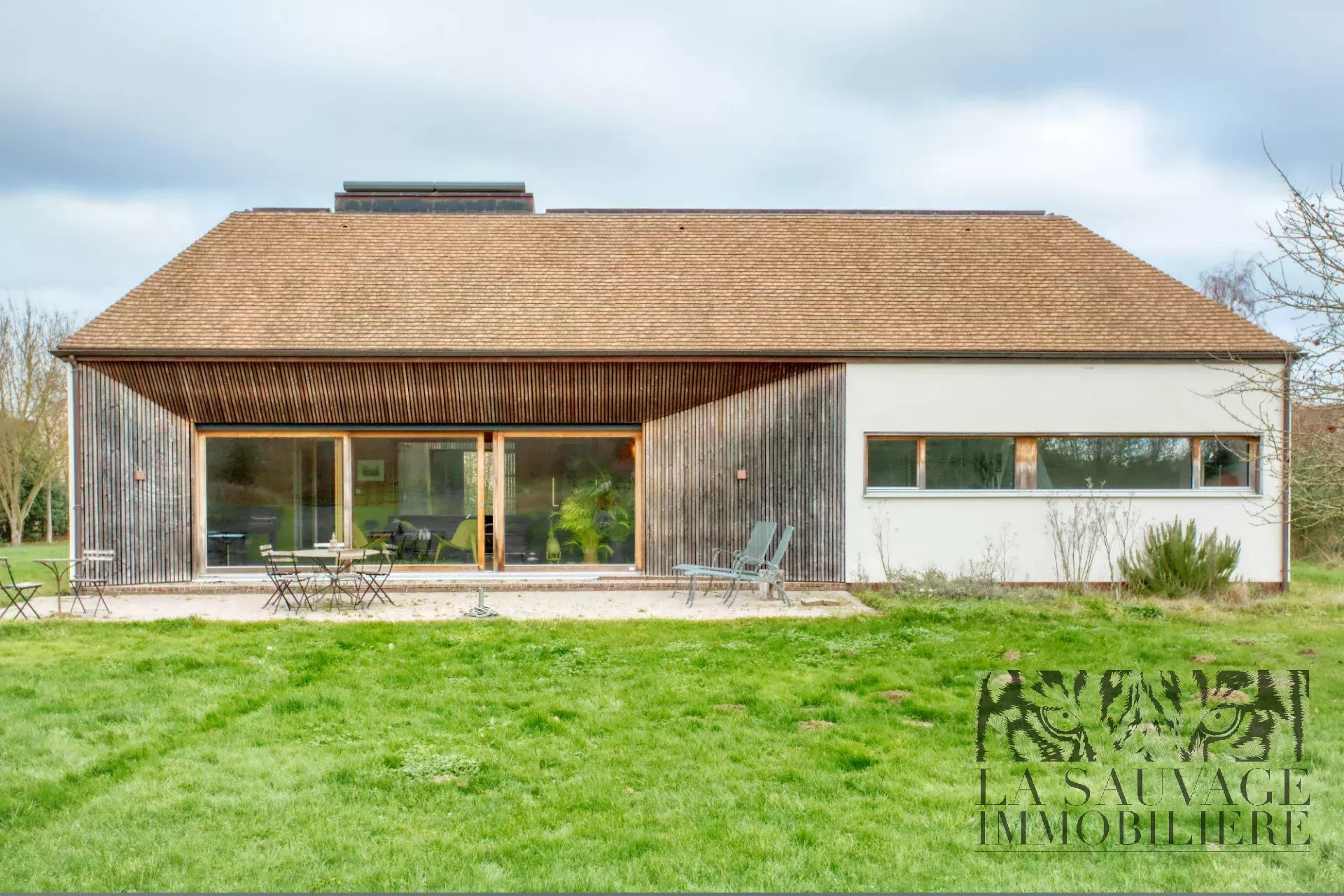 Implantée au sein d’un parc arboré de 4 500 m² avec accès direct à la forêt, la maison développe 167 m² de plain-pied.