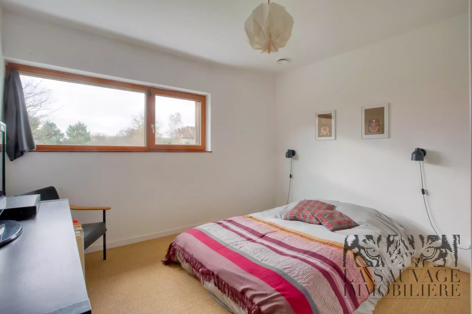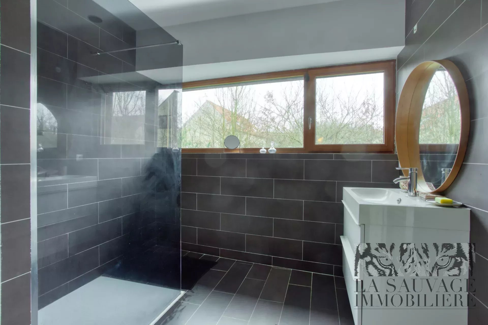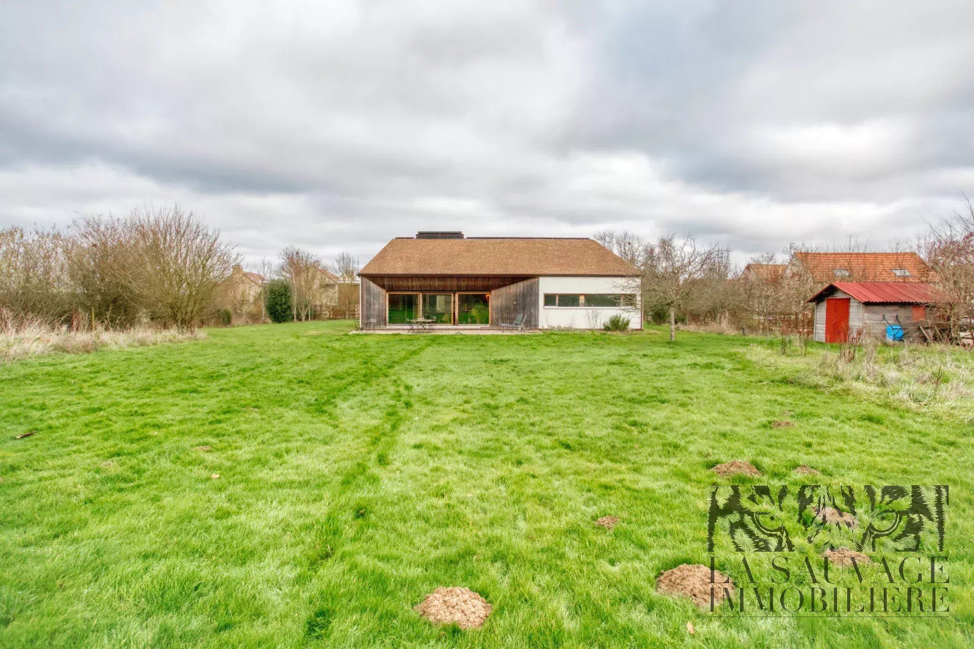 Implantée au sein d’un parc arboré de 4 500 m² avec accès direct à la forêt, la maison développe 167 m² de plain-pied.