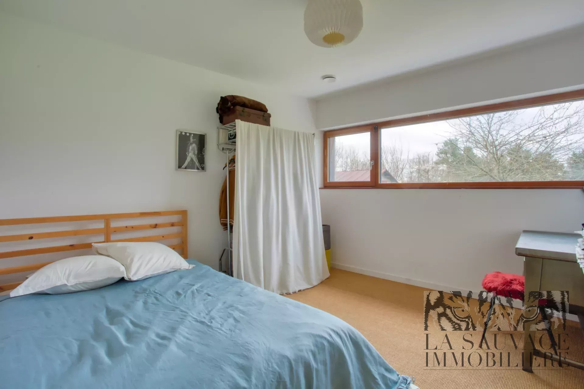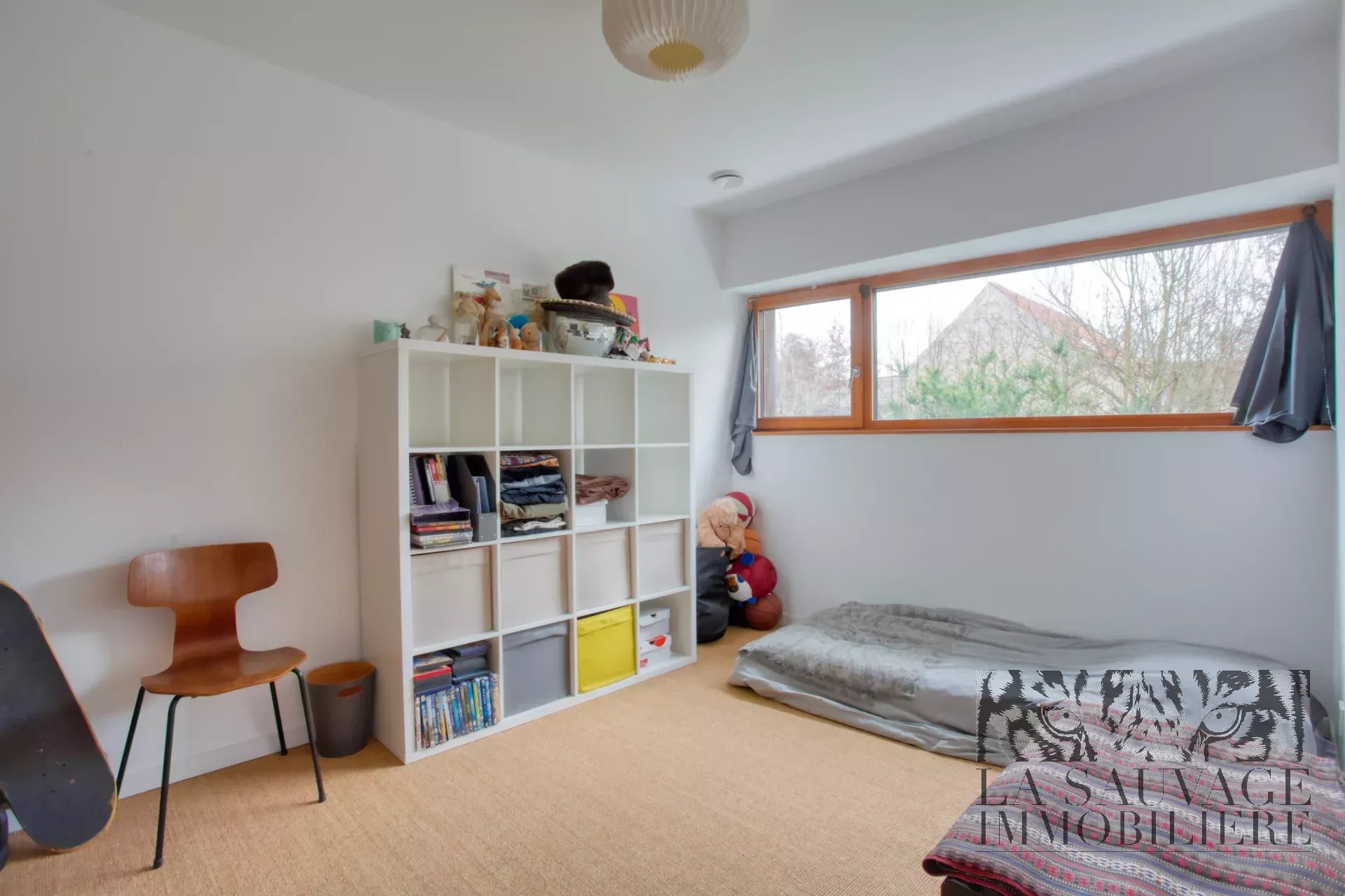 Les combles offrent un volume de stockage conséquent, et un local à vélos complète l’ensemble.