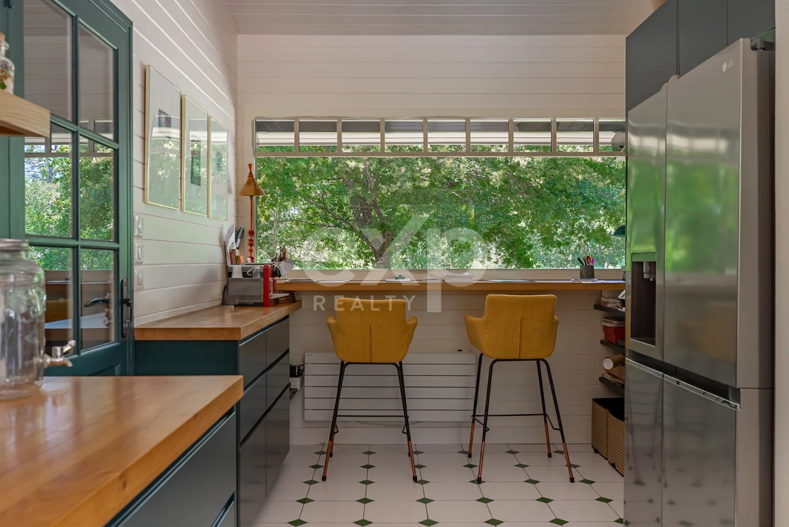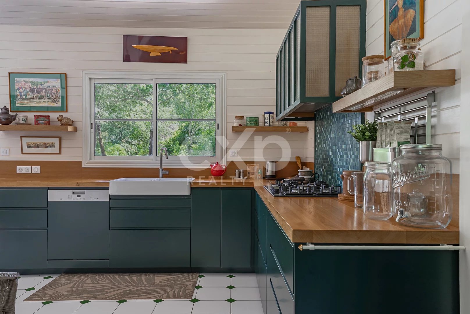 Signée par La Résinière, entreprise de Claude Daquin, constructeur reconnu pour son exigence et son savoir-faire, cette maison en bois haut de gamme s’inspire du style lando-basquais traditionnel. Son élégante silhouette se distingue par ses lignes sobres et contemporaines, son bardage chaleureux et ses finitions vert réséda qui lui confèrent un charme singulier, en parfaite harmonie avec son environnement.