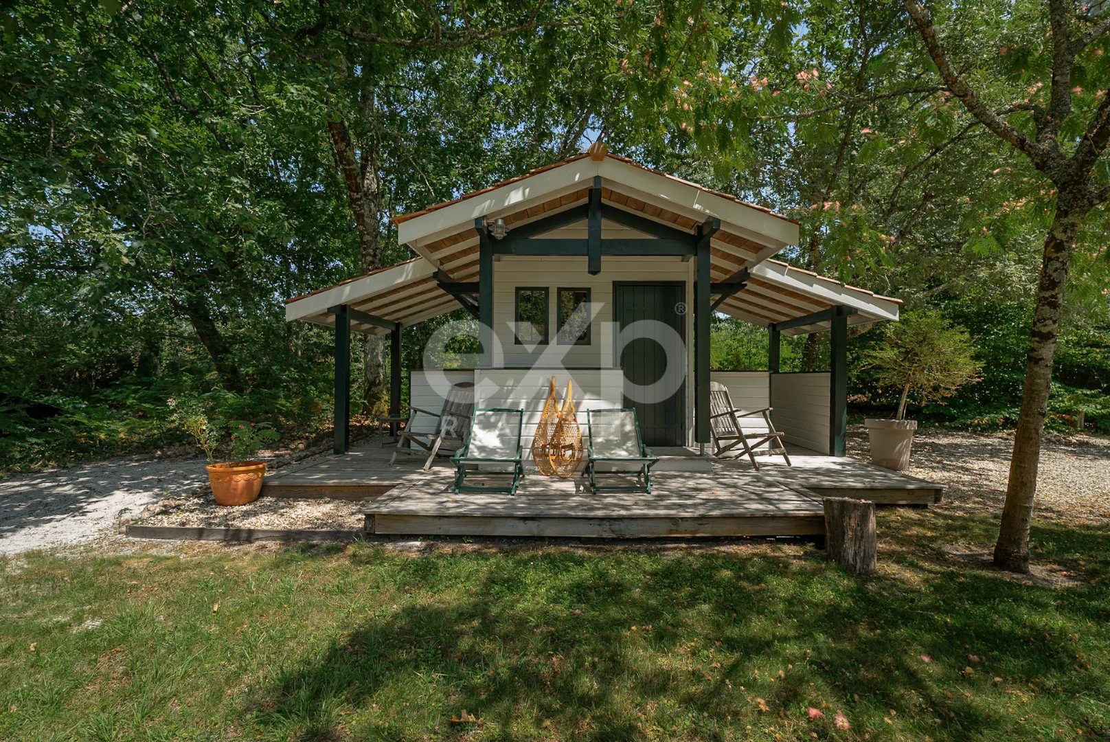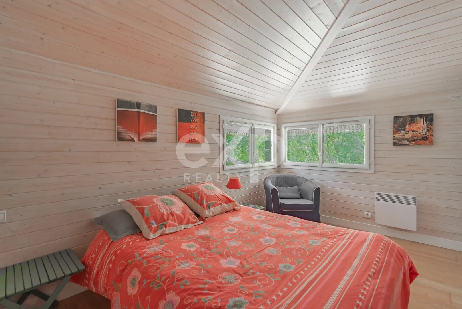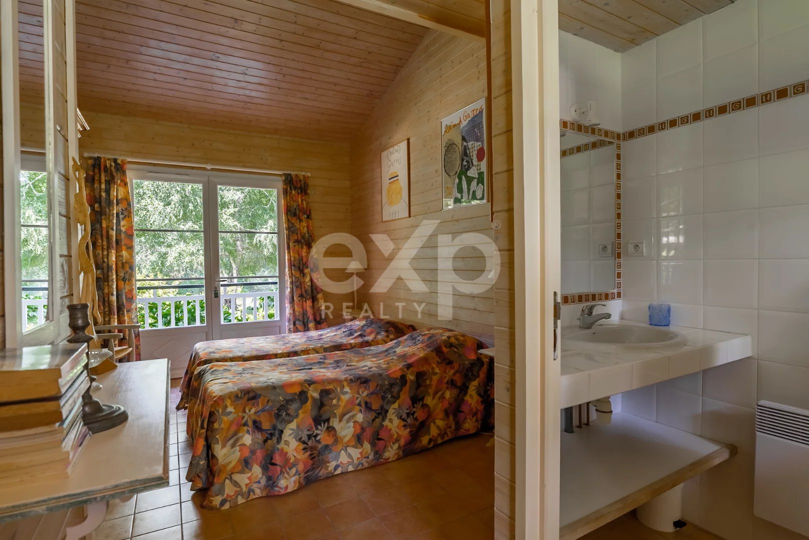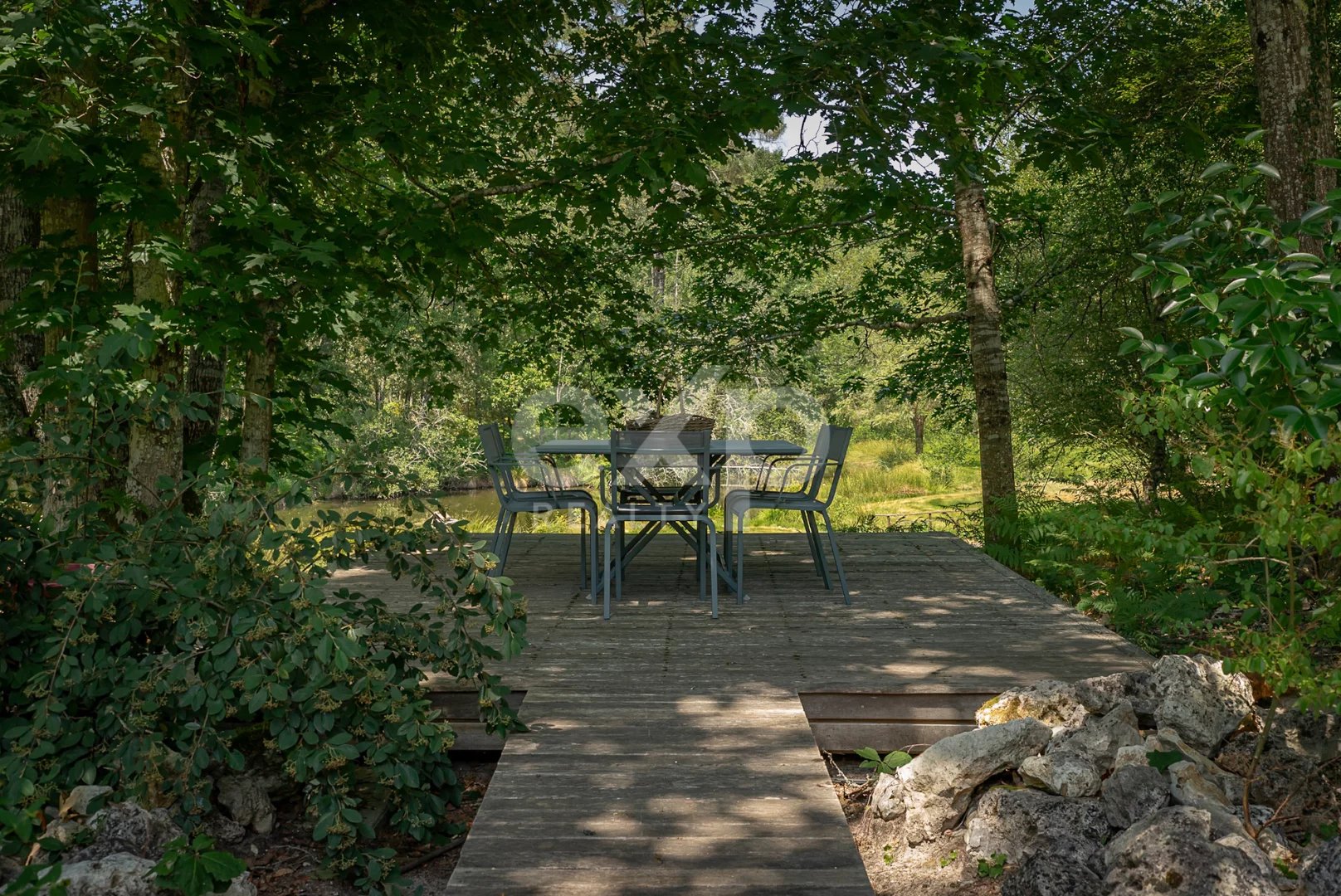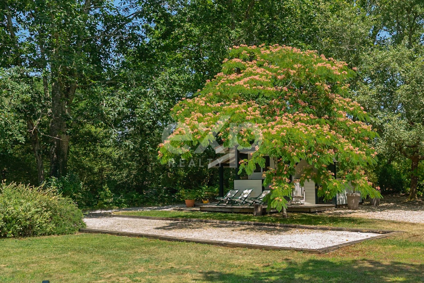 À l’extérieur, la piscine chauffée au sel s’accompagne d’une cuisine d’été et d’une vaste terrasse couverte, idéale pour recevoir en toute saison. Plus loin, sous une tonnelle végétale, un espace repas se déploie face à l’étang, pour des déjeuners à l’ombre ou des soirées conviviales au rythme d’une partie de pétanque sur le boulodrome aménagé. Une charmante maisonnette en bois, véritable écho miniature de la résidence principale, vient parfaire cet ensemble. Un garage indépendant, à l’entrée de la propriété complète également les prestations extérieures.