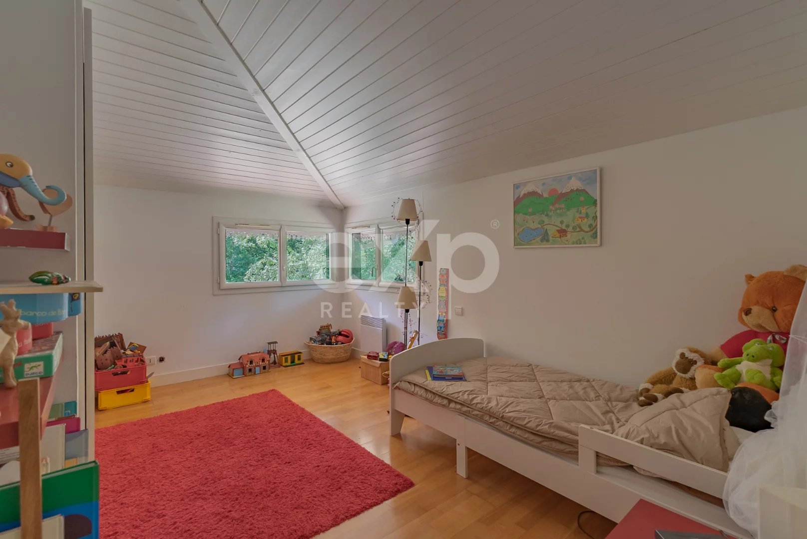 À l’étage, les volumes se répartissent en deux espaces distincts. D’un côté, deux jolies chambres partagent une salle d’eau et des toilettes indépendantes. De l’autre côté, une remarquable suite parentale s’étend sur toute la largeur avec un double dressing et une salle d’eau privative. Un espace à la fois intime et ouvert sur la nature environnante.