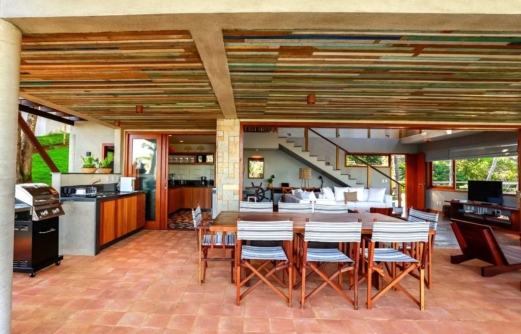 Au rez-de-chaussée, le salon, avec ses hauts plafonds et sa ventilation transversale, communique harmonieusement avec un balcon gourmet et une cuisine. Des portes coulissantes s'ouvrent pour fusionner les espaces intérieurs et extérieurs, dont un balcon couvert et une terrasse surplombant l'océan.