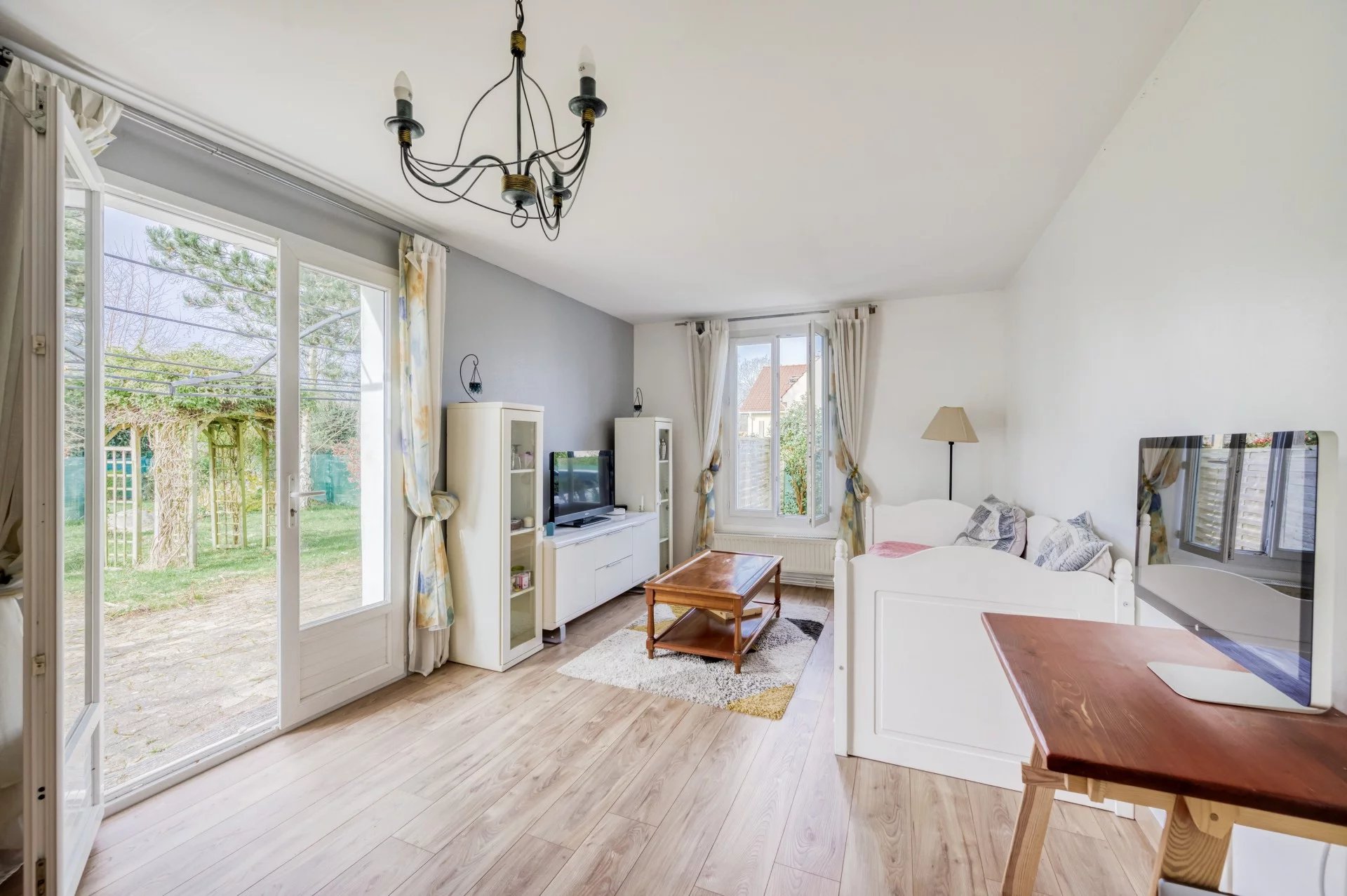 Dès l'entrée, au RDC on découvre une cuisine bien ensoleillée le matin équipée et aménagée, un salon baigné de lumière donnant sur une terrasse exposition plein Sud qui invite à profiter d'un beau jardin paysagé de 600m2 entièrement clôturé,