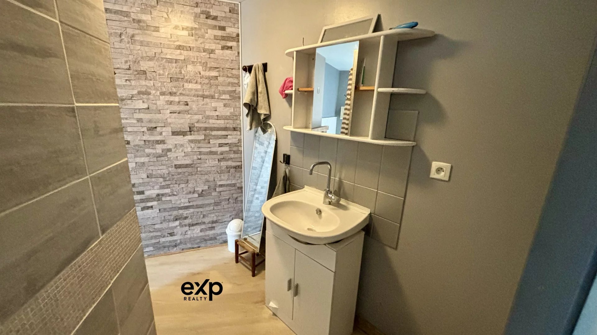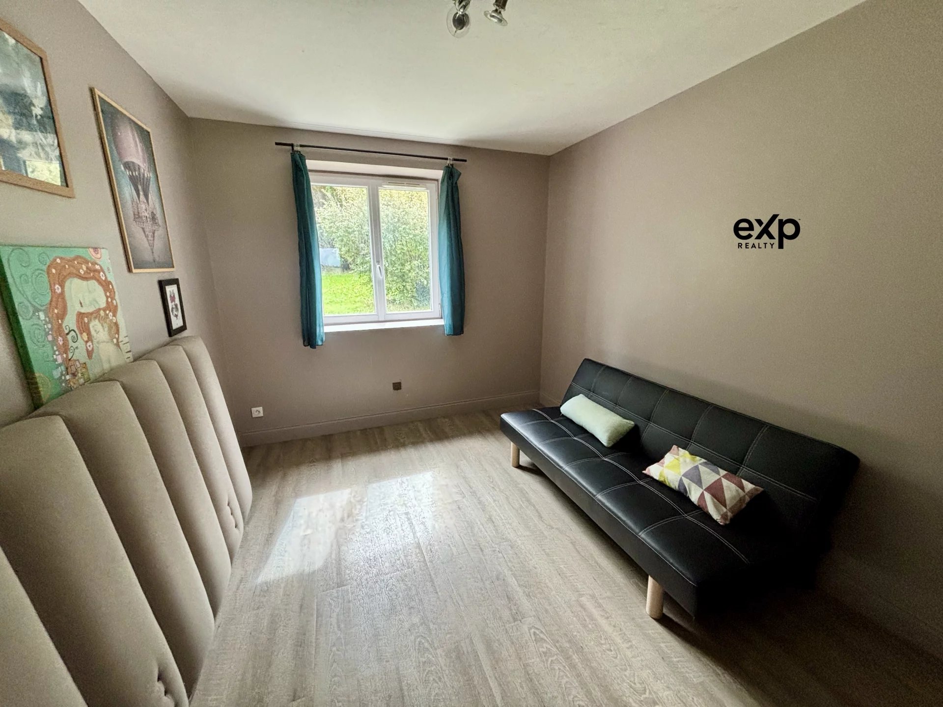 La maison, d'une surface habitable de 115 m² vous offre au rez-de-chaussée une entrée, un grand salon/séjour avec un beau poêle à bois installer par Aäsgard, une cuisine équipe, une cave, un couloir, une chambre, une salle d'eau et un WC.
