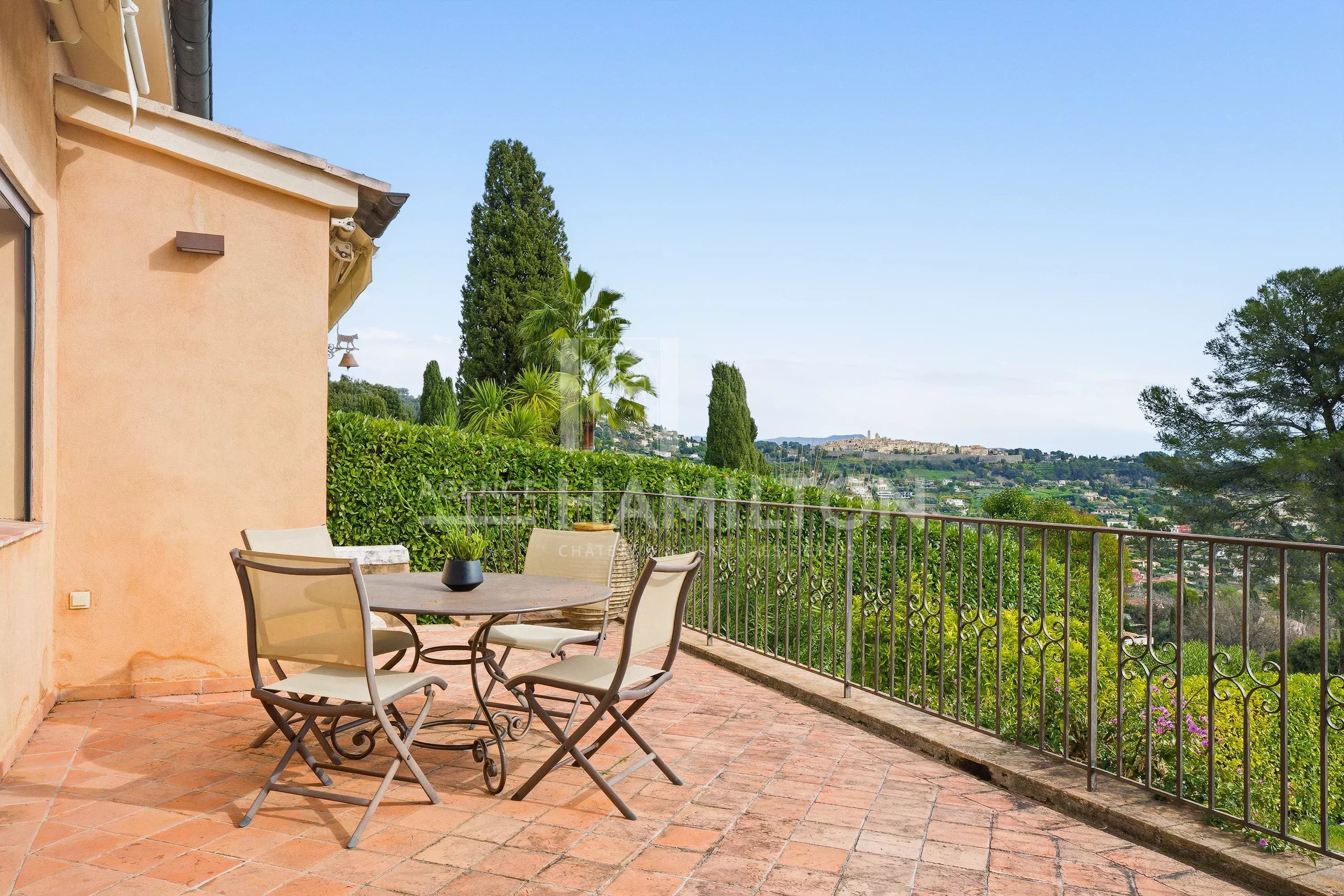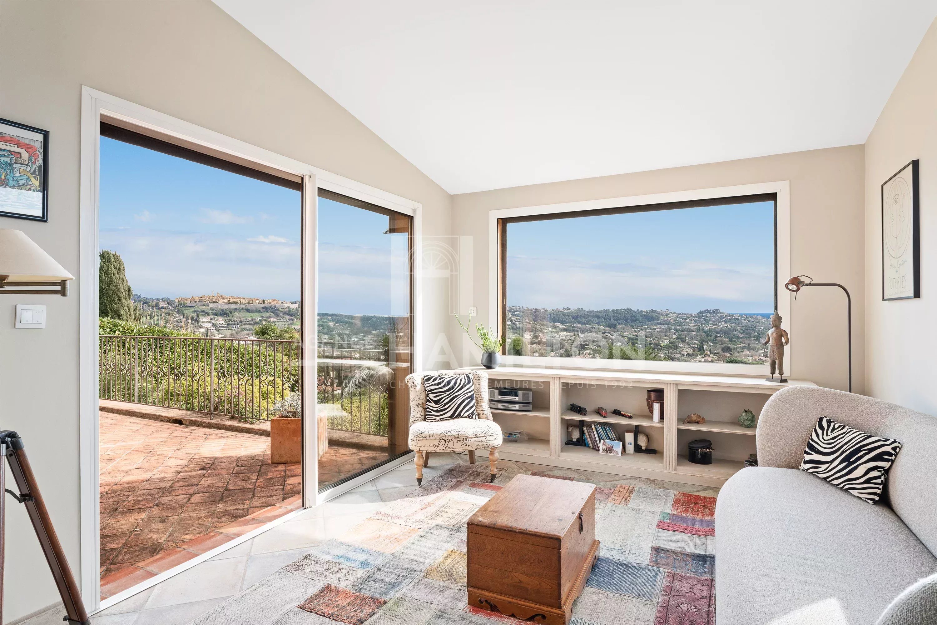 Baignées de lumière naturelle tout au long de la journée, les pièces bénéficient de larges baies vitrées offrant des vues panoramiques exceptionnelles sur la mer Méditerranée et le célèbre village médiéval de Saint-Paul-de-Vence.