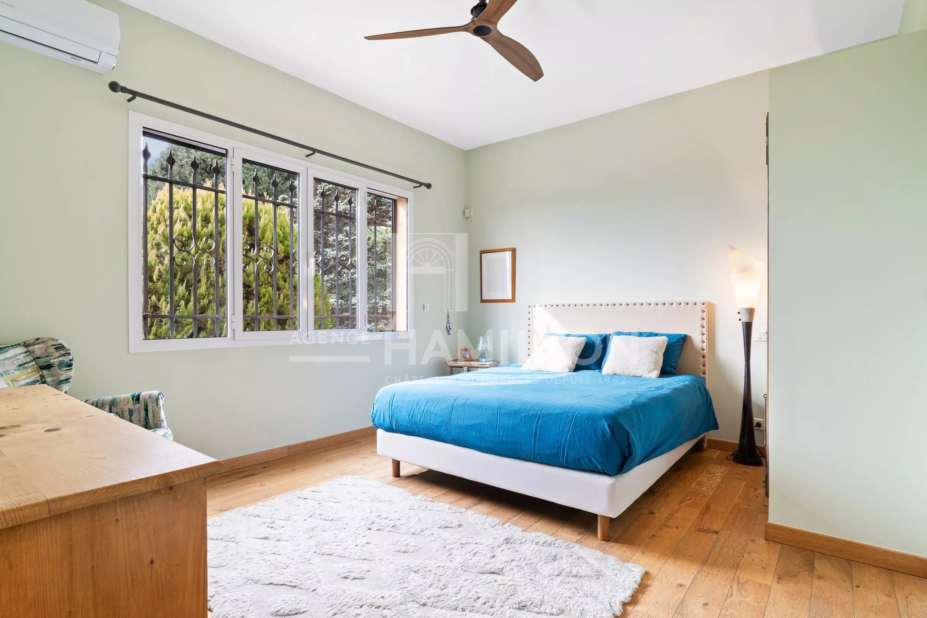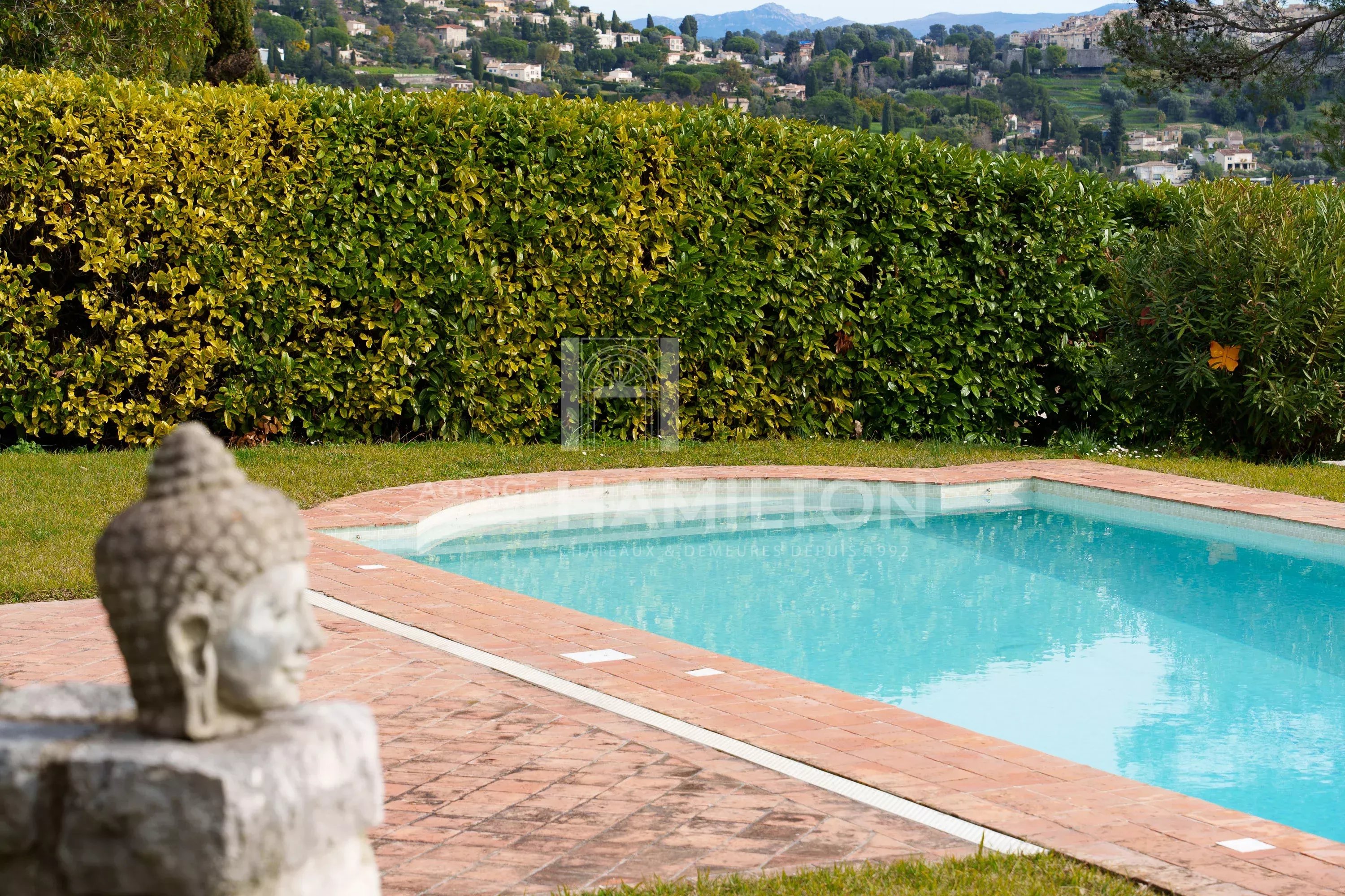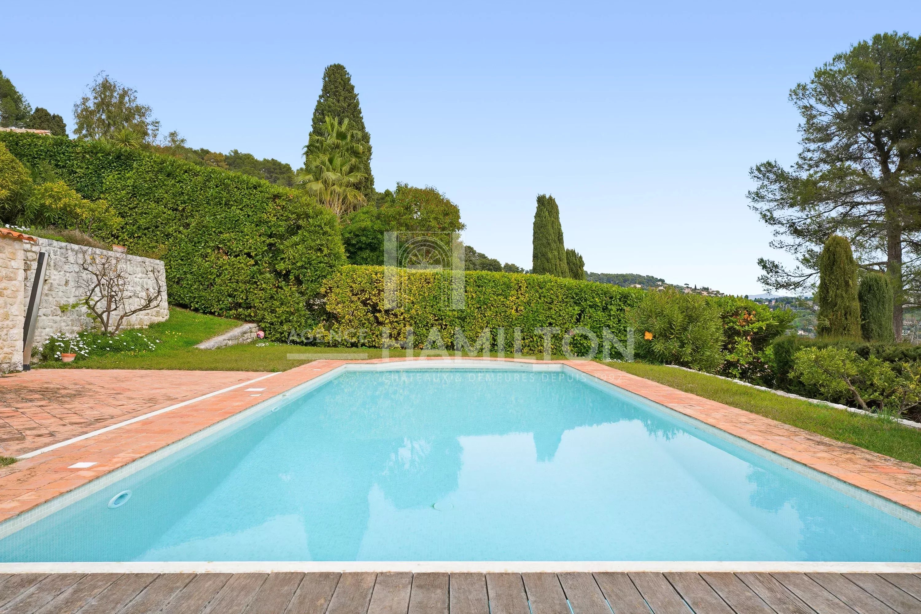 La propriété est implantée sur un terrain paysager de 1 850 m², soigneusement aménagé avec des arbres fruitiers et des espaces de détente intimistes. Le jardin, avec sa piscine, son pool house et sa vue sur Saint-Paul-de-Vence, est idéal pour profiter des longues journées d’été sur la Côte d’Azur.