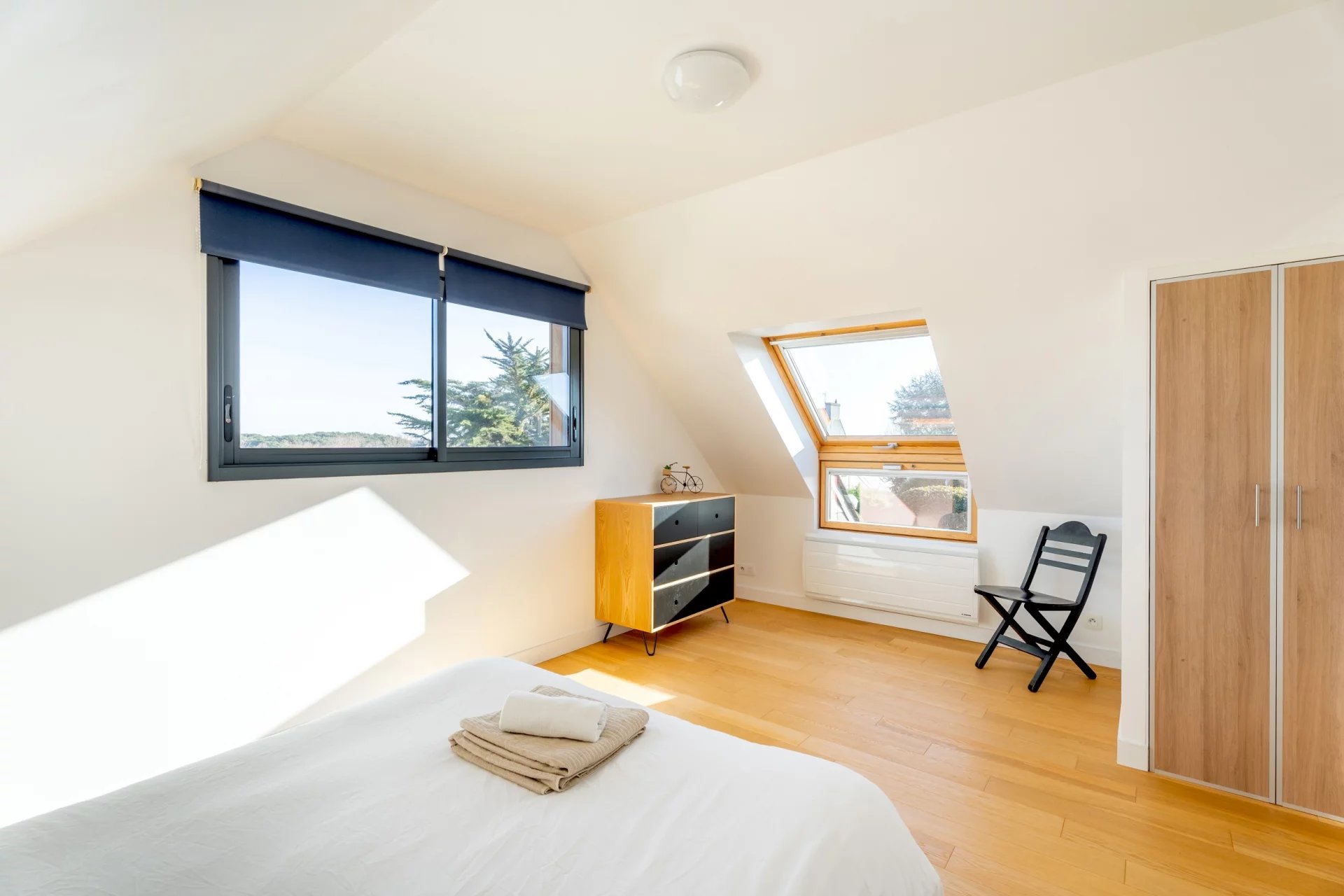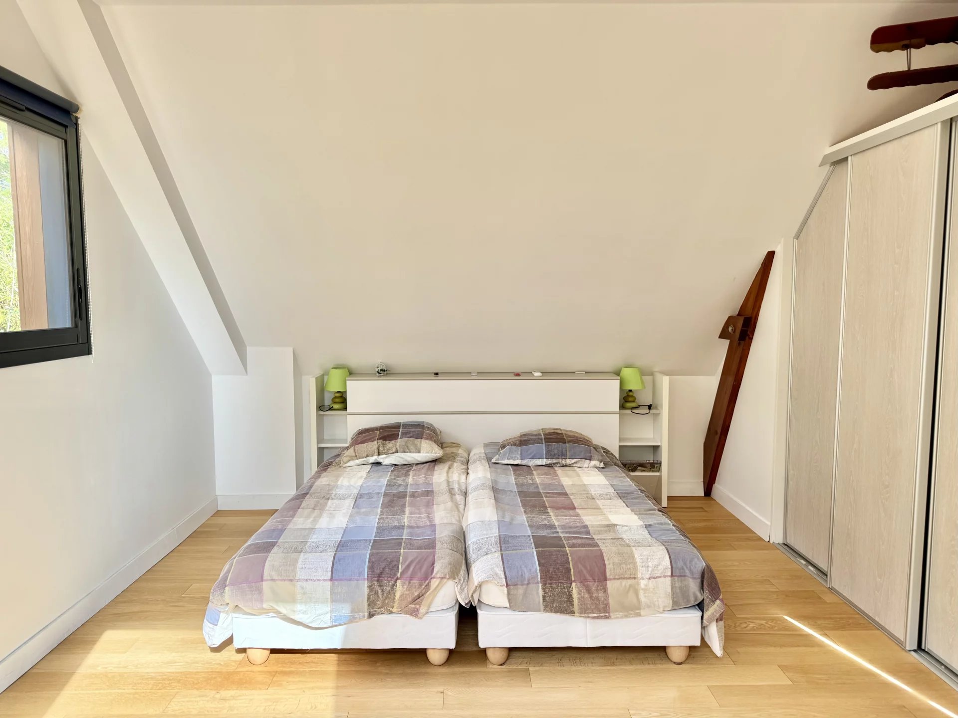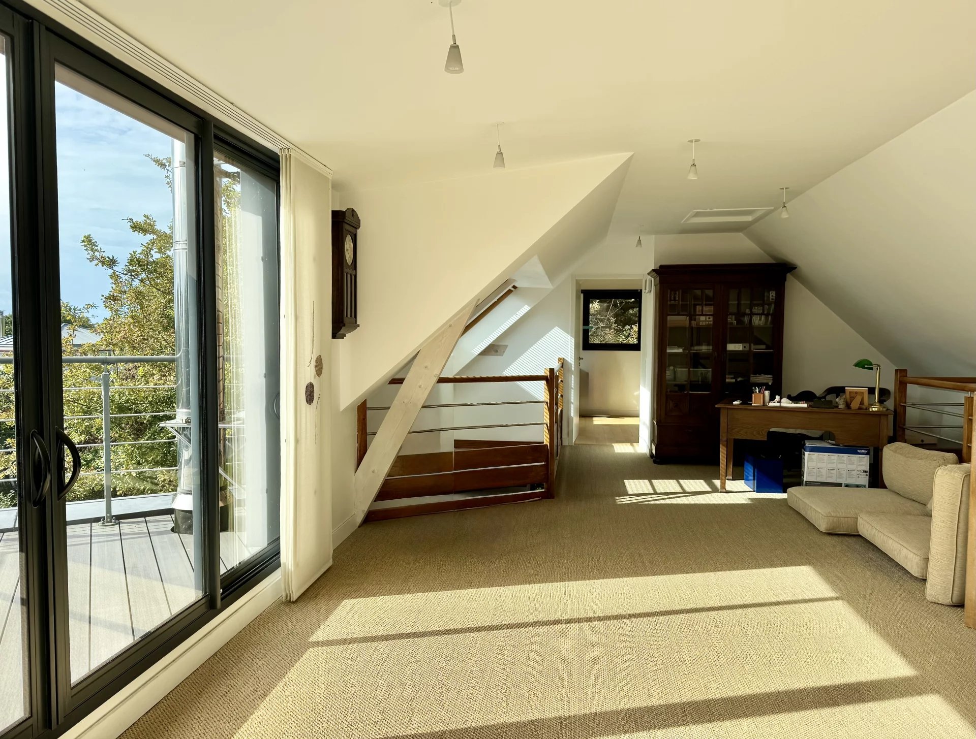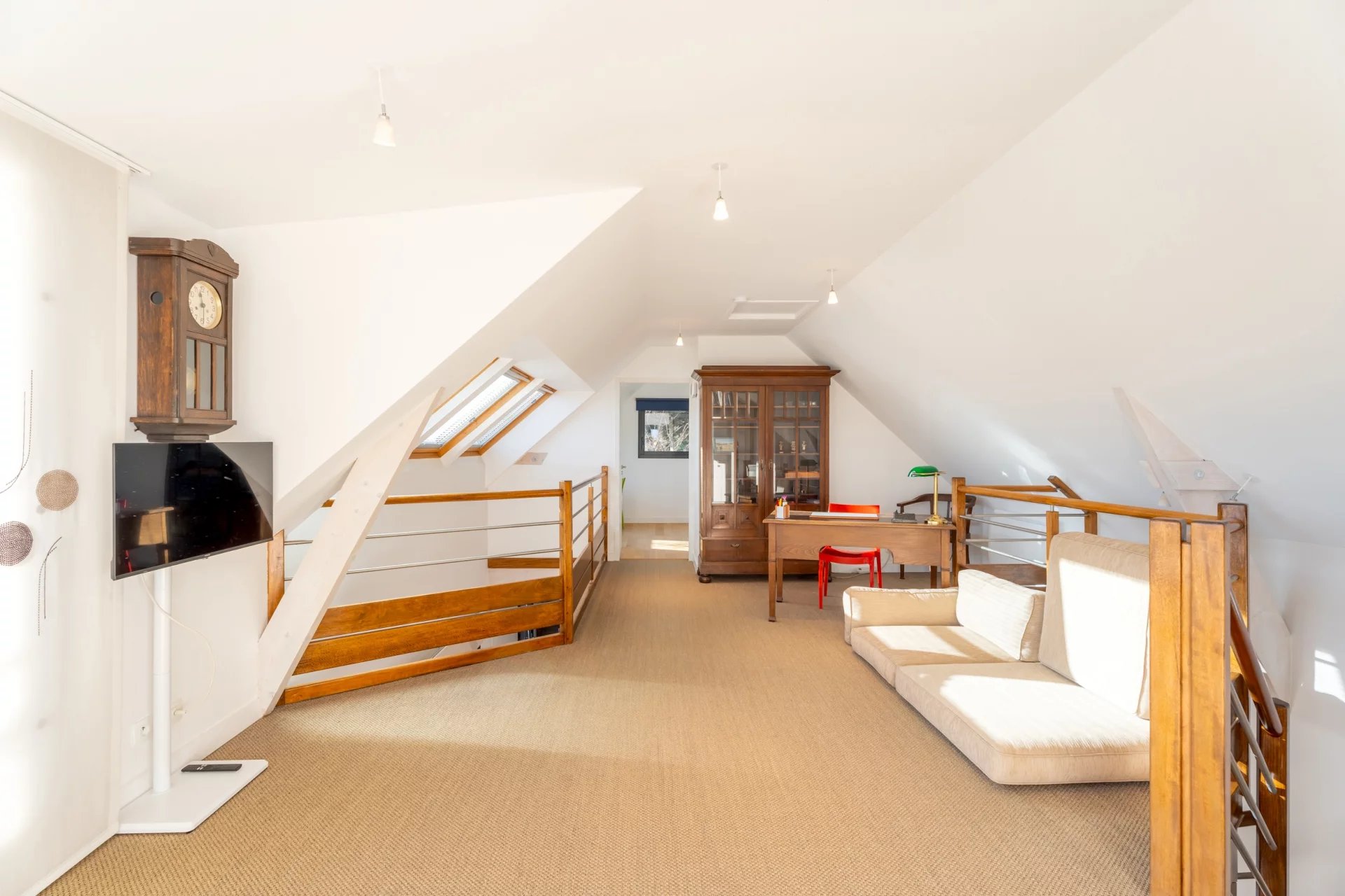 À l’étage, une vaste mezzanine ouverte sur un balcon surplombe le salon et accueille un espace bureau, un salon de lecture ou des couchages supplémentaires. Deux chambres lumineuses agrémentées de rangements, une salle d’eau et des toilettes séparées complètent cet espace nuit.
