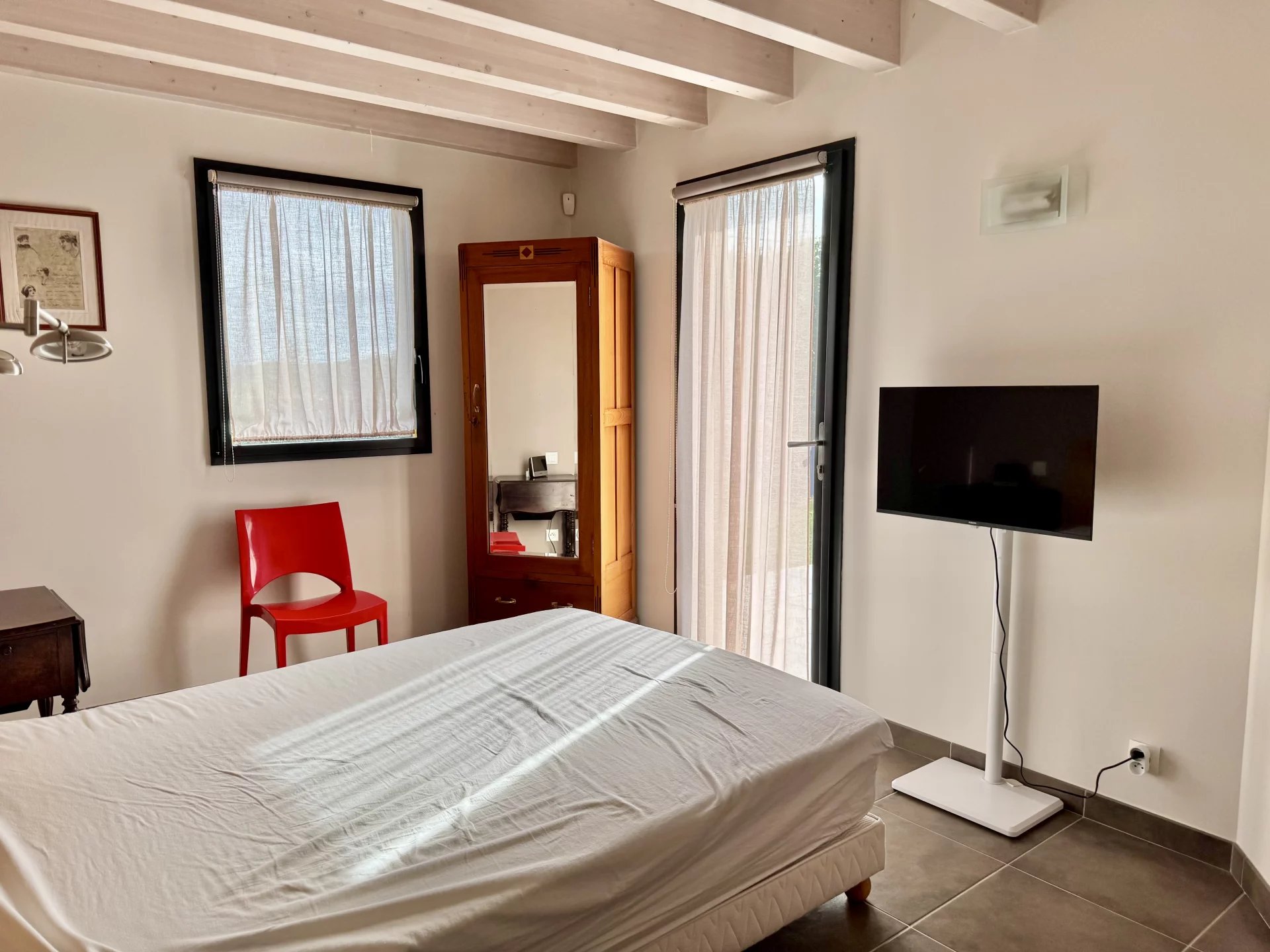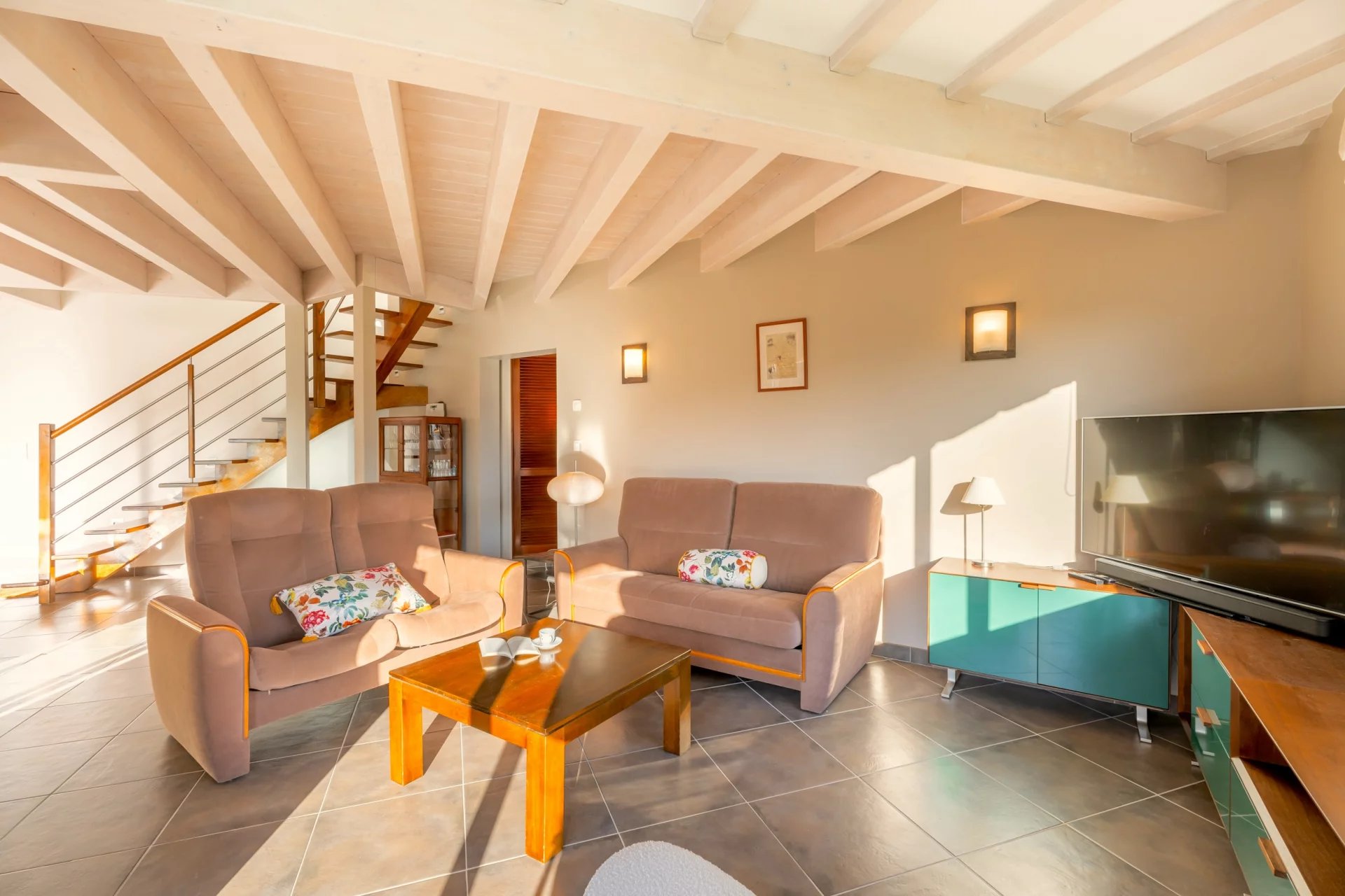 Passé l’entrée, un salon-séjour aux volumes généreux se dévoile, baigné de lumière naturelle grâce à de larges ouvertures donnant sur une vaste terrasse exposée plein sud.