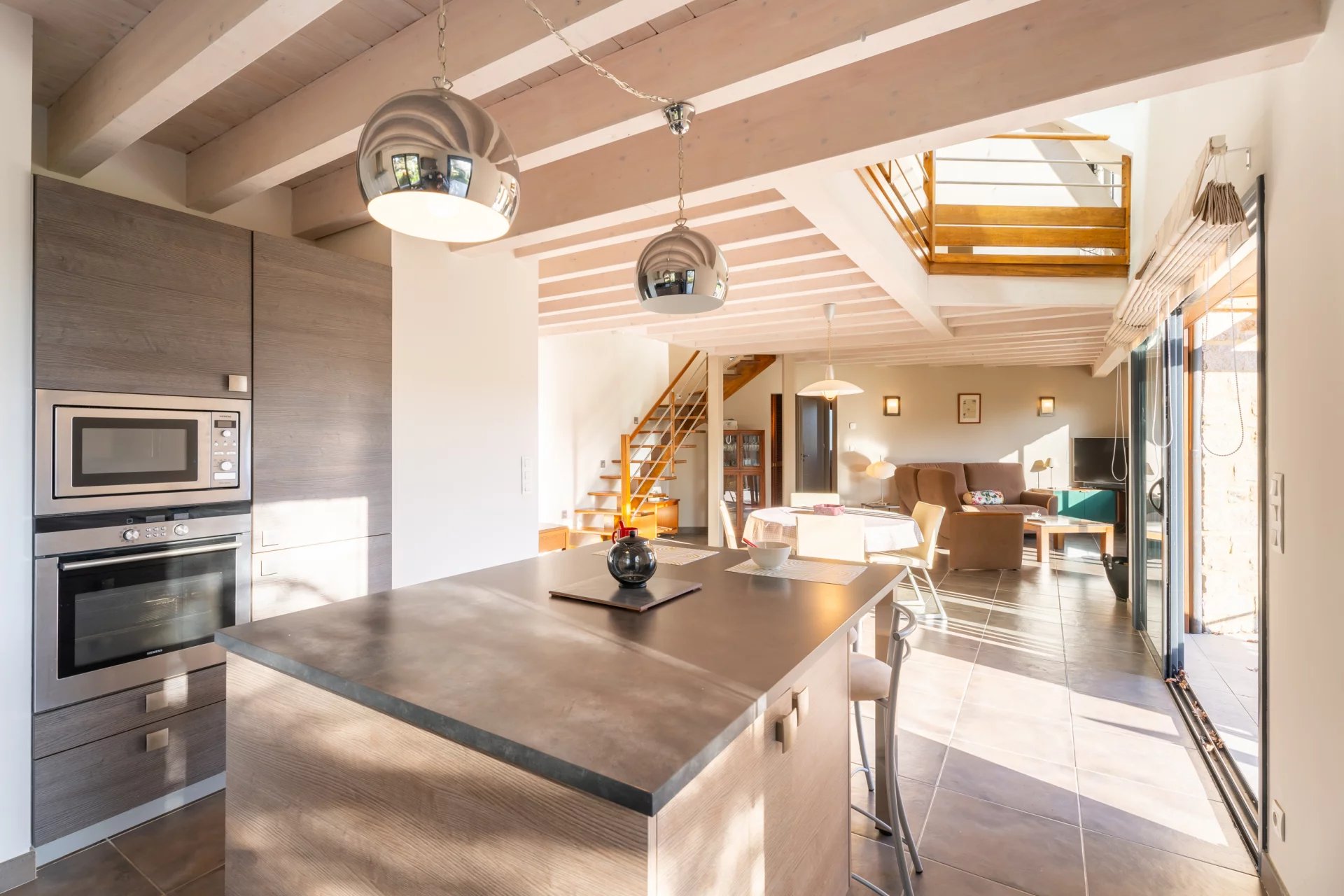 La cuisine ouverte, aux lignes épurées et aux finitions haut de gamme, prolonge cet espace de vie avec raffinement. Elle est complétée par une arrière-cuisine discrète et fonctionnelle.