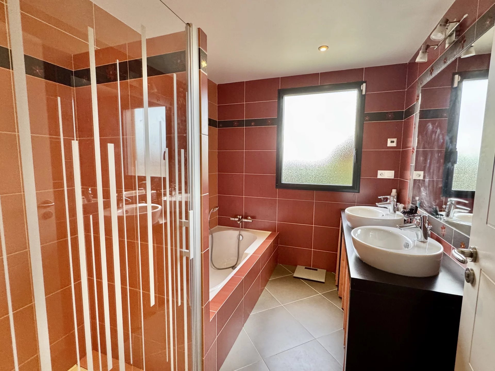 Une belle suite parentale, avec accès direct à la terrasse dispose de rangements, d’une salle de bains privative fonctionnelle, alliant douche, baignoire, double vasque et de toilettes séparées.