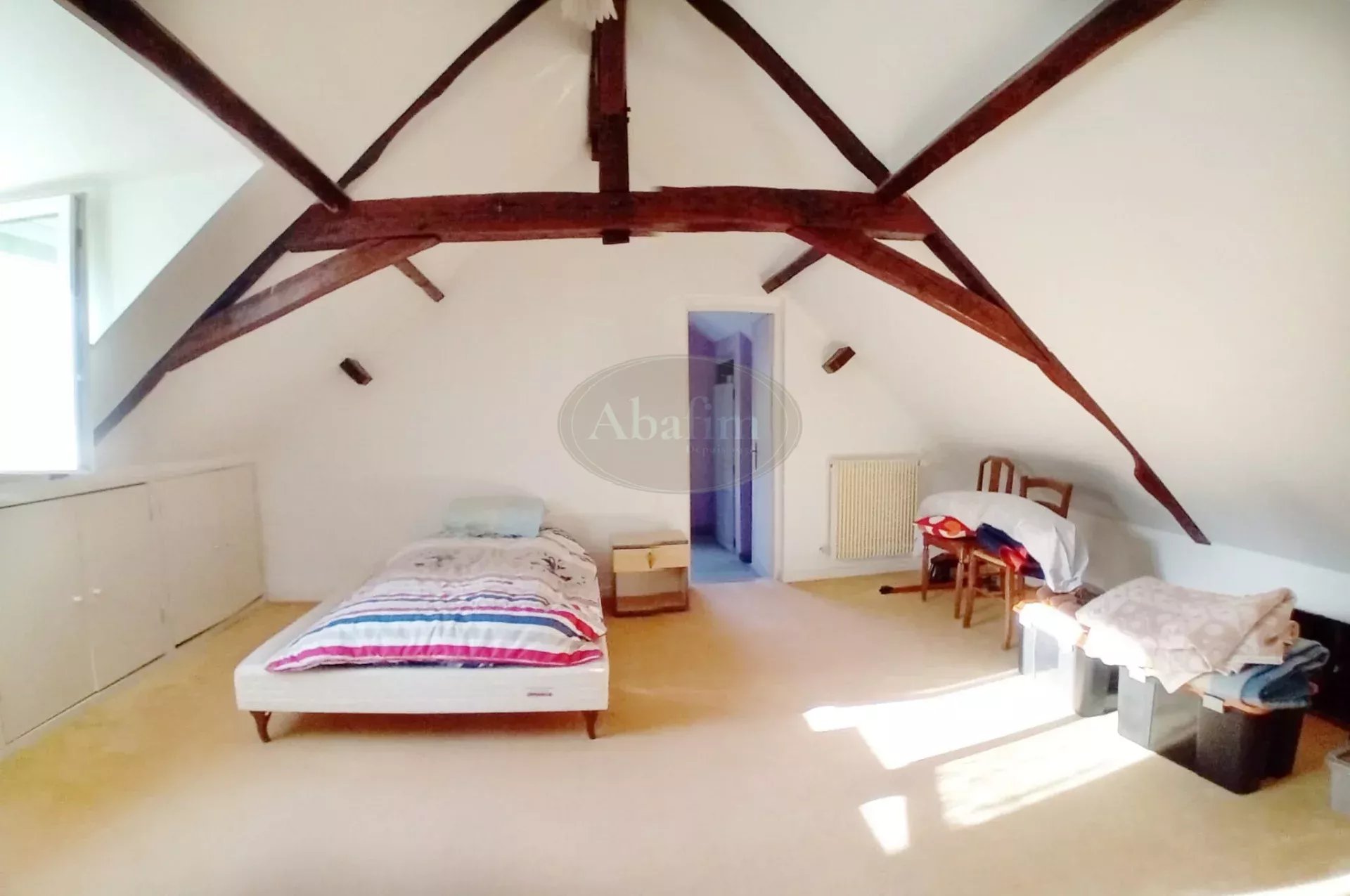 Côté équipements, la maison est chauffée par une chaudière Wiessmann au fioul avec production d’eau chaude, et complétée par une cheminée à foyer ouvert. La toiture est en tuiles, la charpente traditionnelle, les menuiseries sont en PVC double vitrage, sauf dans la cuisine où subsiste une fenêtre en bois simple vitrage. L’assainissement est individuel par fosse septique.