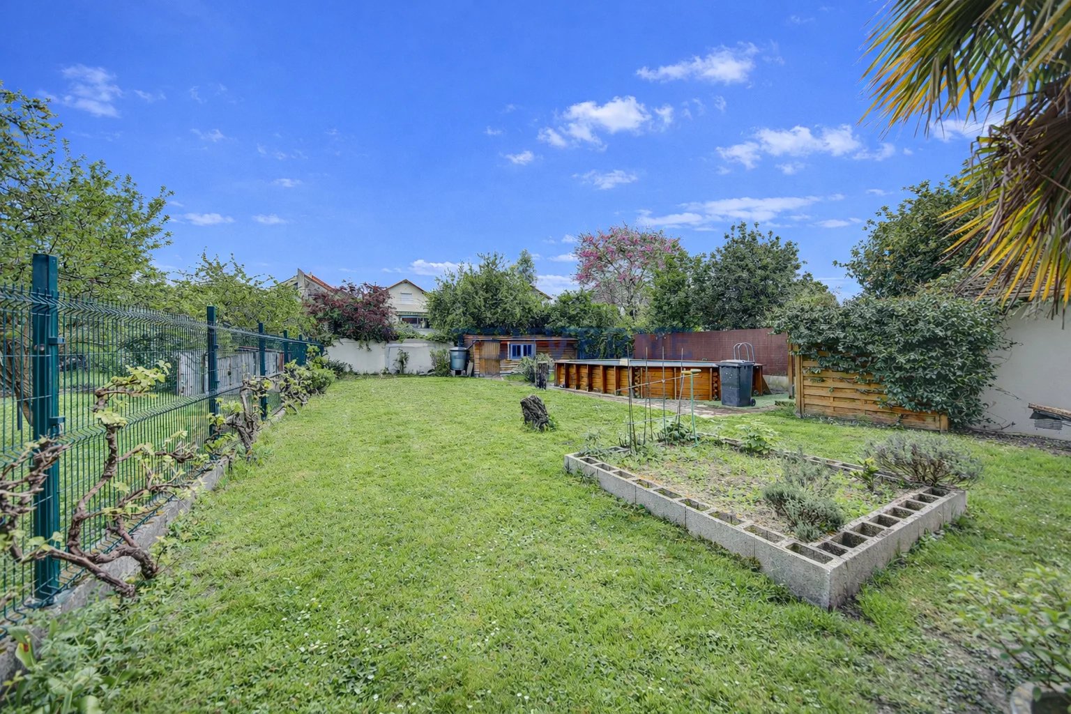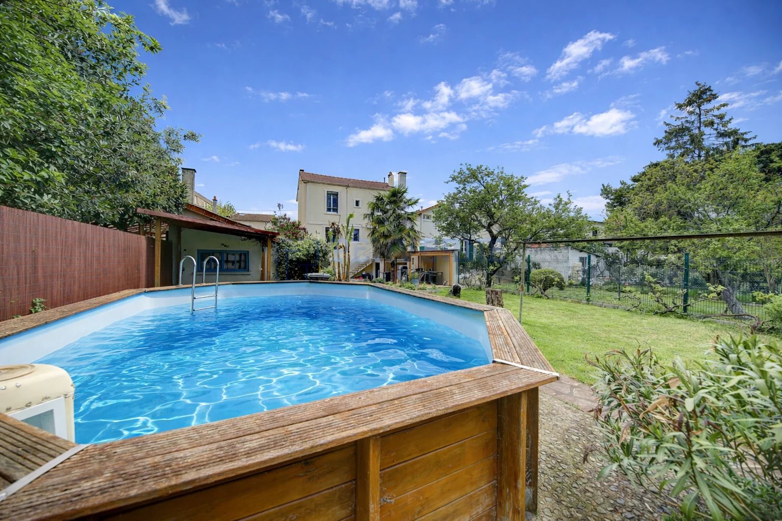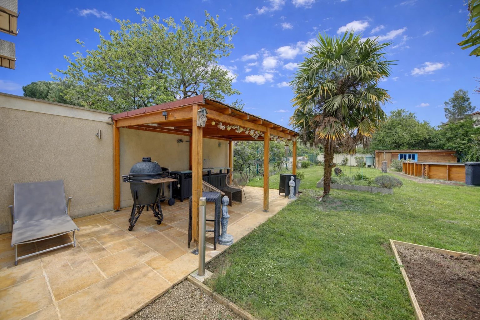 Dans le jardin paysagé, vous profiterez d’une cuisine d’été sous pergola avec espace barbecue, d’un grand cabanon de jardin permettant le stockage des outils, d’une piscine hors-sol (liner à prévoir) ainsi que d’un garage avec porte motorisée.