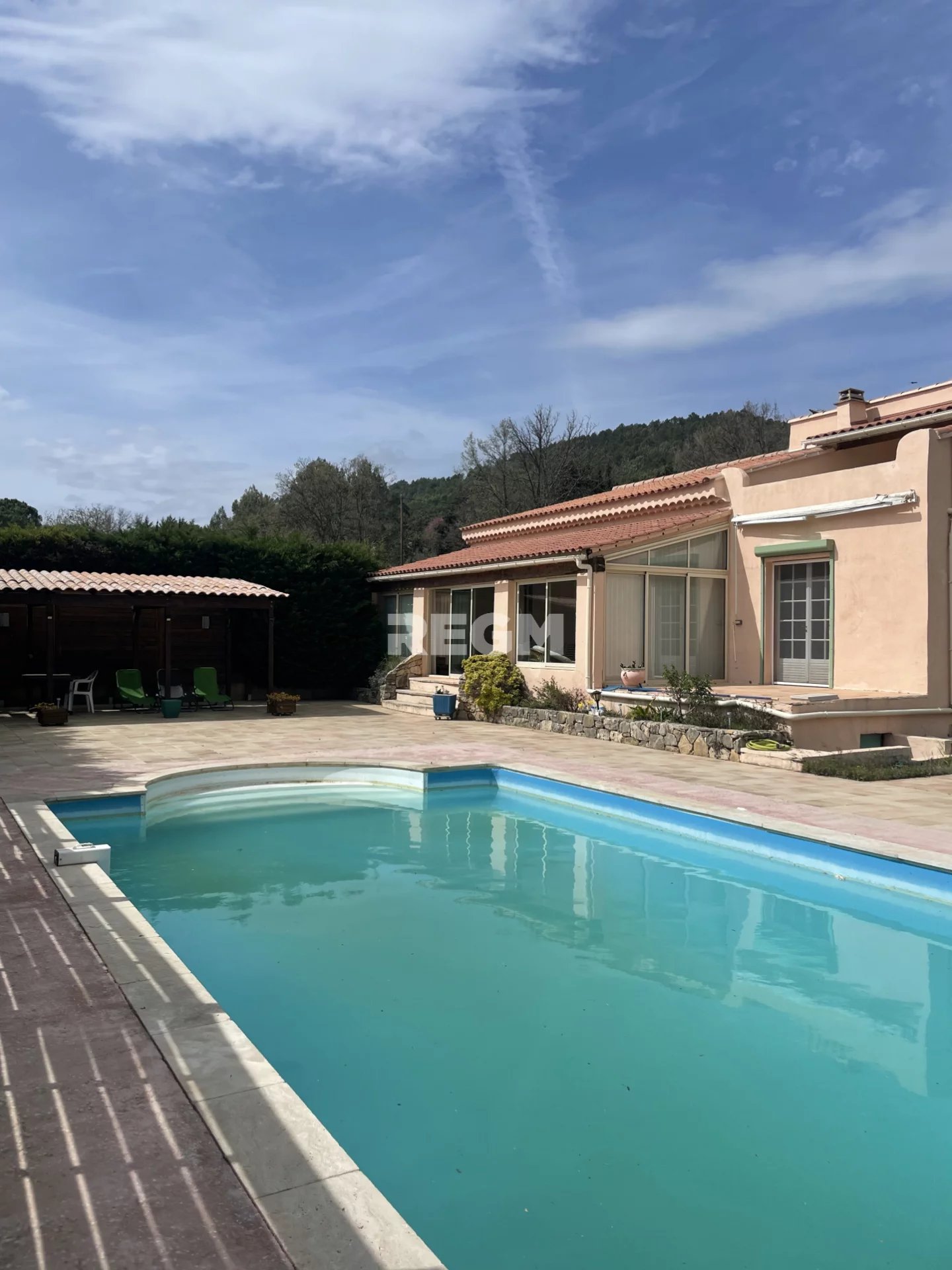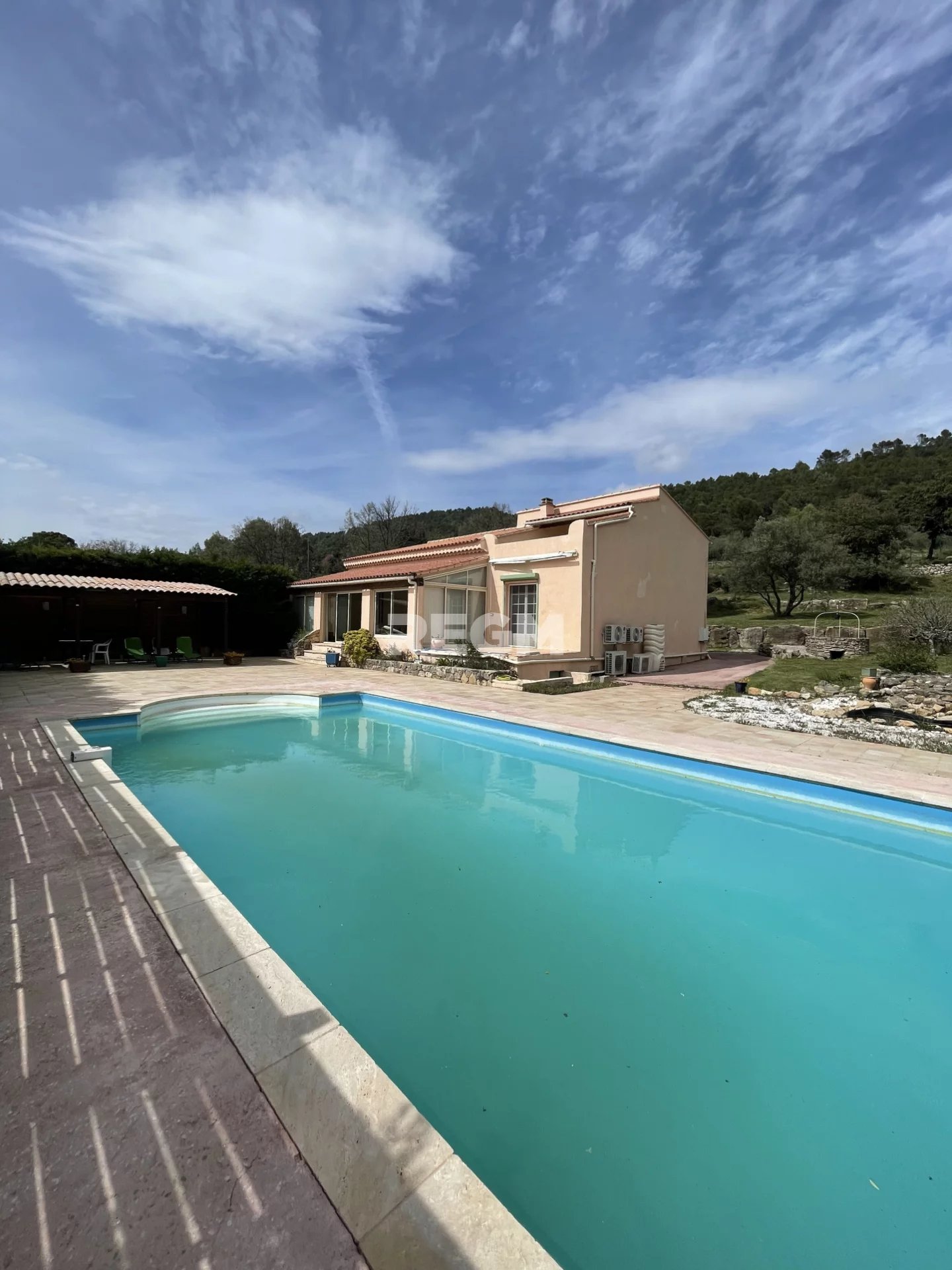 A vendre, Villa T7, érigée sur deux niveaux, sise sur une parcelle de terrain de 2803M2, avec une piscine chauffée, et munie d'une couverture vitrée télescopique motorisée. la partie habitable se compose de 5 chambres, dont une avec terrasse Tropézienne, sans vis à vis, avec vue panoramique, salon cathédrale, salle à manger, vaste cuisine, 2 salles d'eaux, dressing, vérandas, garage. Le bien est équipé de climatisations réversibles. Située à proximité du petit village de Le Val. Bien à voir absolument.